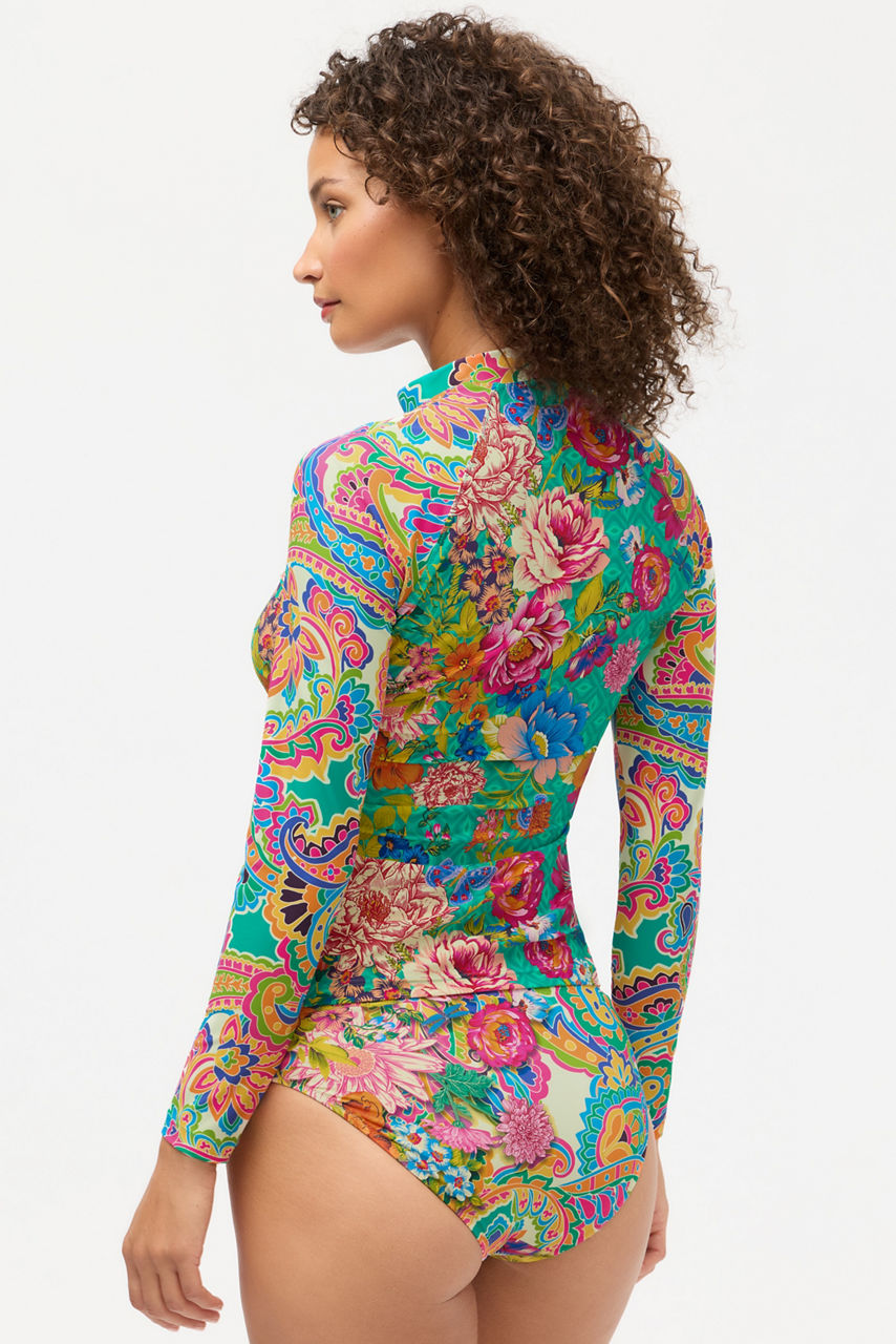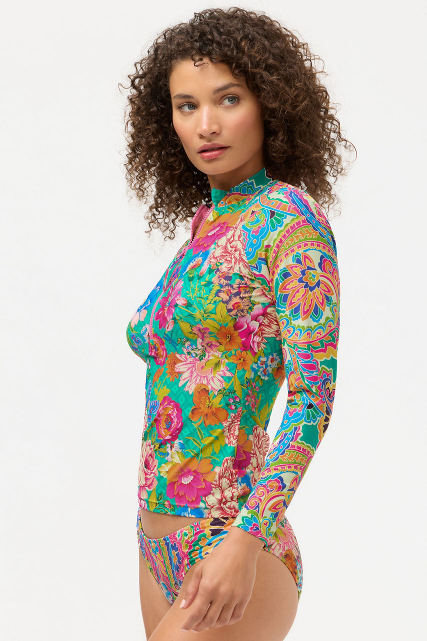 The Sweetspire Long Sleeve Surf Shirt combines bold florals and paisley prints for a lively, sun-ready look. Designed with a functional front zipper and raglan sleeves for ease of movement, it offers both comfort and style for active beach days. Perfect for staying protected and chic from surf to shore.