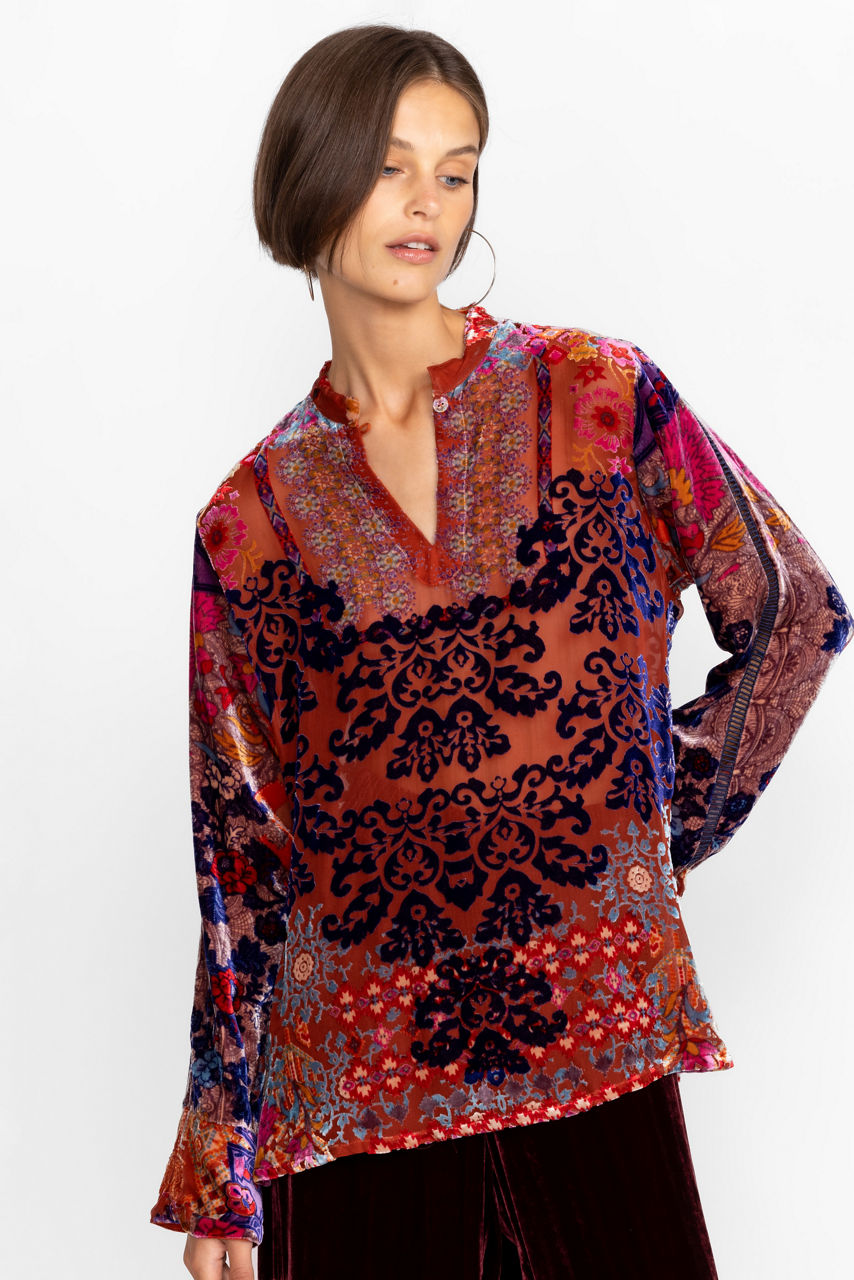 Presenting a beautifully bold patchwork design, the Syriah Burnout Enta Blouse offers a kaleidoscope of texture and color. Crafted from a luxurious silk blend fabric and featuring intricate detailing at the sleeves, this tunic blouse is completed with a loop and button closure at the neckline. Pair with skinny jeans and colorful flats for an elevated casual look.