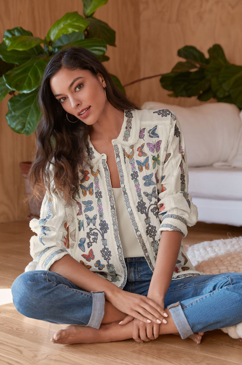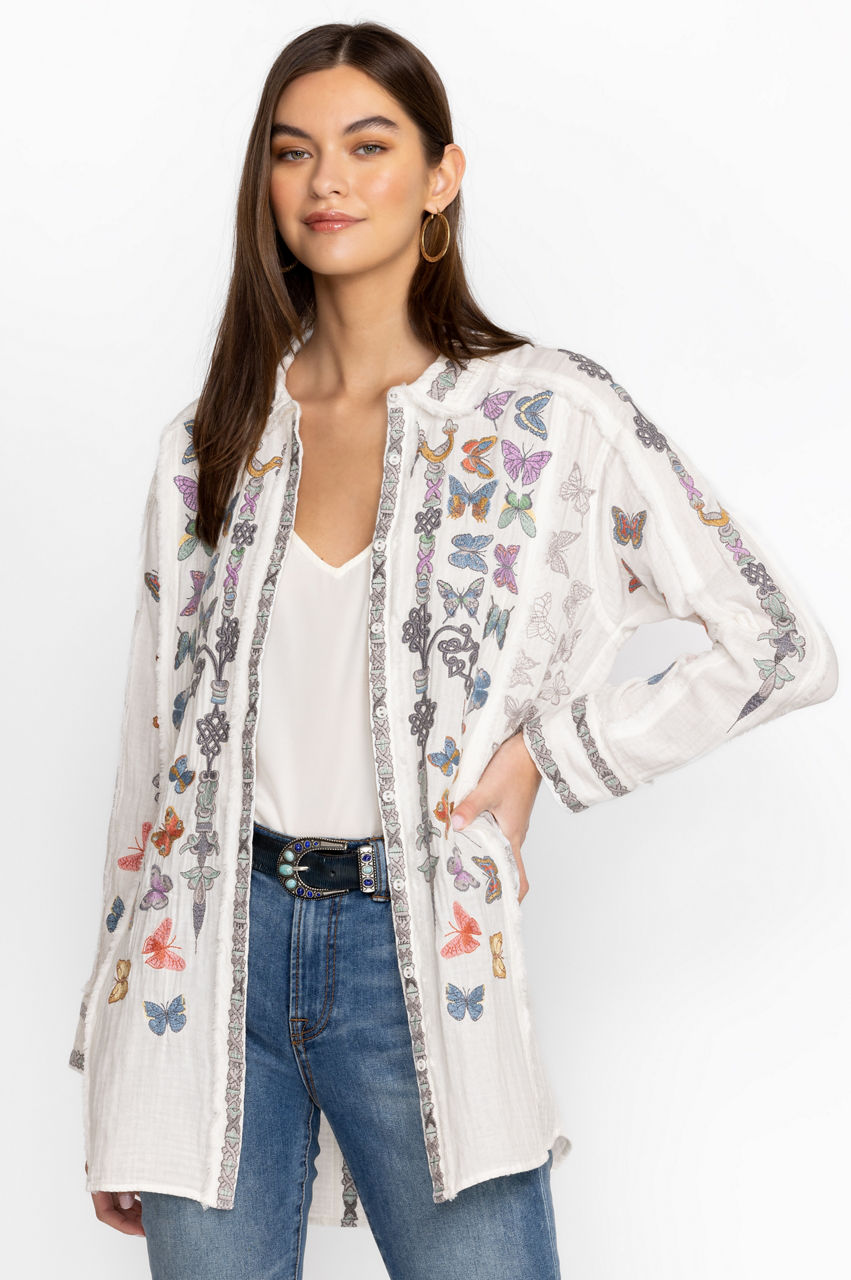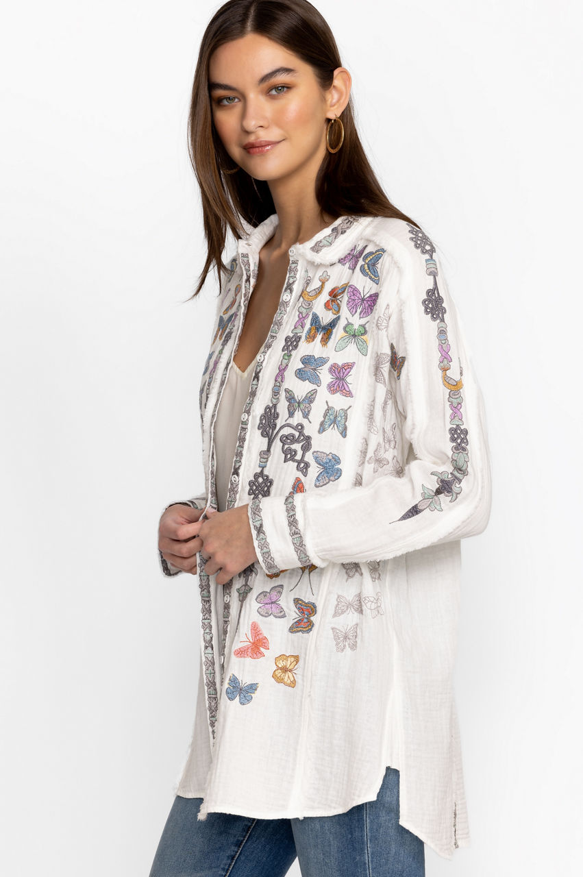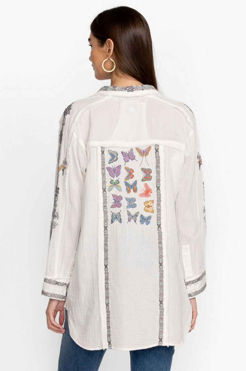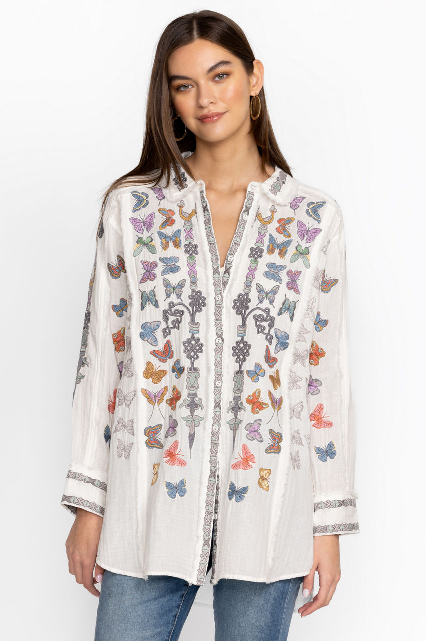 Made from pure cotton, the Talia Tunic turns to the natural world for inspiration. A versatile yet statement-making style, this tunic features a collar, a front button fastening, long sleeves with buttoned cuffs, and a bright placement embroidery comprising fluttering butterfly motifs for a playful finish. Wear with denim or layer over tailored pants for an elevated daytime look.