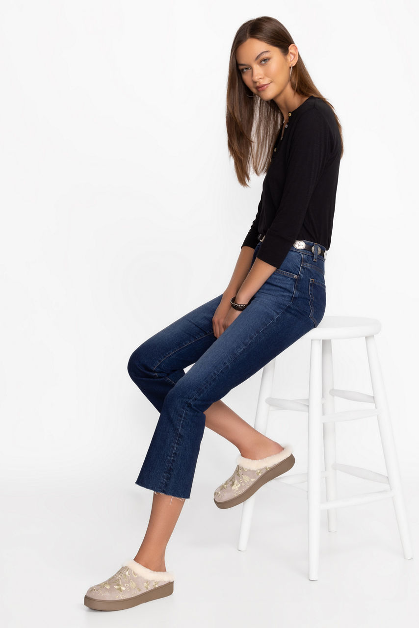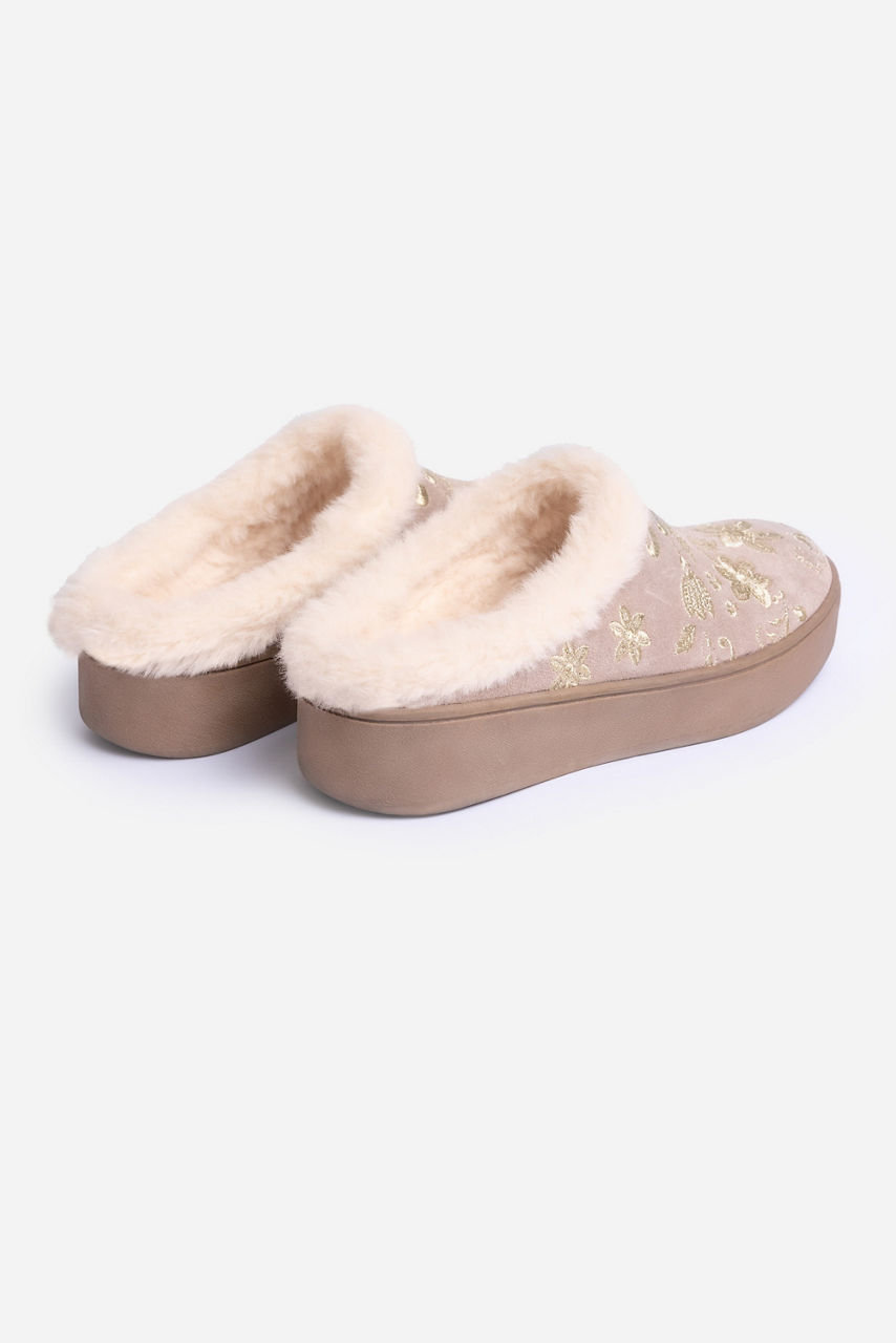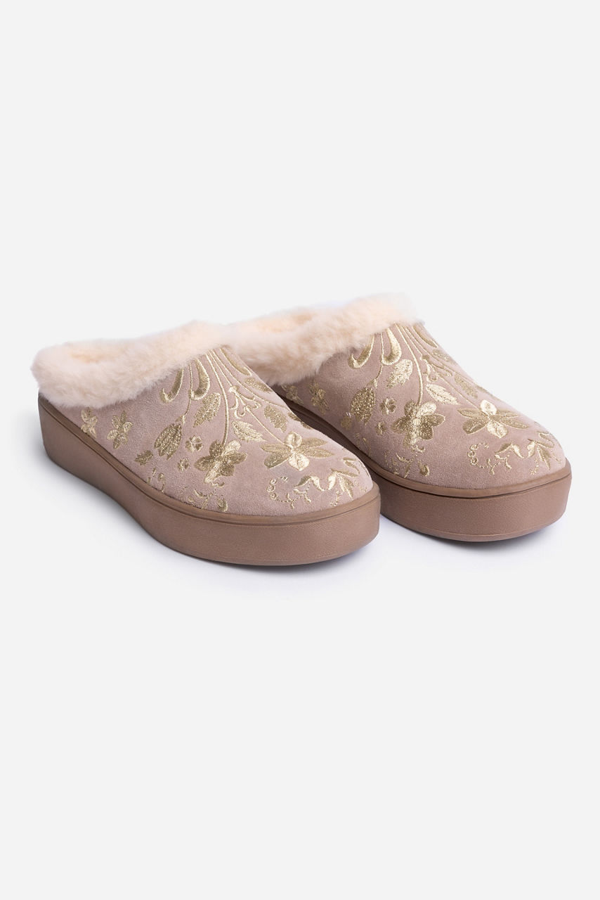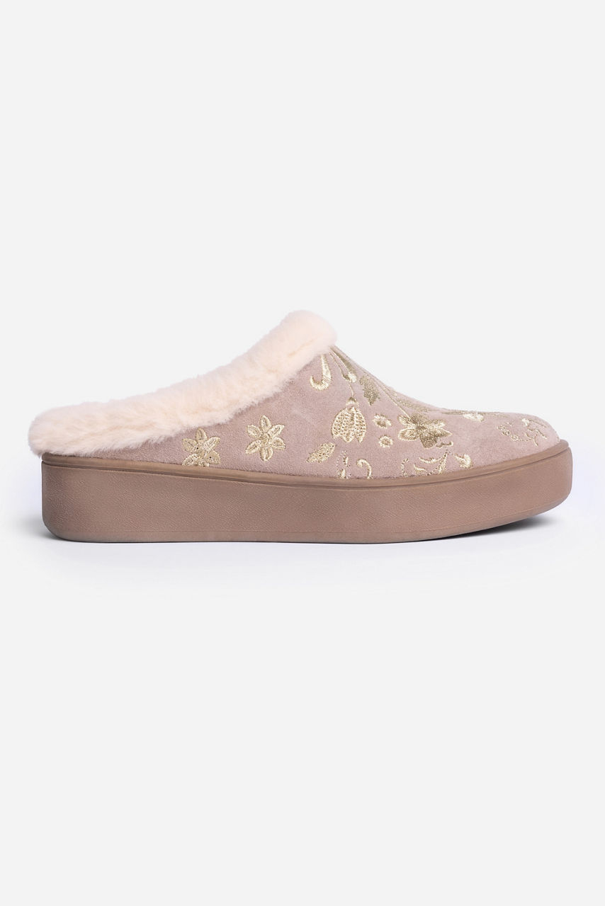 Crafted from 100% suede, the Talitha Embroidered Suede Mules are the perfect combination of comfort and casual style. Featuring a faux fur lined interior and a durable platform sole, these mules slip on and are finished with intricate placement embroidery. Pair with casual pants and a classic tee for a cozy weekend look.