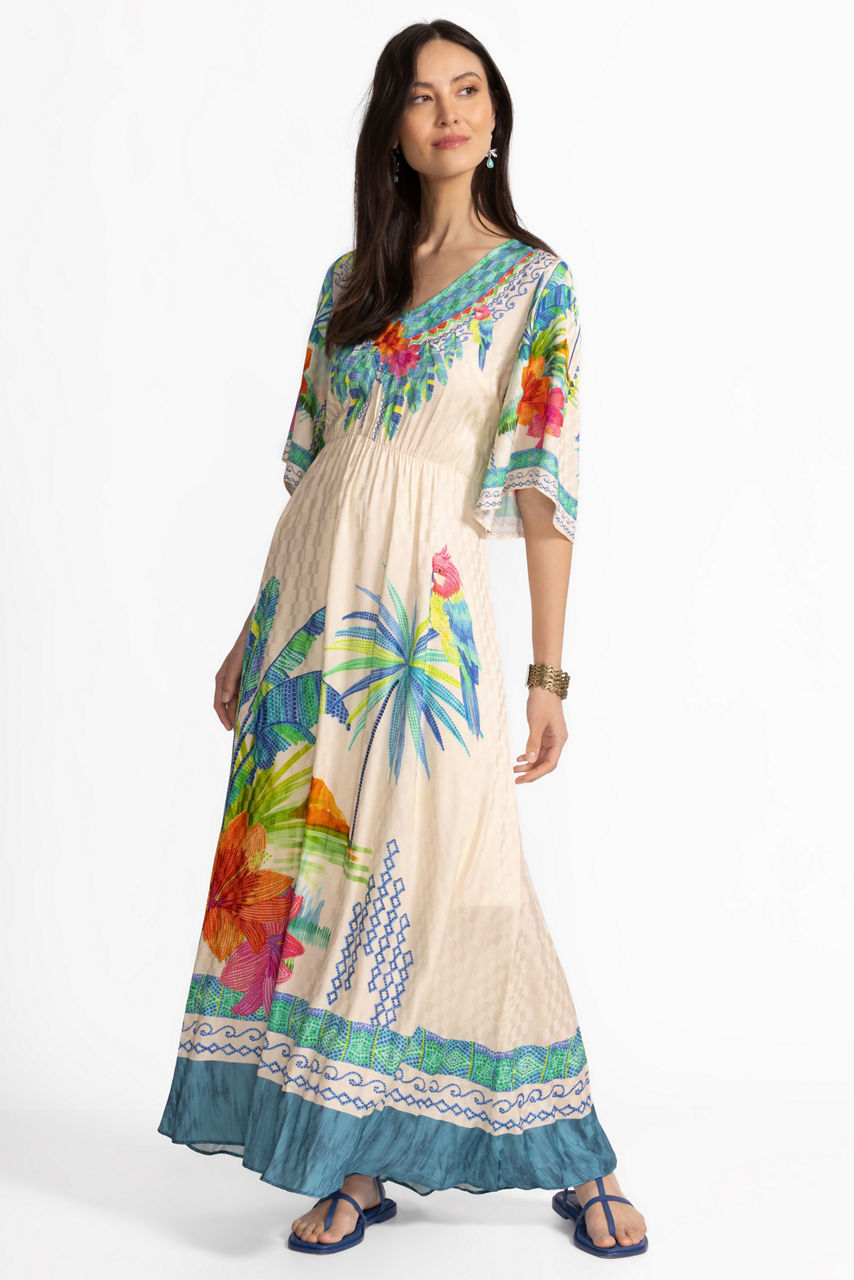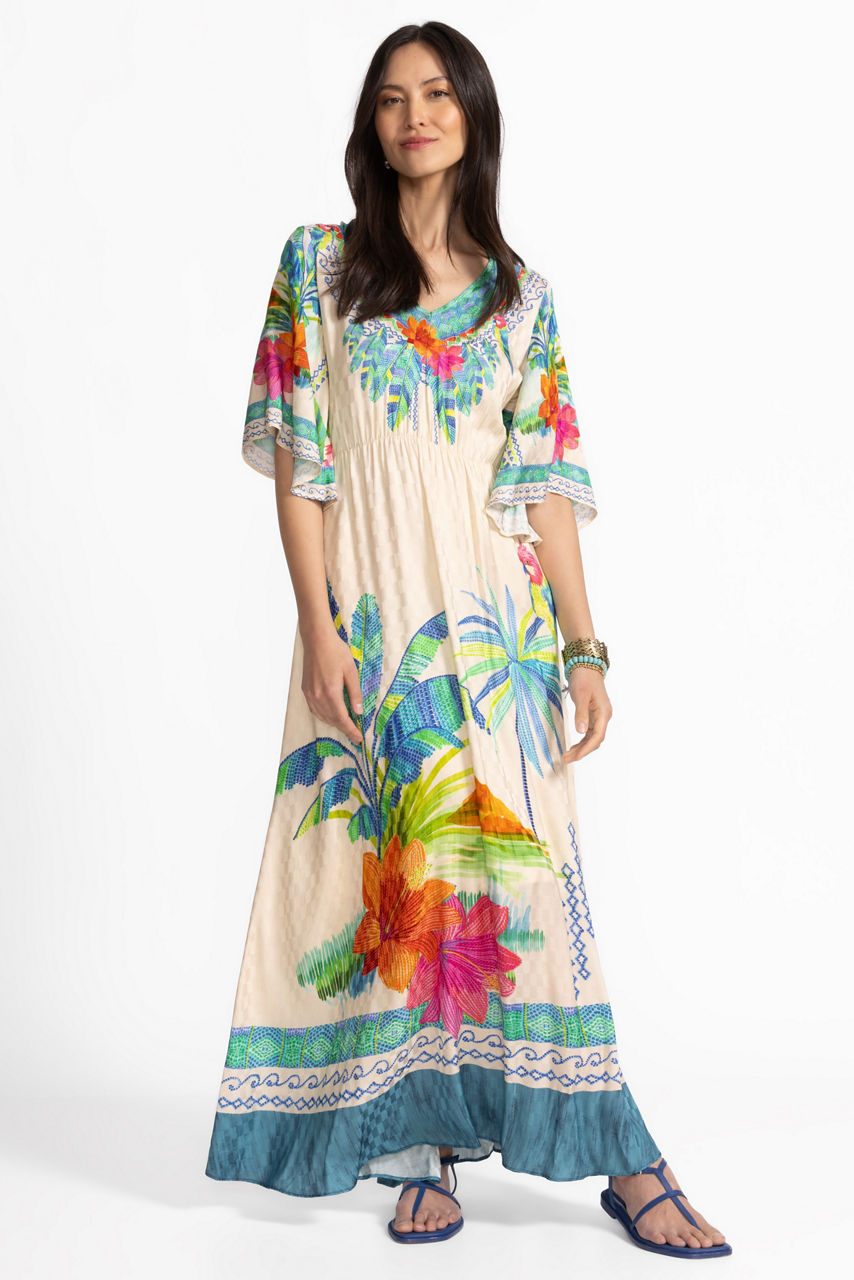 Brilliantly embellished with vibrant florals and island iconography, the Tami Maxi Dress is crafted from a lightweight breezy fabric. Designed with a V-neckline and flutter sleeves this dress offers an elastic waist and shirring at the back waist for a distinctive silhouette. Pair with vibrant espadrille wedges and bold jewelry pieces for an unforgettable daytime ensemble.