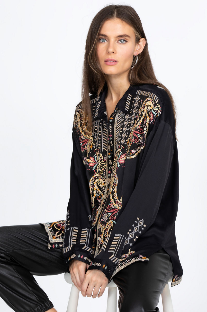 Our Tandit Blouse caresses the skin with its loose, flowing satin. White, geometric finishes with delicate embroidered flowers grace the front, collar and sleeves. Choose the Tandit in black or spruce green, and pair it with black velvet pants and black ballet slippers for a cohesive look. You could also select a black pencil skirt and heels to contrast with the Tandit s subtle lines.