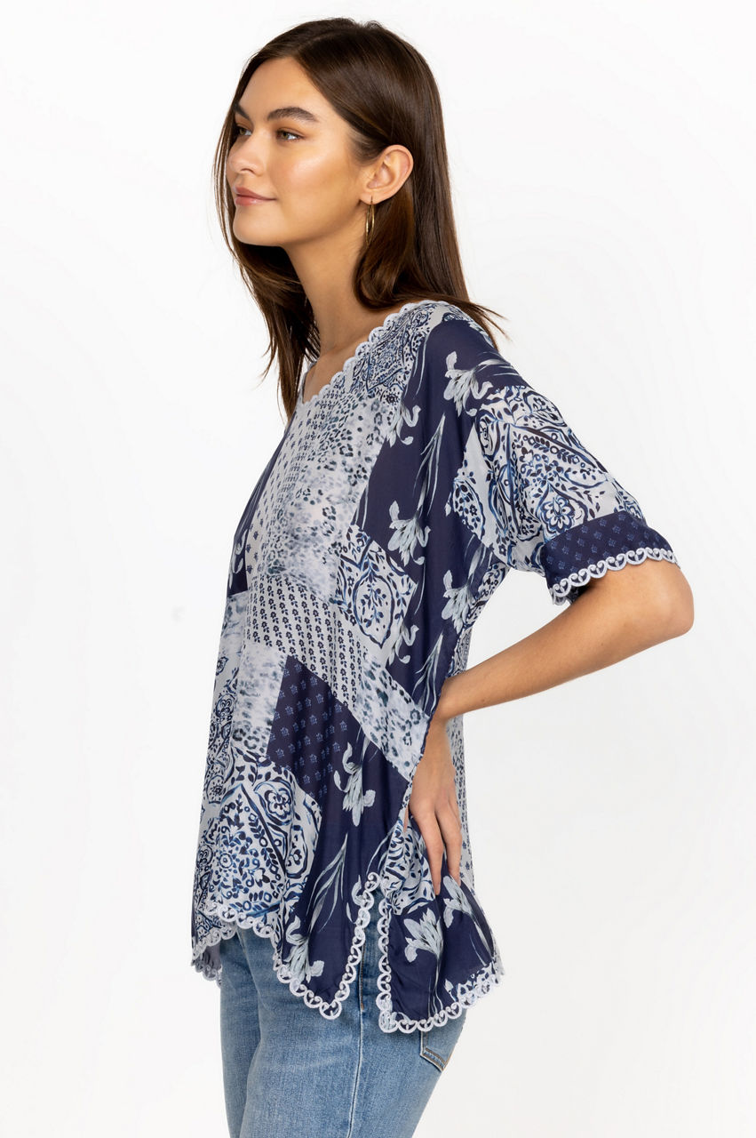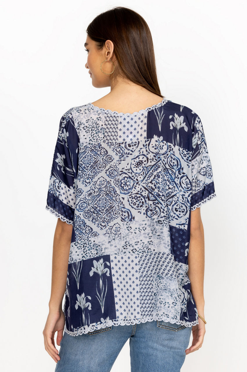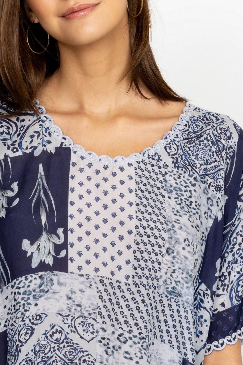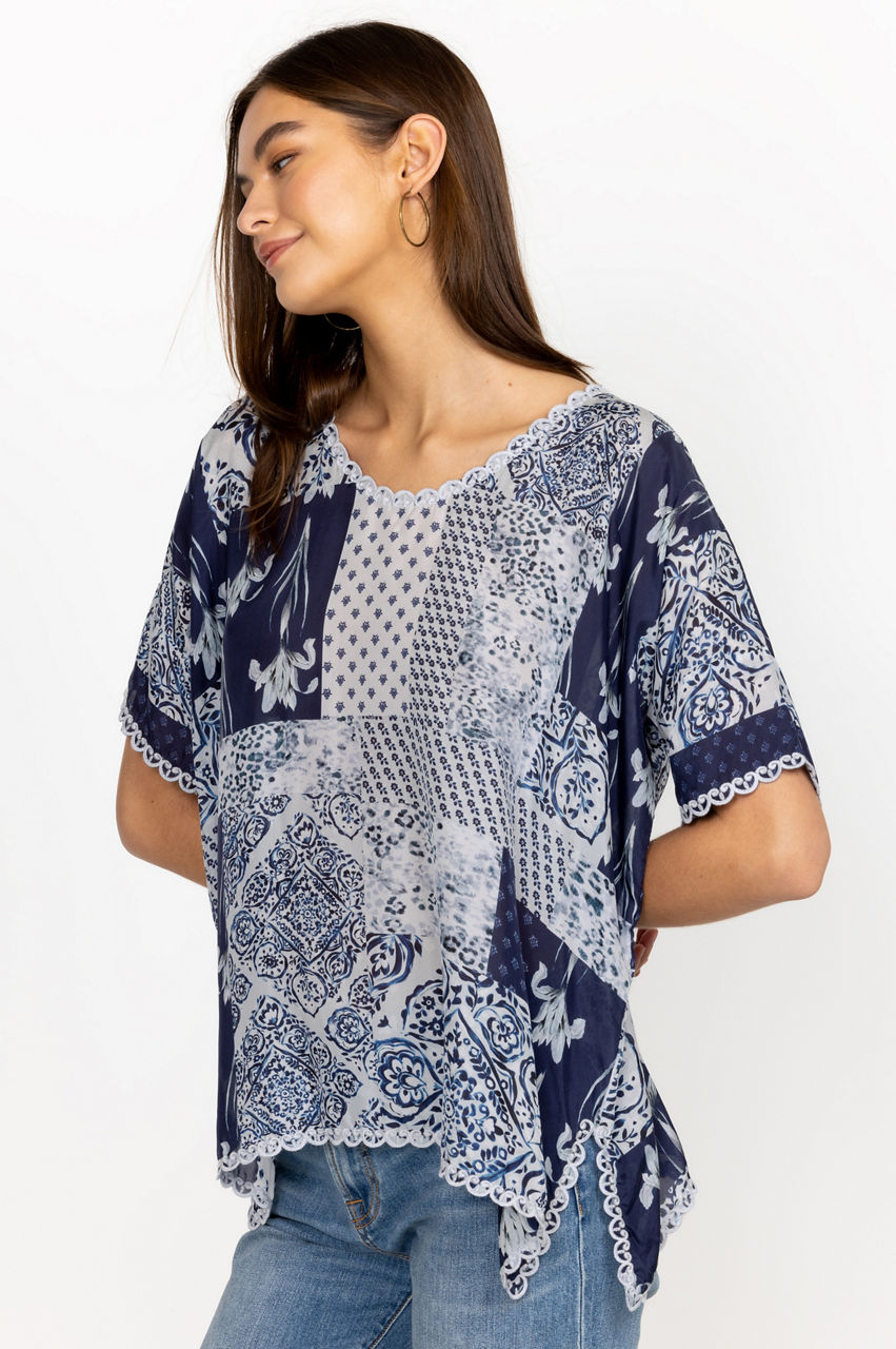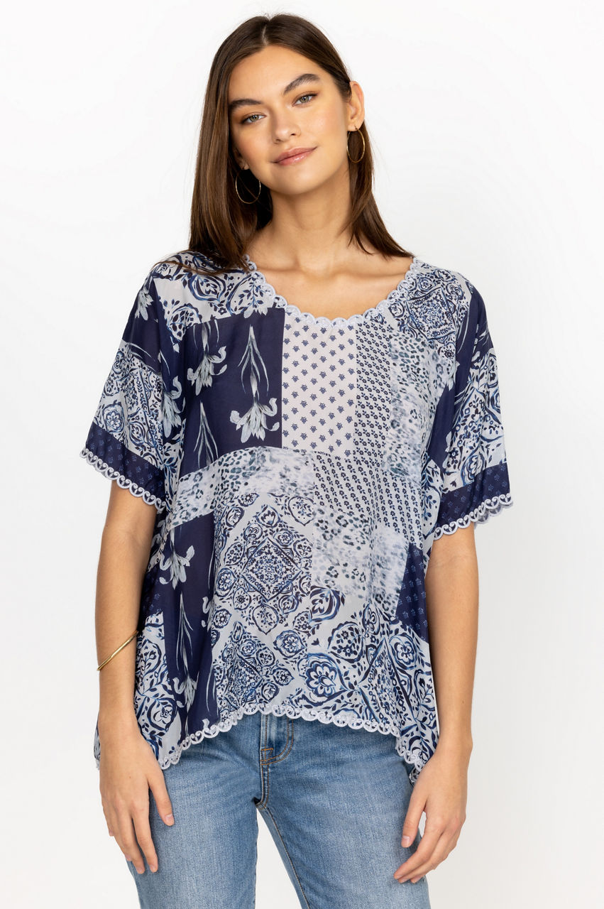 A symphony of bold patterns, the Tangier Halsey Top is infused with a free-spirited attitude. Perfect for sun-soaked weather, this top is made from lustrous silk and enhanced by contrasting floral and repeated patterns in various blue shades. Finished with embroidered scalloped edging along the asymmetric hem, this top can be worn with jeans or relaxed pants for a laidback daytime look.