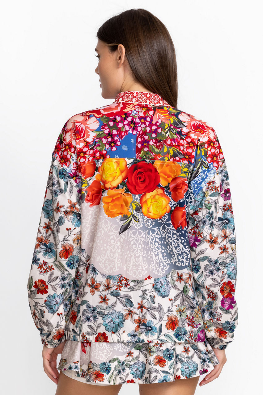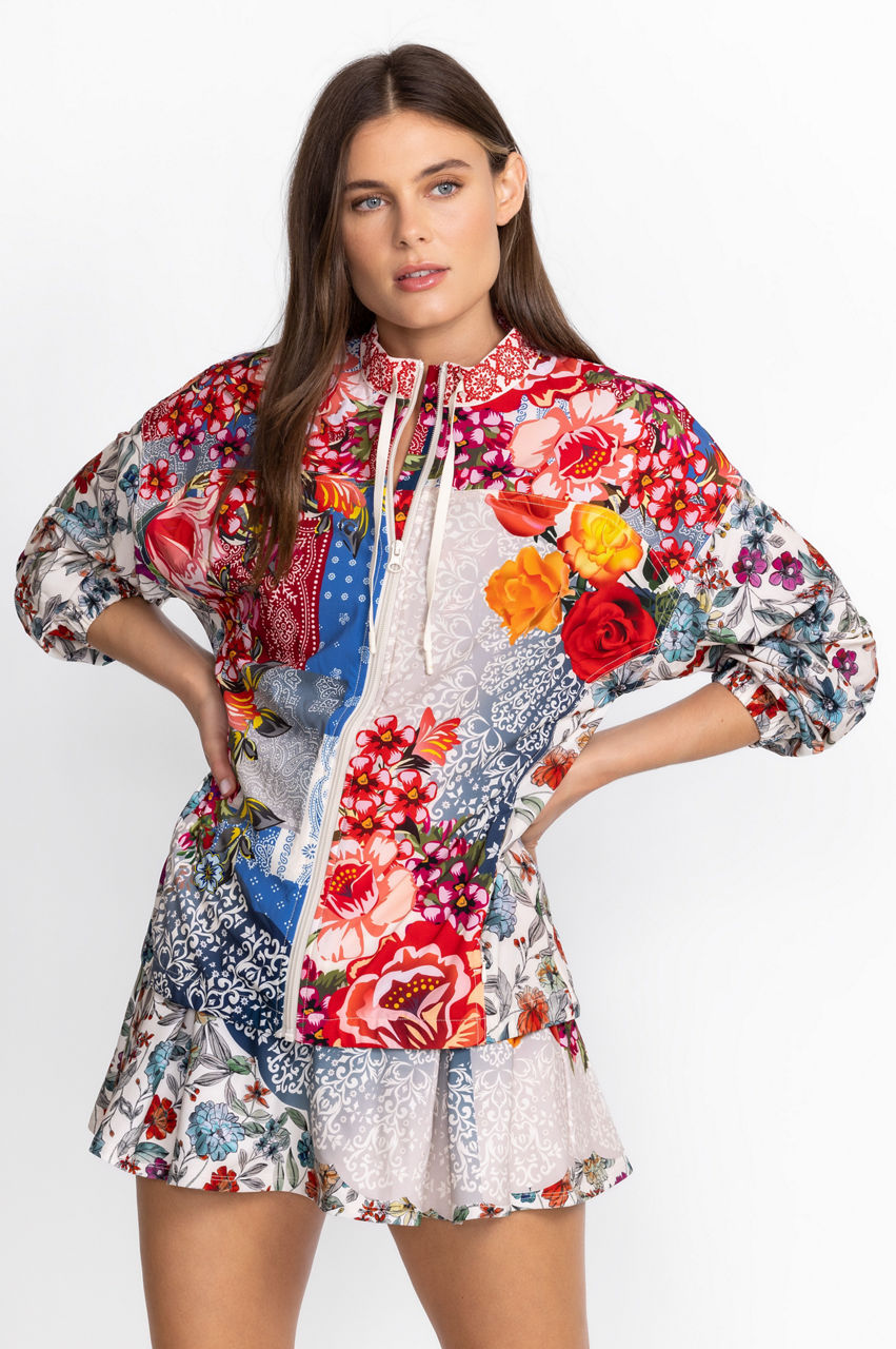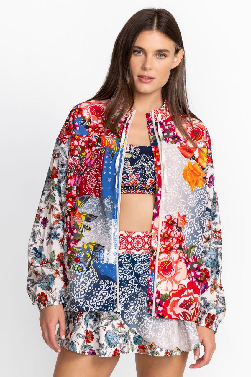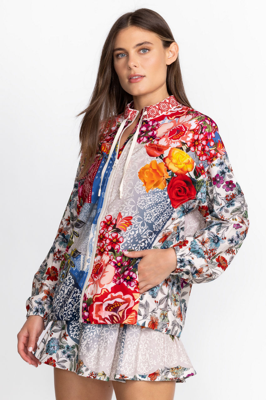 Crafted from a breathable fabric with added stretch, this Tango Sporty Zip Jacket is effortlessly accented by contrasting colors and patterns. This jacket boasts a zip front, long sleeves, a collar, and two rich floral patterns with both dainty and large motifs. Style this jacket with a vest and printed joggers for a vibrant workout-ready ensemble.
