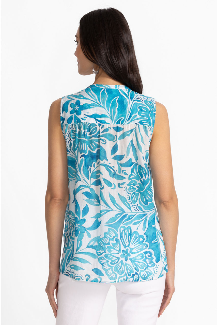 The Bethany Tank Blouse is crafted from a breezy lightweight fabric and is adorned with a vibrant floral pattern. Designed with a V-neckline and a button-front, this sleeveless blouse is finished with a chevron lace embellishment at the shoulders. Pair with linen pants and sandals for an elevated warm weather ensemble.