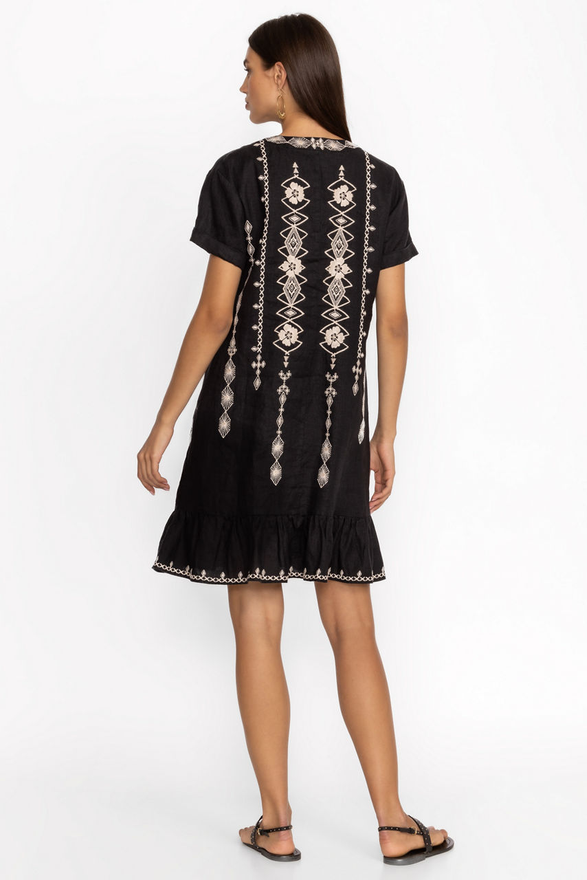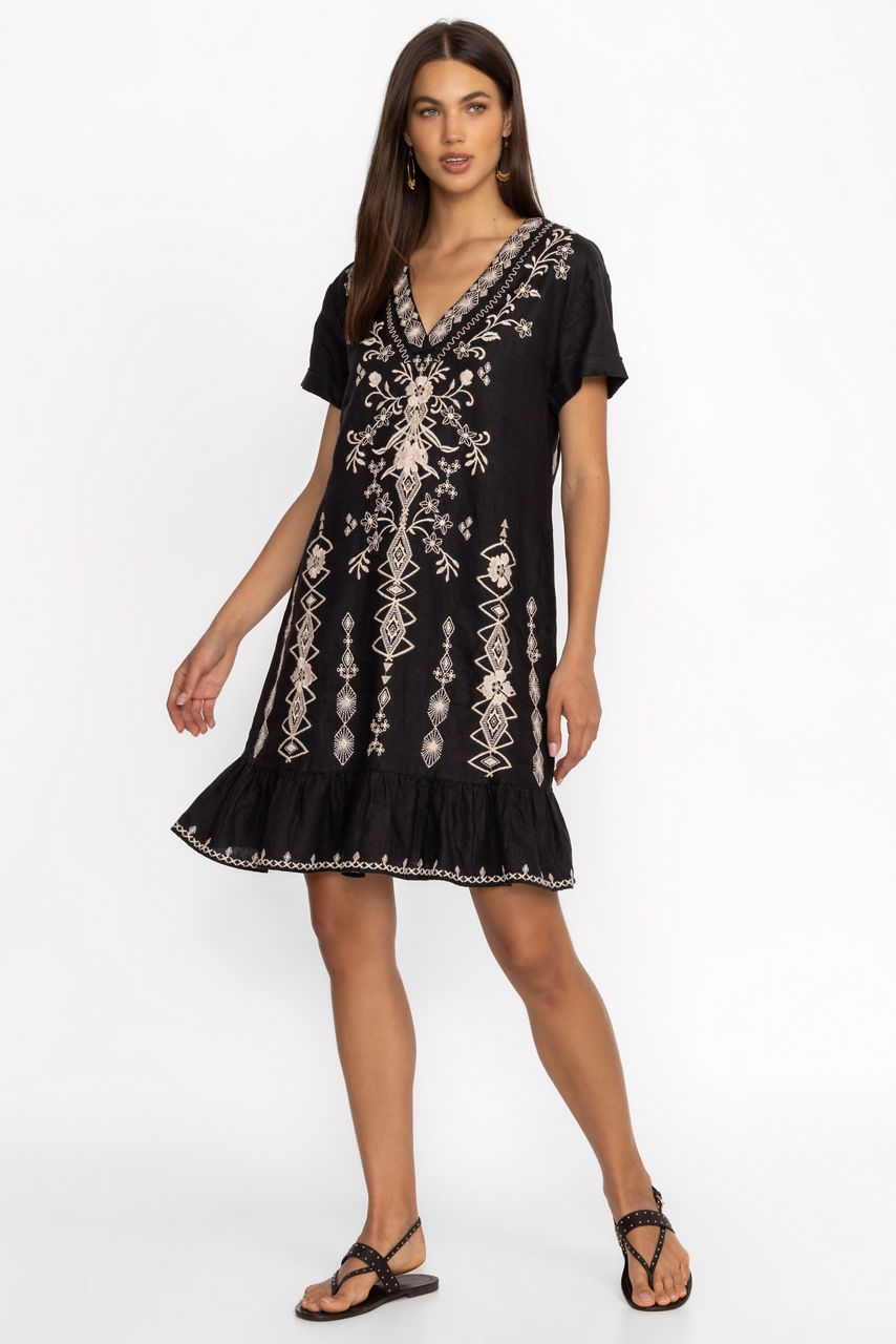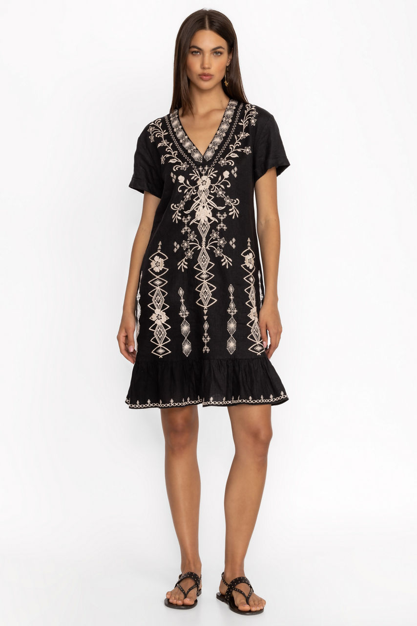 Crafted from 100% luxurious linen, the Taria Shift Dress is ornately detailed with intricate placement embroidery at the front and back. Featuring a V-neckline and short sleeves, this dress falls just above the knee and is finished at the hem with a gathered ruffle. Pair with casual sandals and a trendy crossbody bag for a relaxed day of sightseeing.