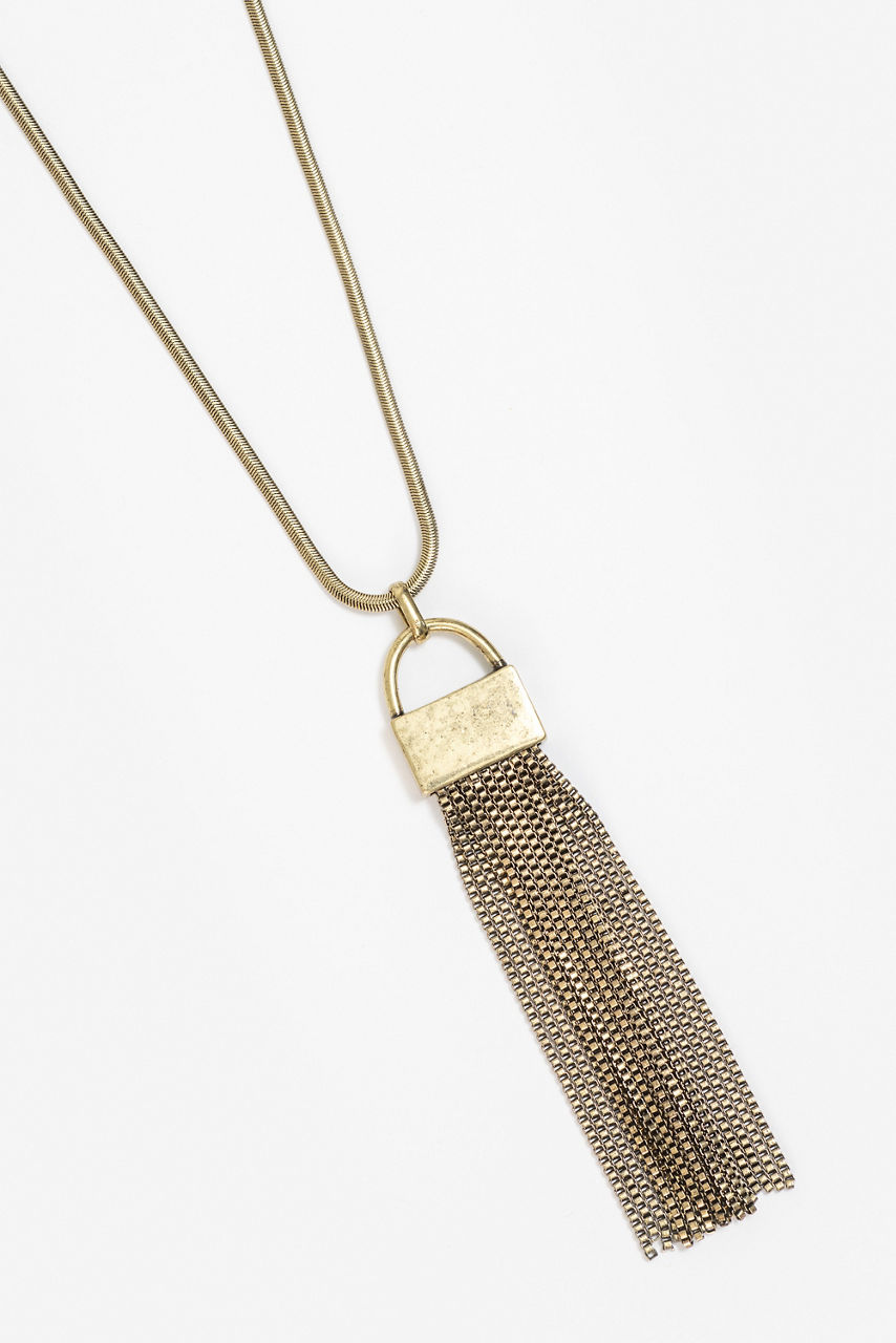 Creating a sense of elegance and style, the Tassel Drop Necklace is equal parts versatile and fun. Featuring strands of brass-tone metal suspended as a pendant, this timeless necklace can be worn with casual and elevated styles. Pair with the Tassel Drop Earrings for a perfectly coordinated look.