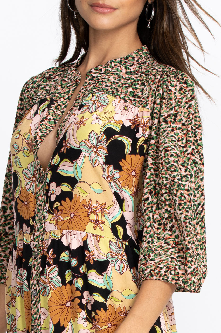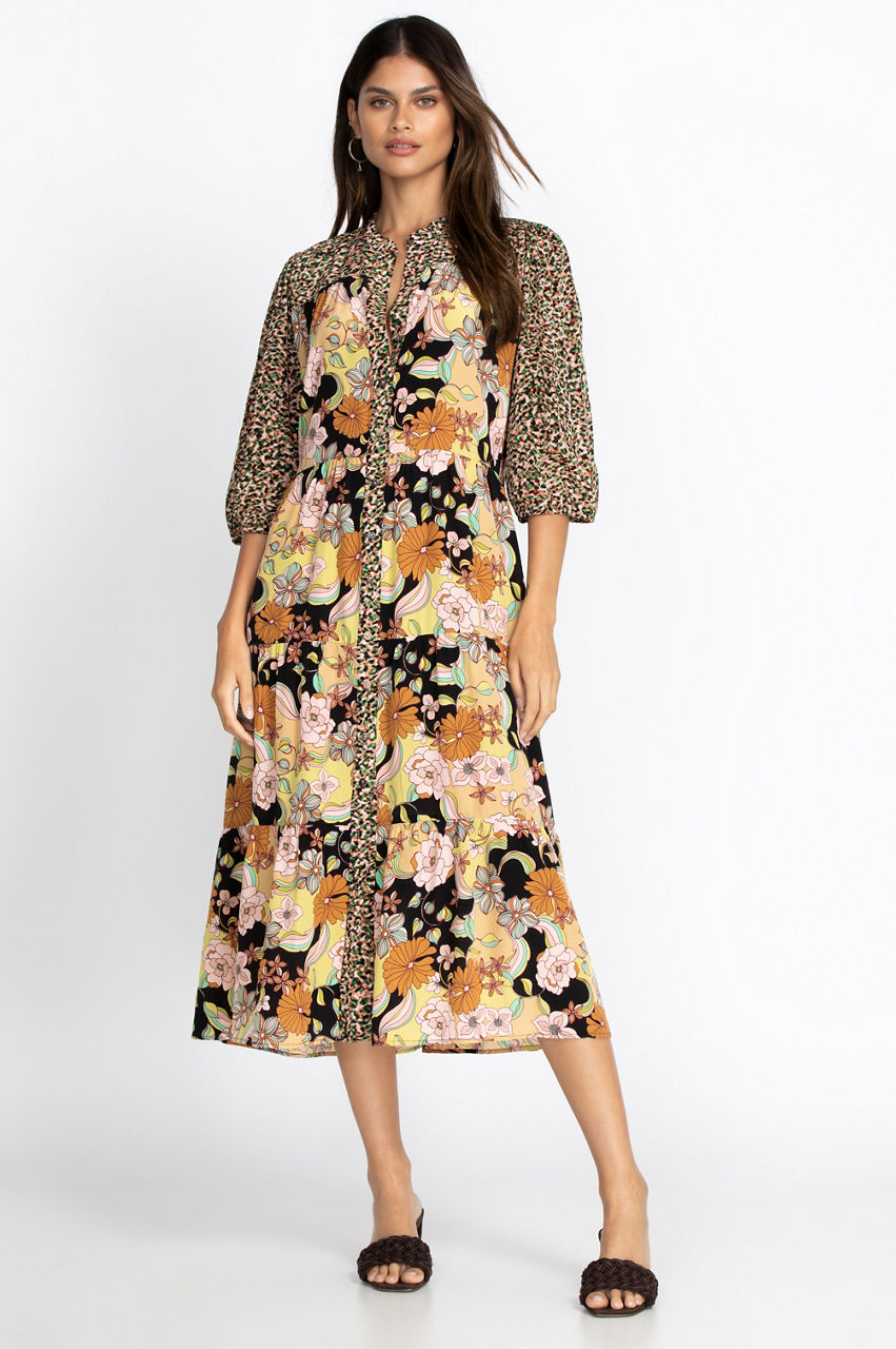 Our gorgeous TATE TIERED MIDI DRESS is everyone's dream dress. This is a perfect throw-on and go wardrobe essential. Its V-shaped neckline, tiered layers, floral print, and button front enhance the elegant look. Made from 100% silk, this dress is perfect for any occasion pair it with heels and a necklace for a luxurious look.