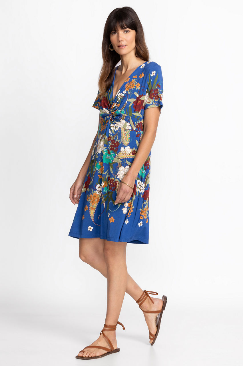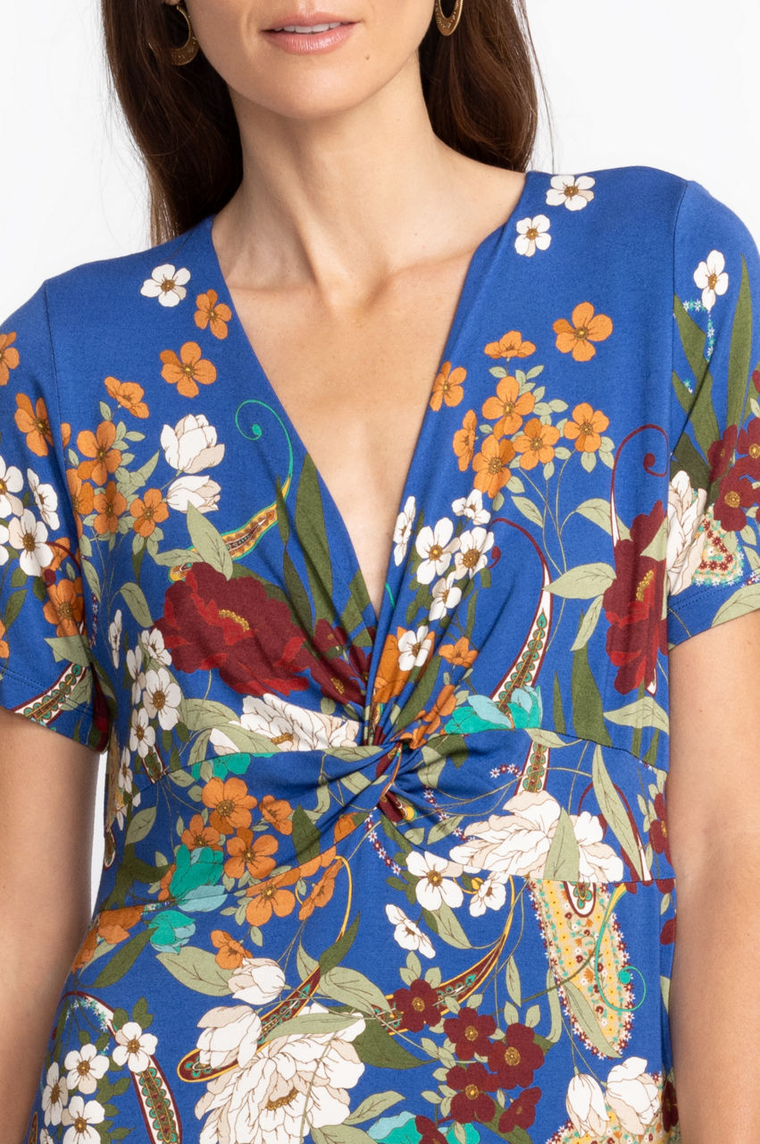 Delivering fresh floral arrangements on a stunning statement piece, the Tee Bee Twist Front Swing Dress is a graceful addition to any closet. Featuring a V-neckline a fluttering cap sleeves, this bold combination of vivid color is sure to turn heads. Pair with strappy heels and delicate gold accessories for a chic brunch look.