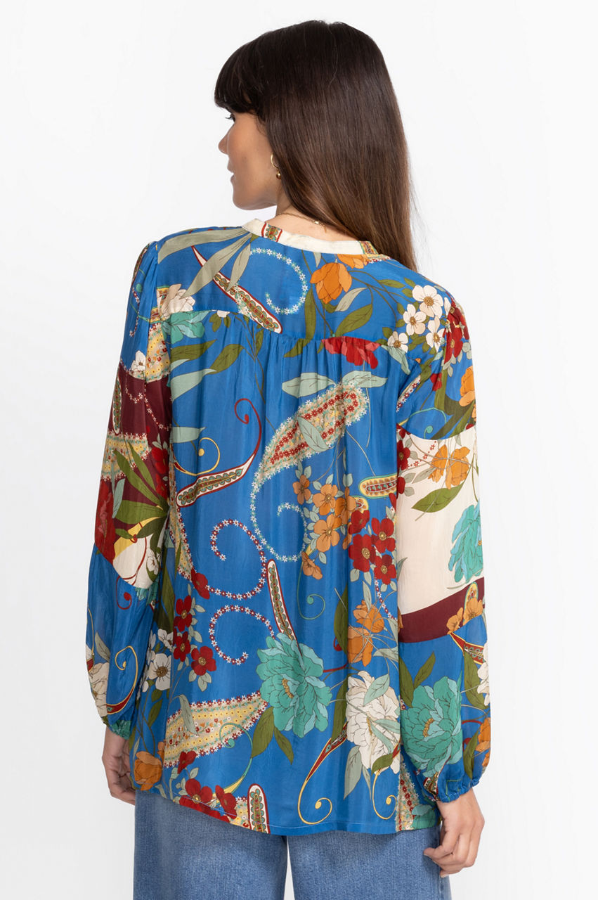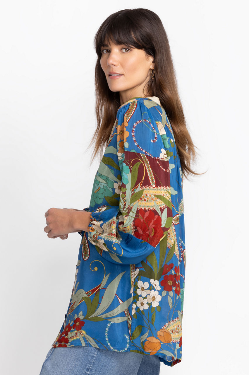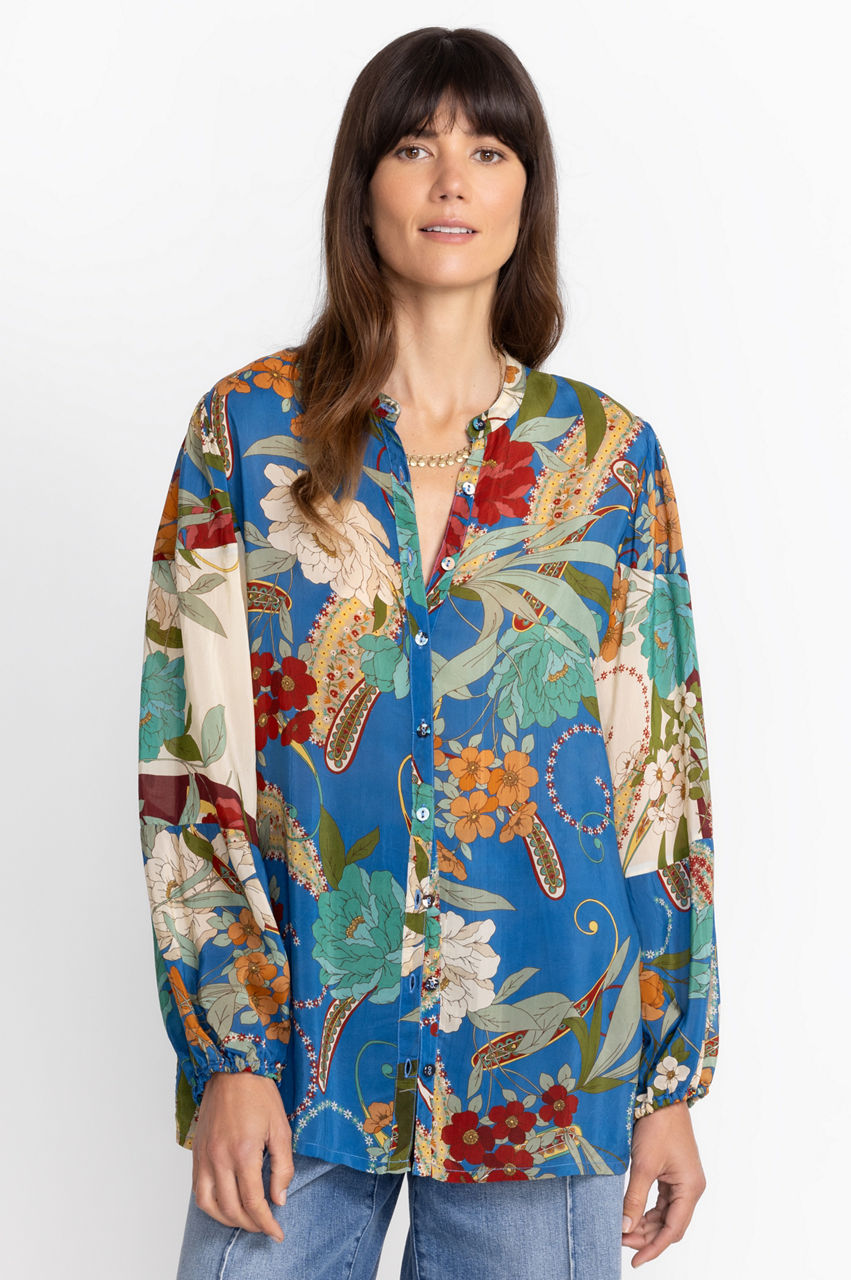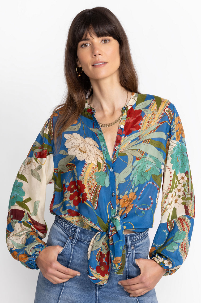 Infused with a tropical vibe, the Teebee Tori Blouse turns a perennial wardrobe staple into an instant must-have. Adopting a vibrant color scheme, this blouse is made from a fluid fabric with a collar, a front button closure, a floral print, and shirring on the sleeve and back. Style this shirt with jeans and gold-tone jewelry for a fashion-forward approach to daytime dressing.