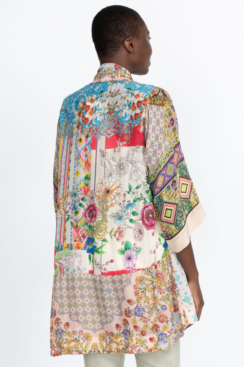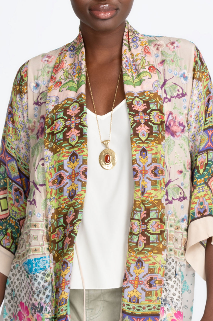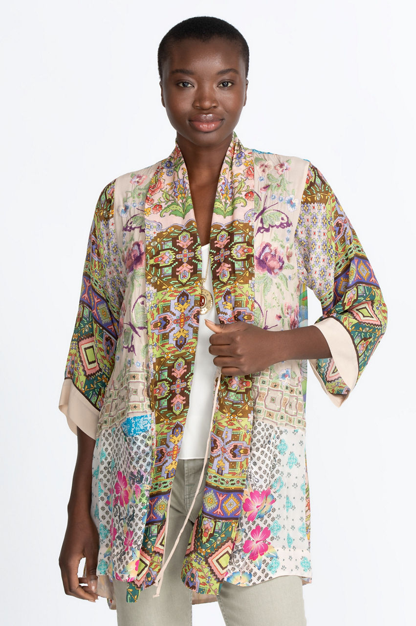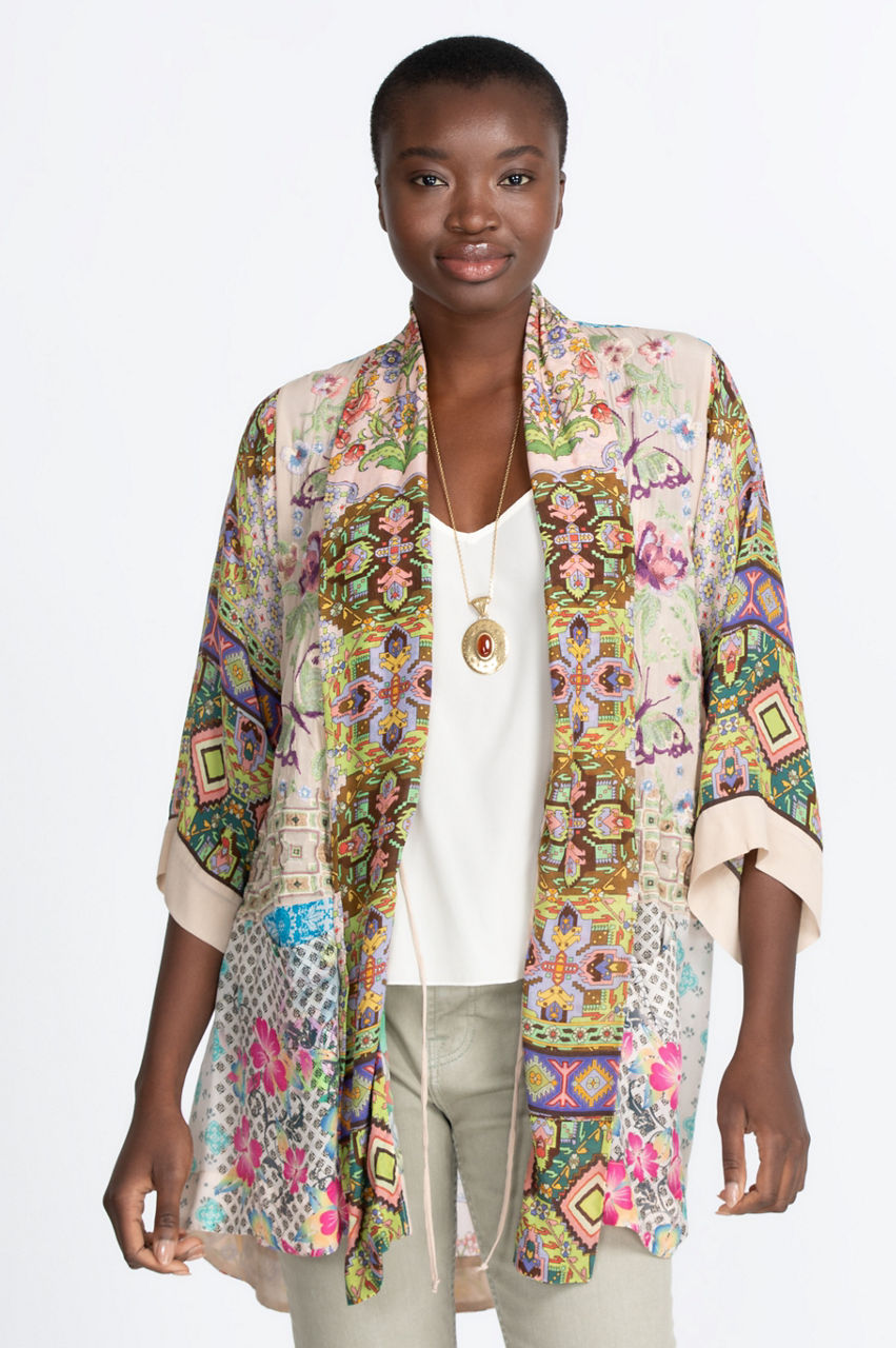 This comfortable kimono features a loose fit for a draped effect. The wide sleeves allow for movement, while the geometrical motifs add structure to the piece. The neutral background enhances the different design elements of the stylish print. Wear this kimono with your favorite lounge set, or layer it over a blouse or silk tank top for a sophisticated outfit.