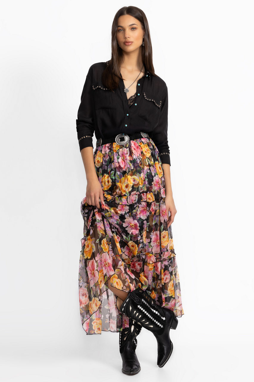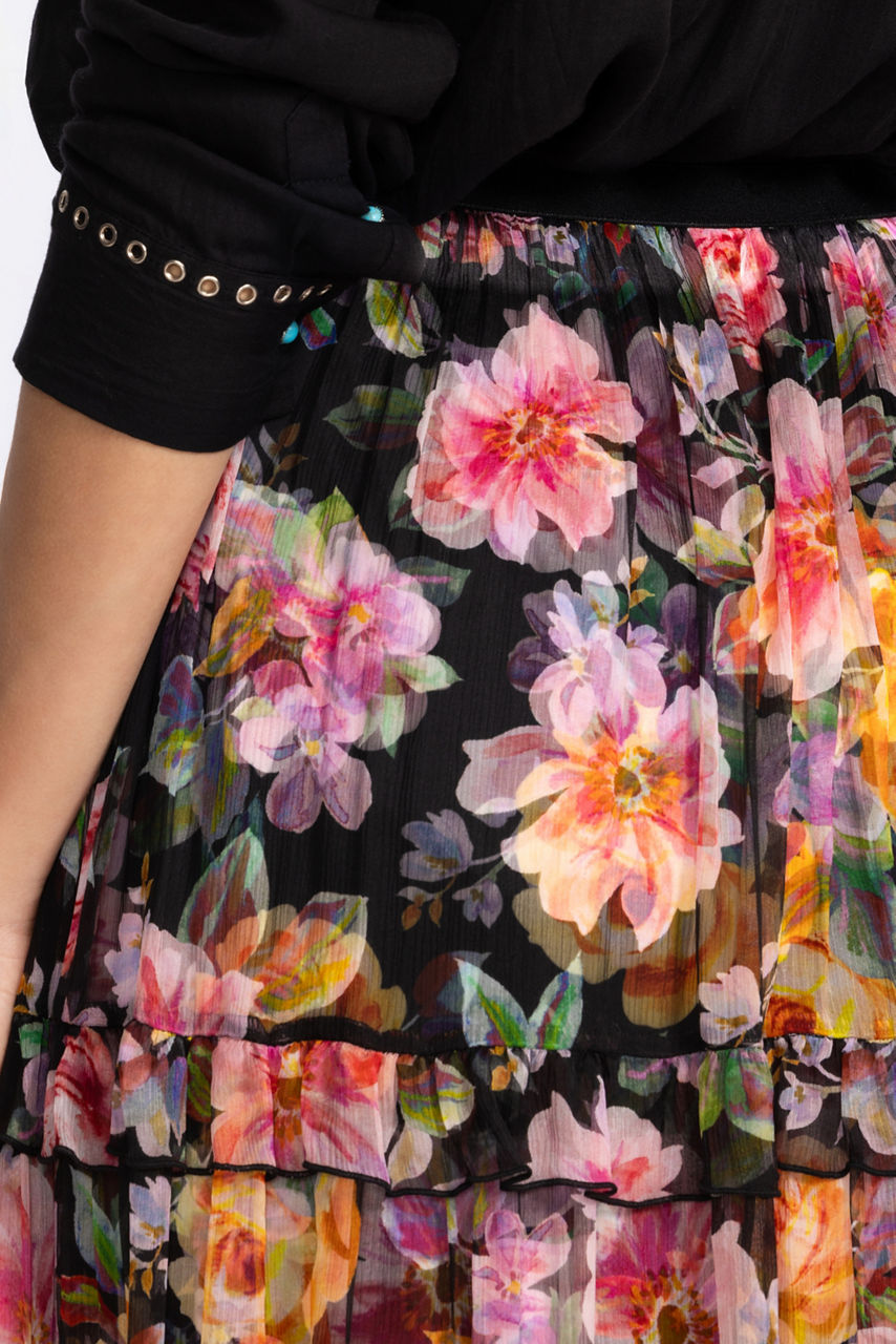 Adorned with vibrant color and a bold floral pattern, the Terra Tiered Maxi Skirt creates a distinctly feminine silhouette. Crafted from 100% silk, this partially lined skirt features an elastic waist and a flowing tiered maxi length skirt. Pair with a coordinating silk cami and a cozy shrug for a brunch-ready ensemble.