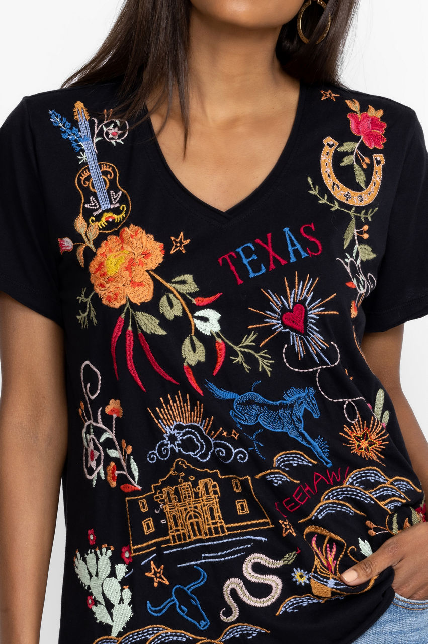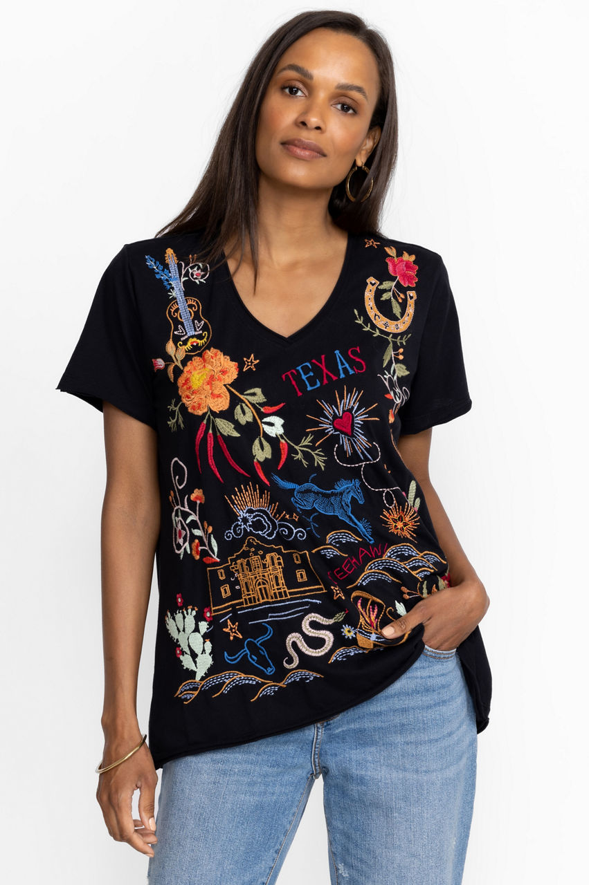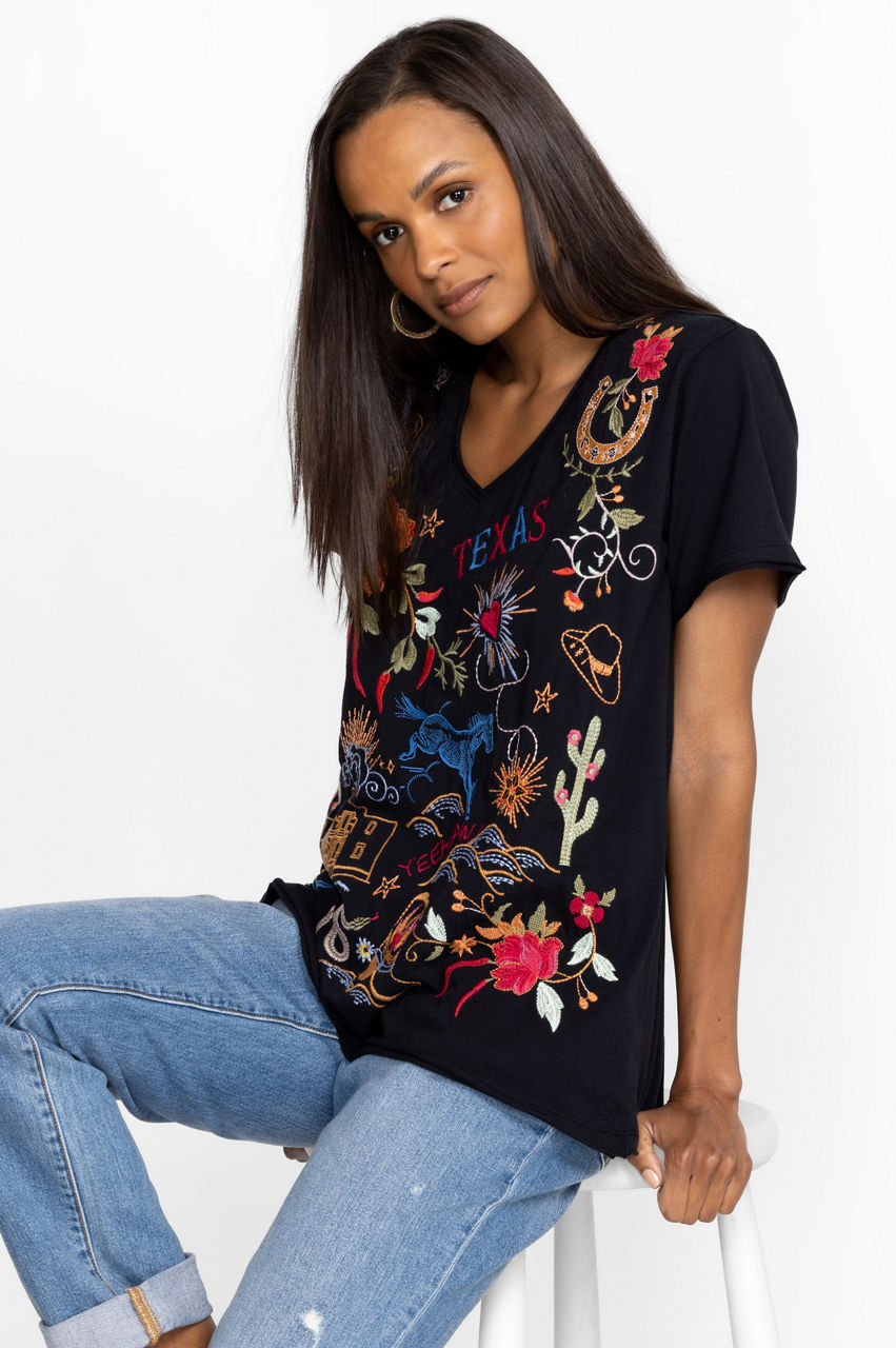 Casual comfort in a classic silhouette, the Texas Cap Sleeve Tee is a celebration of the Lone Star State. Boasting an easy bias cut and a flattering V-shaped neckline this tee features iconic Texas imagery in carefully crafted placement embroidery. Pair with denim trousers and wedge sandals for completed casual look.