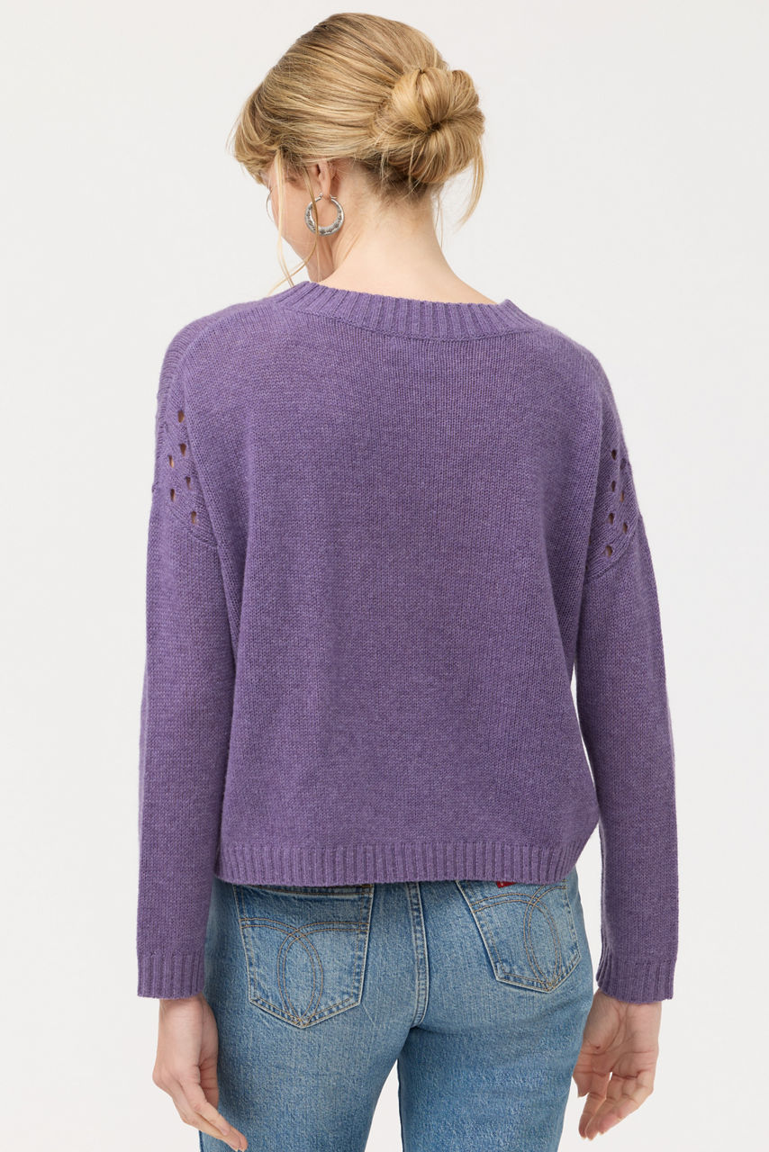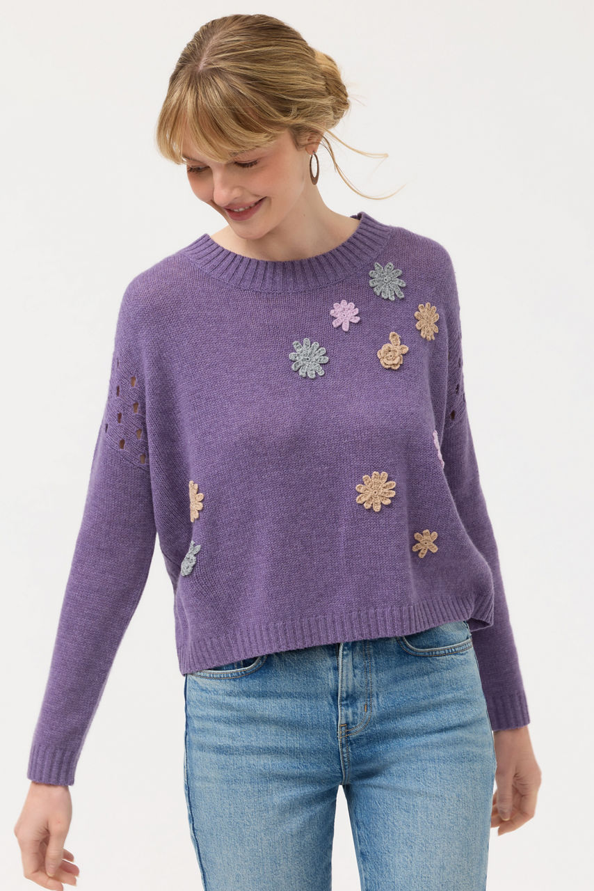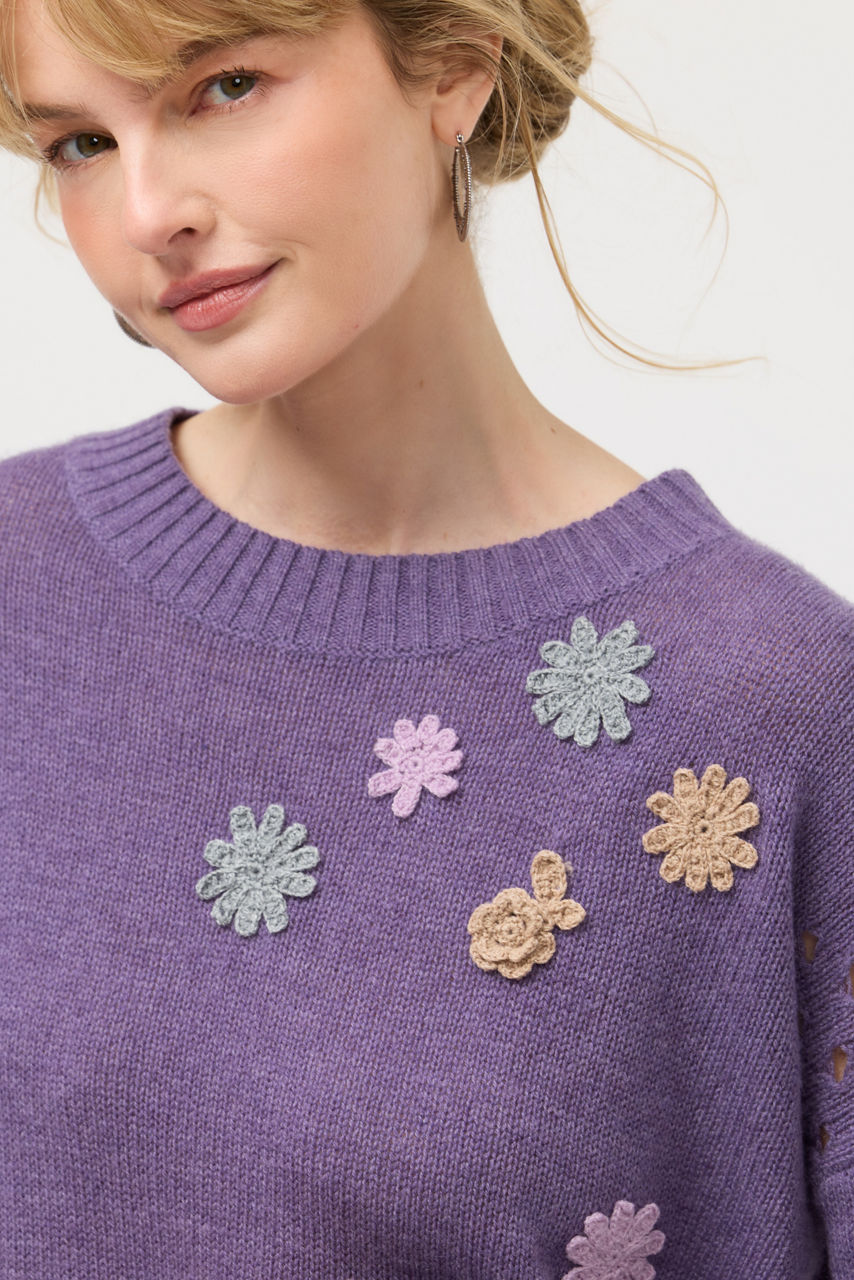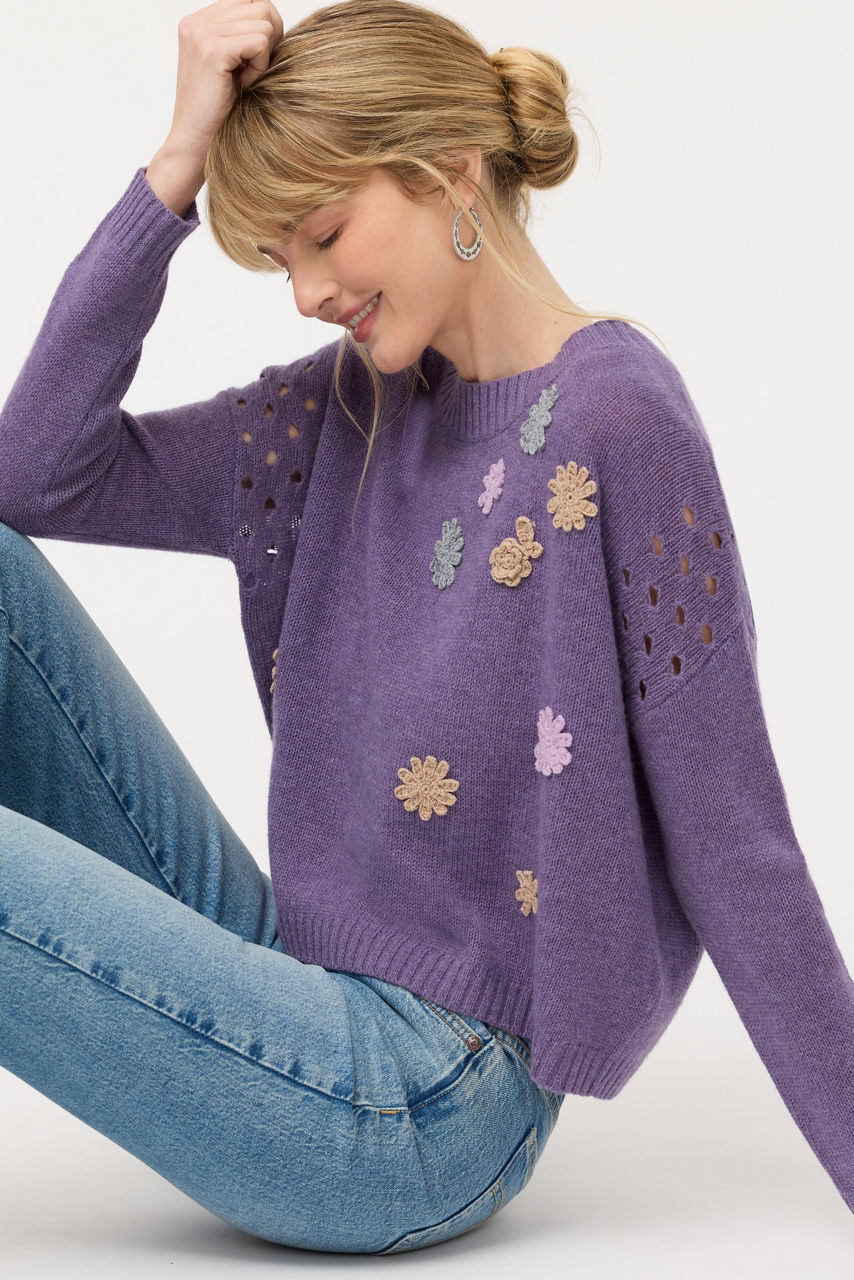 Crafted from a luxurious blend of wool and cashmere, the Prisca Appliqu Pointelle Pullover is equal parts cozy and stylish. Designed with a crew neckline and unique open-knit detailing at the shoulders, this lavender sweater is finished with thoughtful floral appliqu . Pair with denim and fashion sneakers for an elevated casual look.