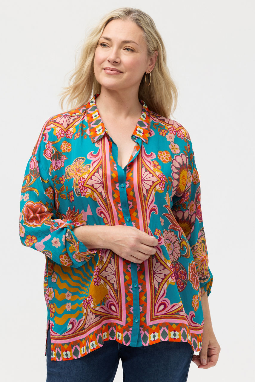 Embellished with a vibrant floral pattern, the Audrey Button Up Shirt is washed in brilliant color. Designed with a button-front and drop shoulders, this mesmerizing shirt is finished with roll-tab sleeves and side slits for a relaxed fit. Pair with palazzo pants and vibrant flats for a polished evening look.