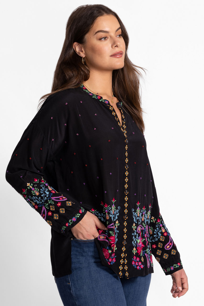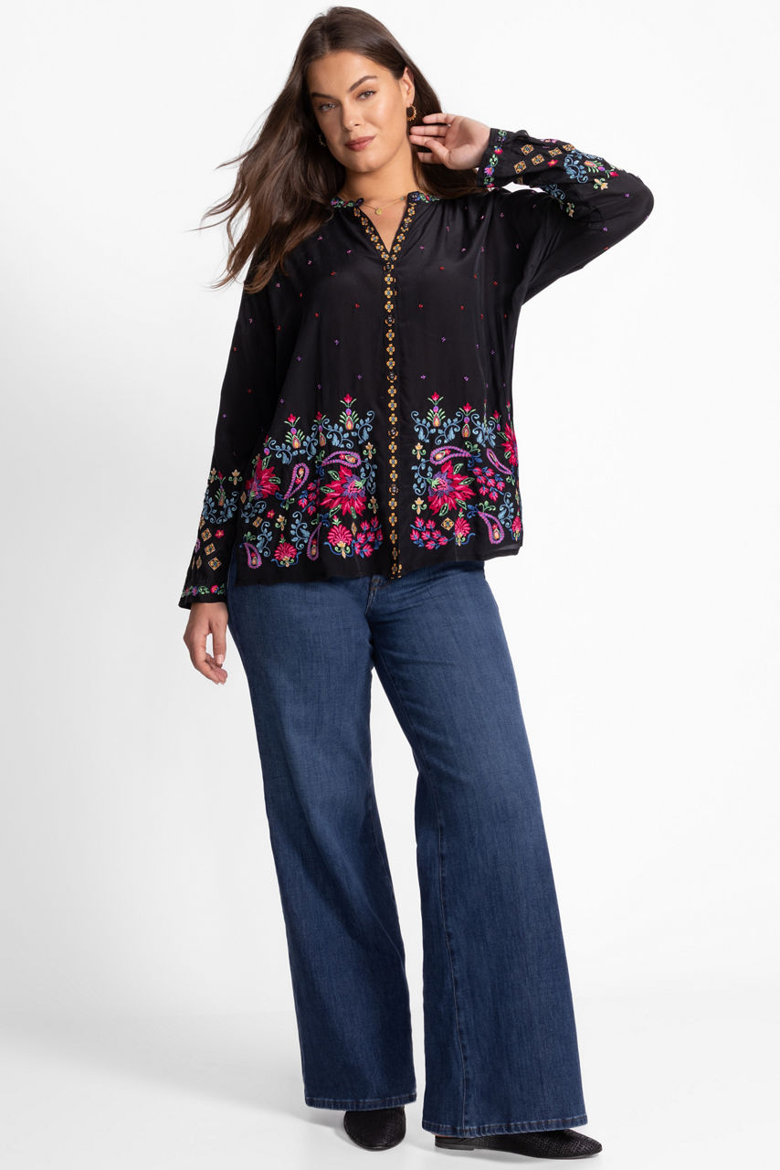 Washed in rich earth tones, the Teresa Audrey Mandarin Collar Shirt is embellished with intricate embroidered detailing for a textured effect. Crafted from 100% silk, this shirt features a mandarin collar and drop shoulder and is finished with roll-tab sleeves and side slits for an effortless fit. Pair with fitted denim and trendy flats for a polished casual look.