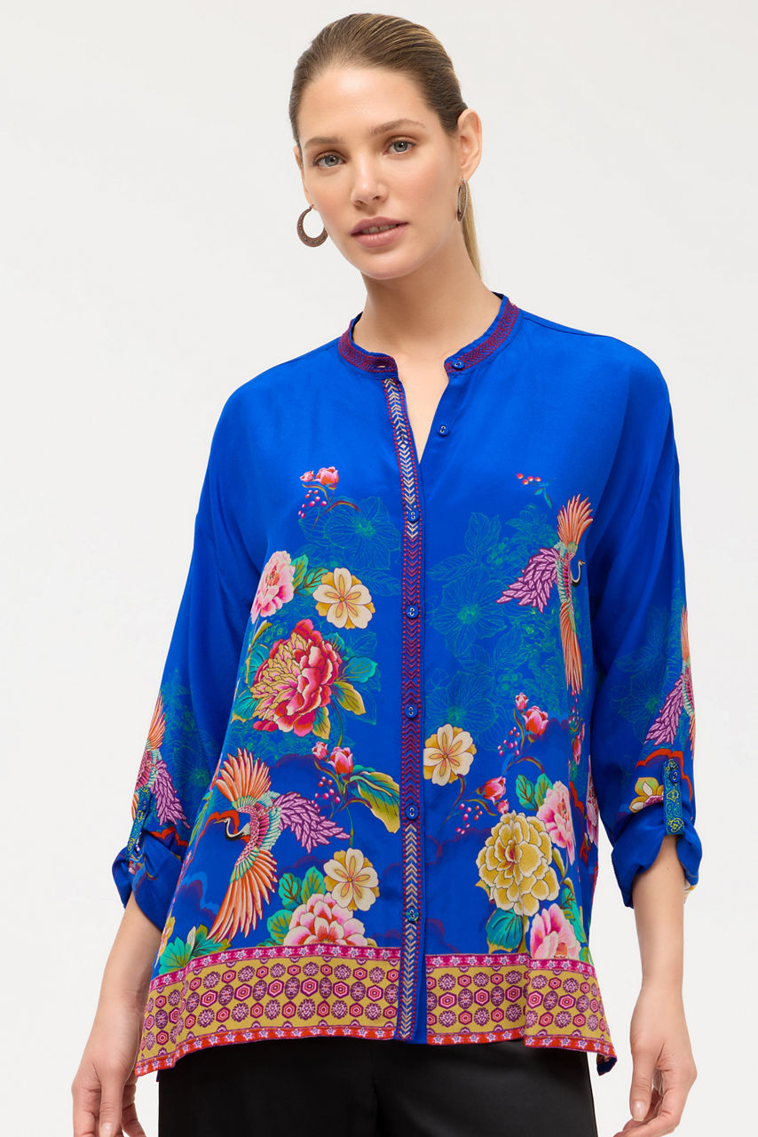 Crafted from 100% rich silk, the Audrey Mandarin Collar Shirt is designed in brilliant blue. Featuring a Mandarin collar and a button-front, this drop shoulder blouse is embellished with a bold floral pattern and is finished with roll-tab sleeves and side slits. Pair with white linen pants and easy slide sandals for a vacation-ready look.