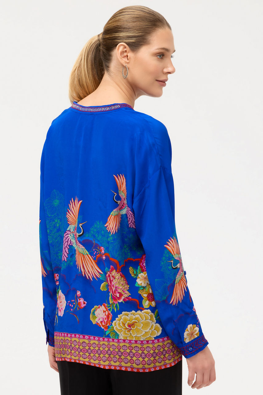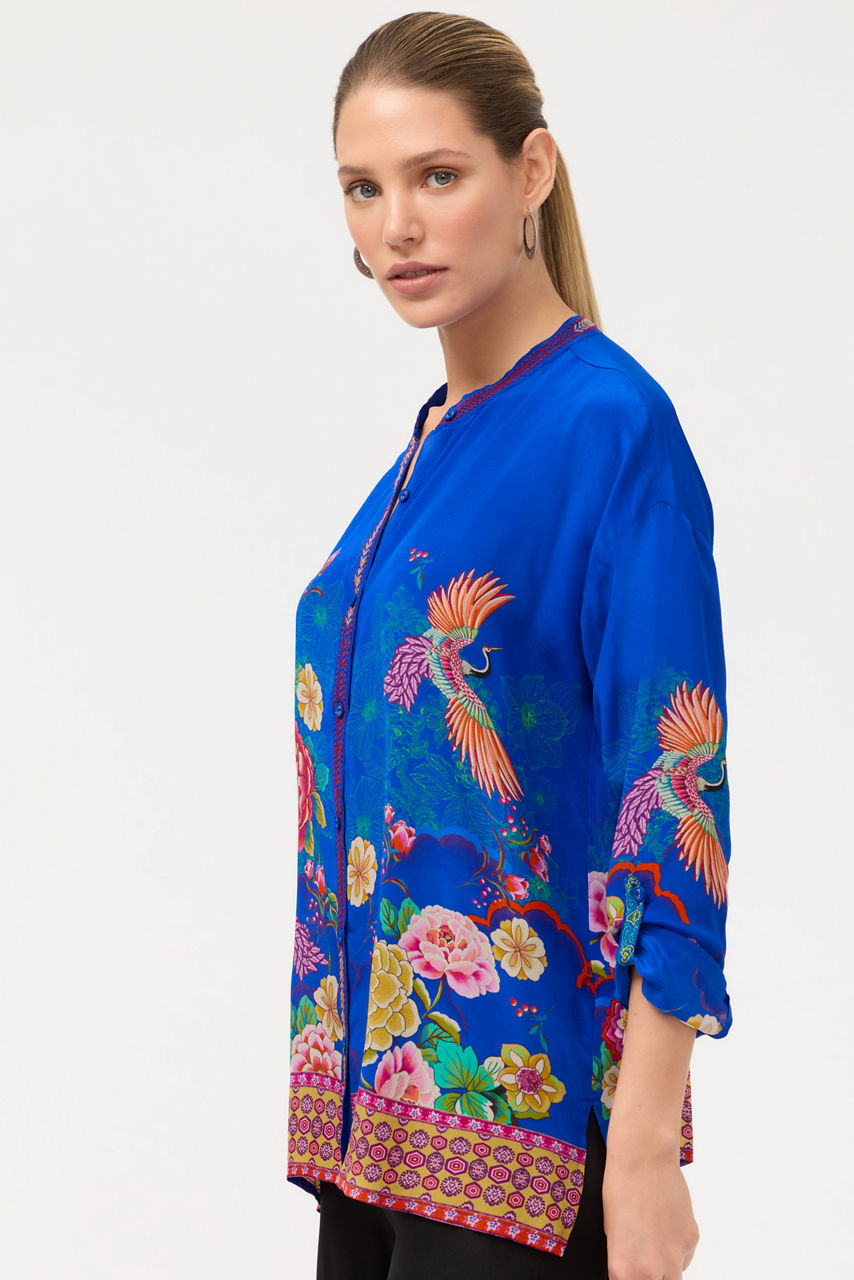 Crafted from 100% rich silk, the Audrey Mandarin Collar Shirt is designed in brilliant blue. Featuring a Mandarin collar and a button-front, this drop shoulder blouse is embellished with a bold floral pattern and is finished with roll-tab sleeves and side slits. Pair with white linen pants and easy slide sandals for a vacation-ready look.