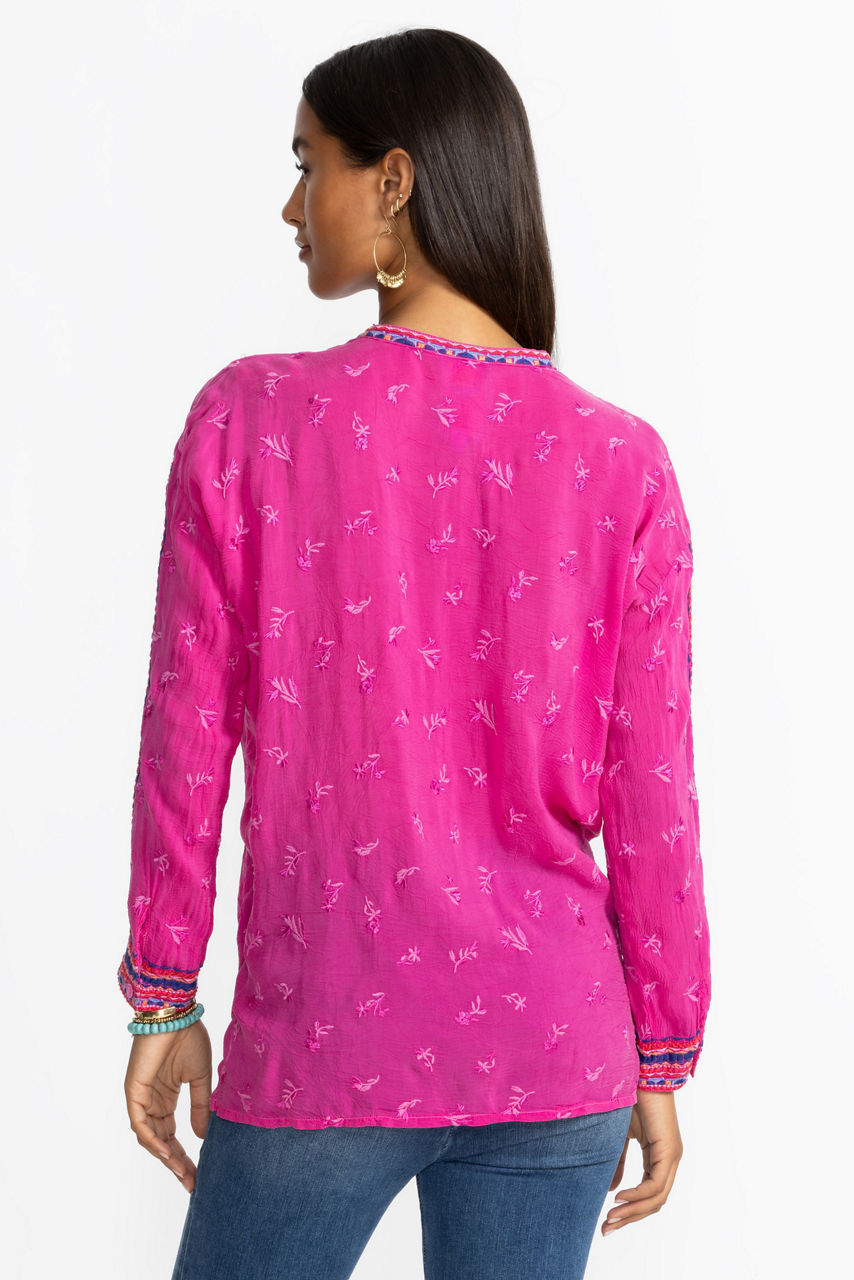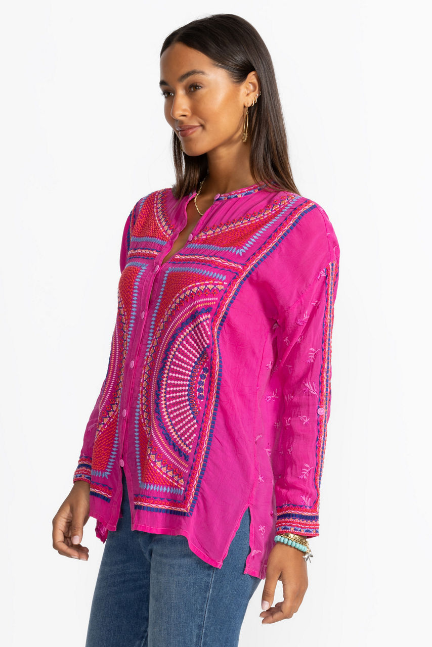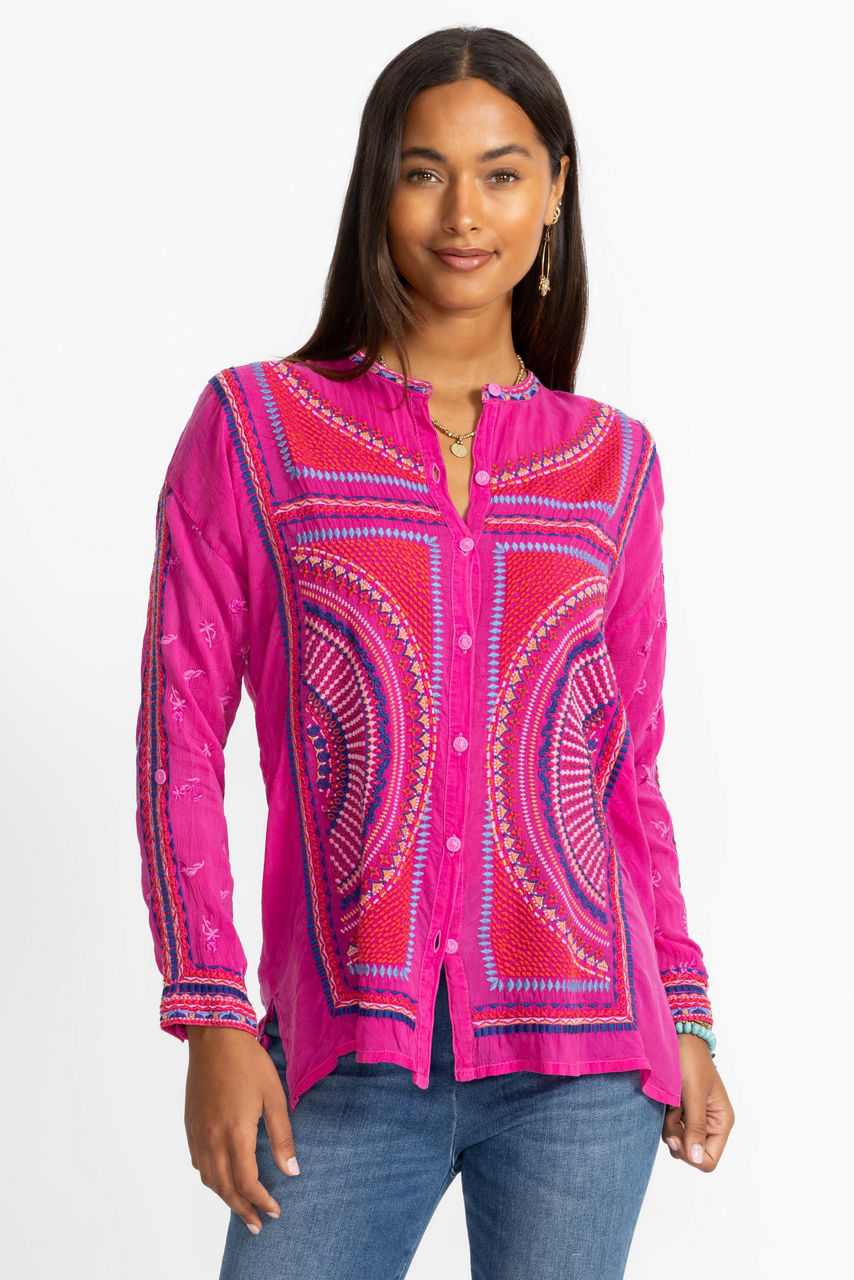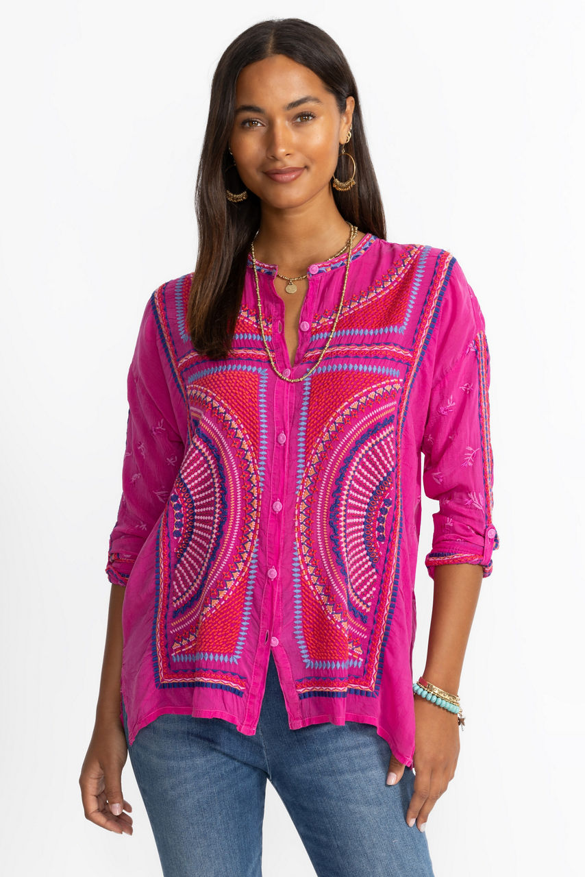 Beautifully defined with intricate embroidered details in vibrant colors, the Audrey Mandarin Collar Shirt offers a fresh alternative to a classic button-down. Featuring a mandarin collar and drop-shoulder sleeves with roll-tab cuffs, this shirt is both visually stunning and perfectly practical. Pair with a bold pencil skirt and kitten heels for an updated work look.