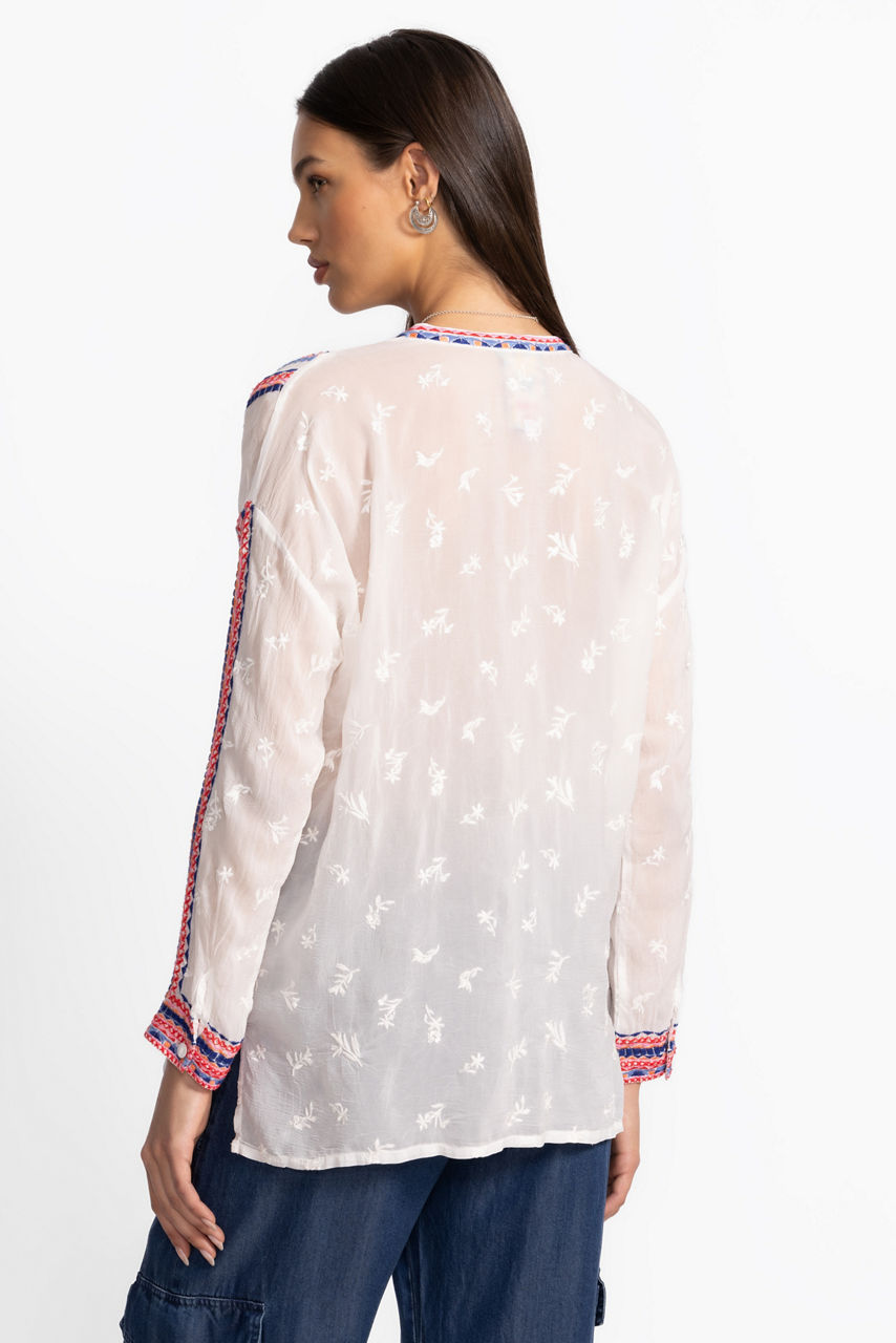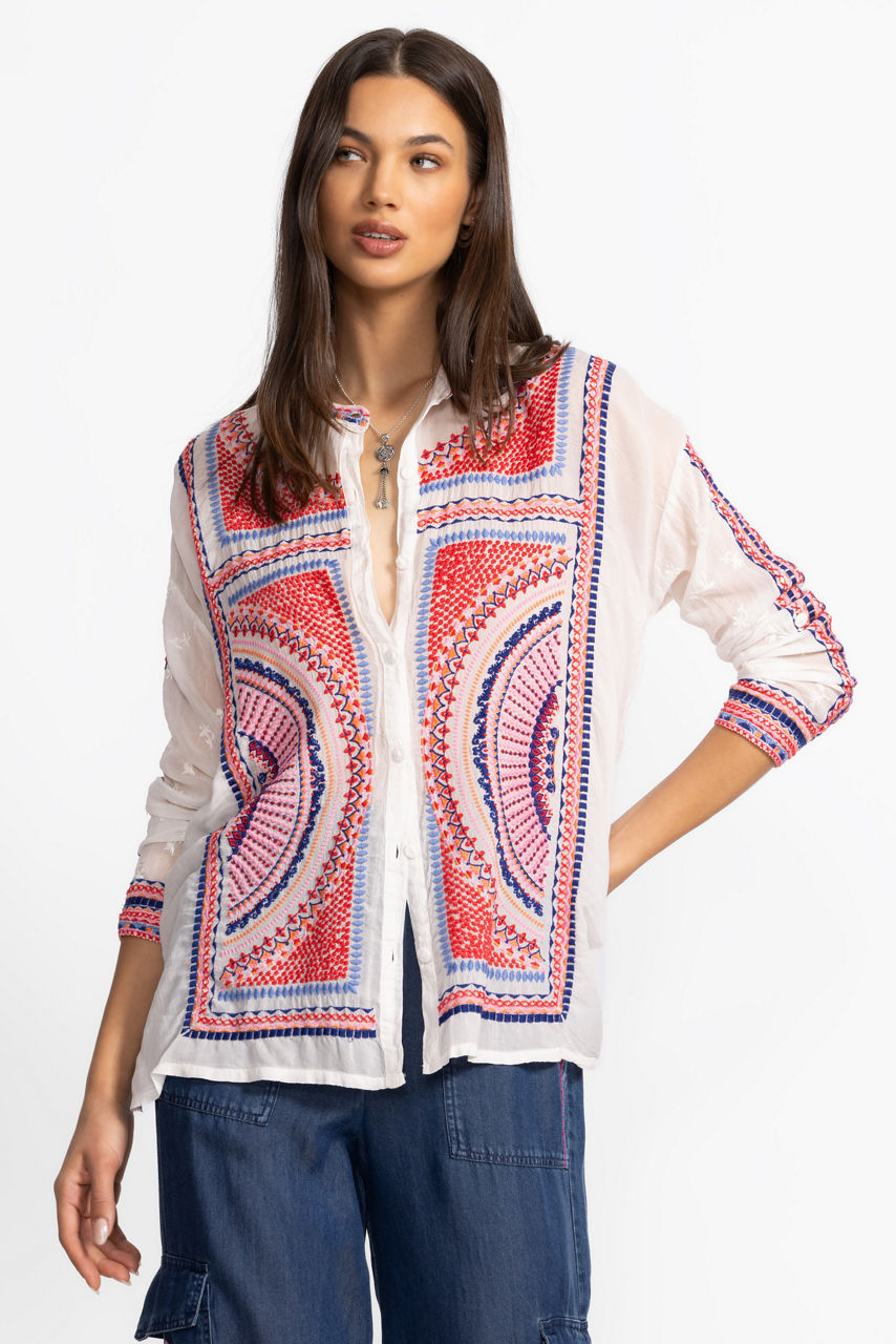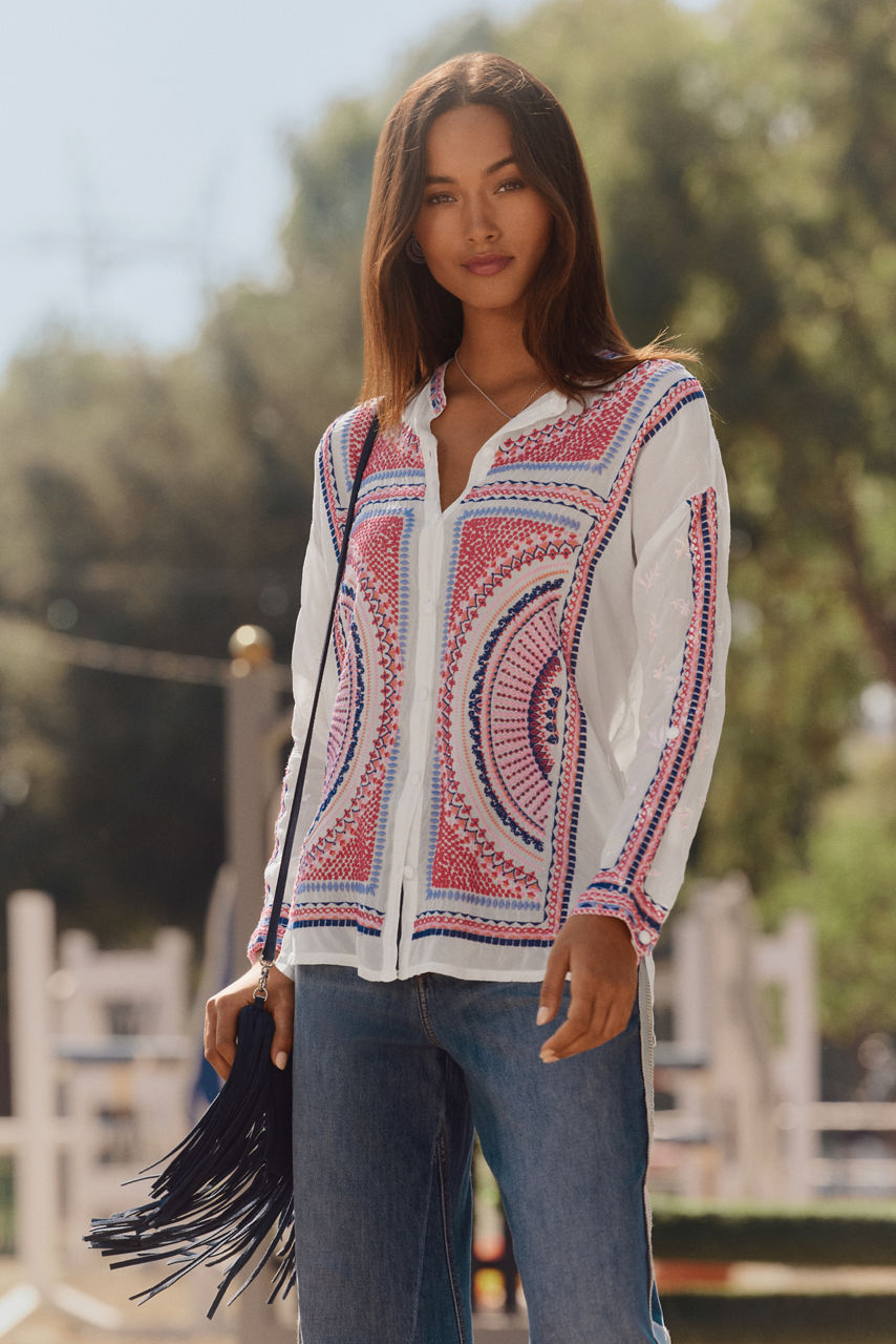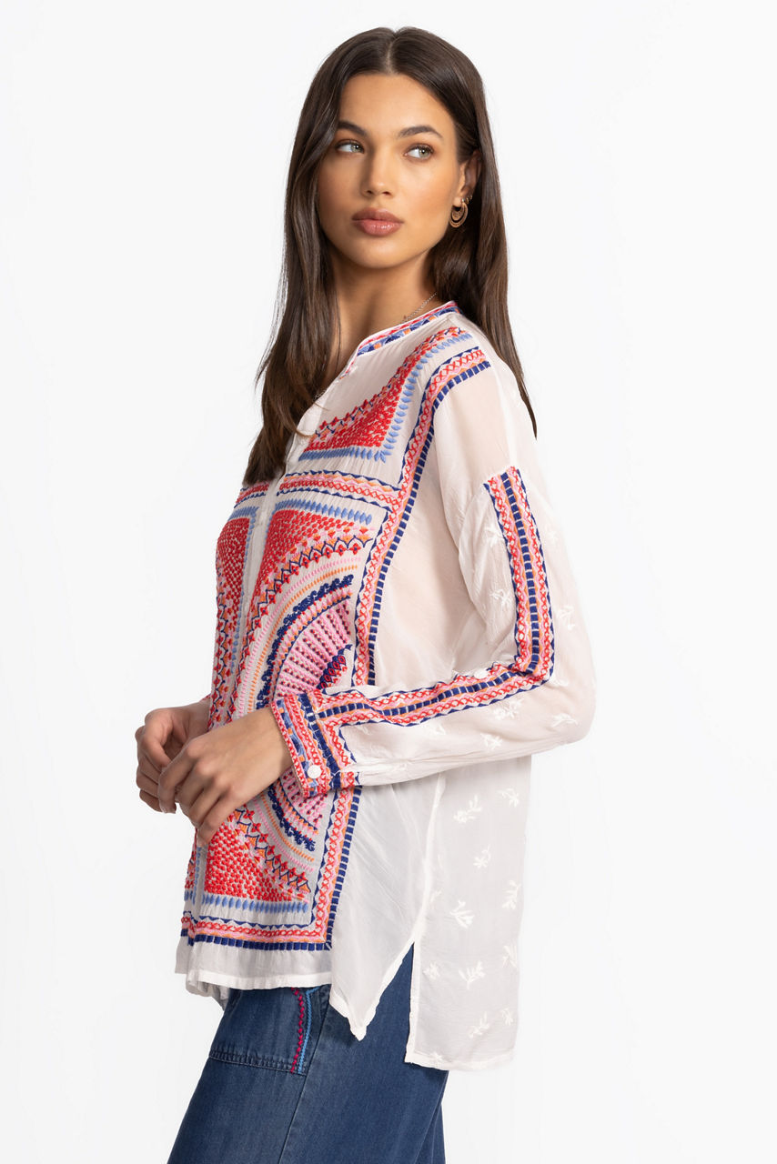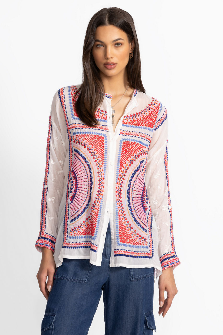 Beautifully defined with intricate embroidered details in vibrant colors, the Audrey Mandarin Collar Shirt offers a fresh alternative to a classic button-down. Featuring a mandarin collar and drop-shoulder sleeves with roll-tab cuffs, this shirt is both visually stunning and perfectly practical. Pair with a bold pencil skirt and kitten heels for an updated work look.
