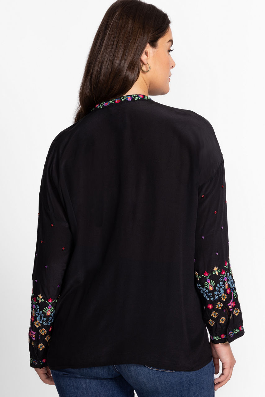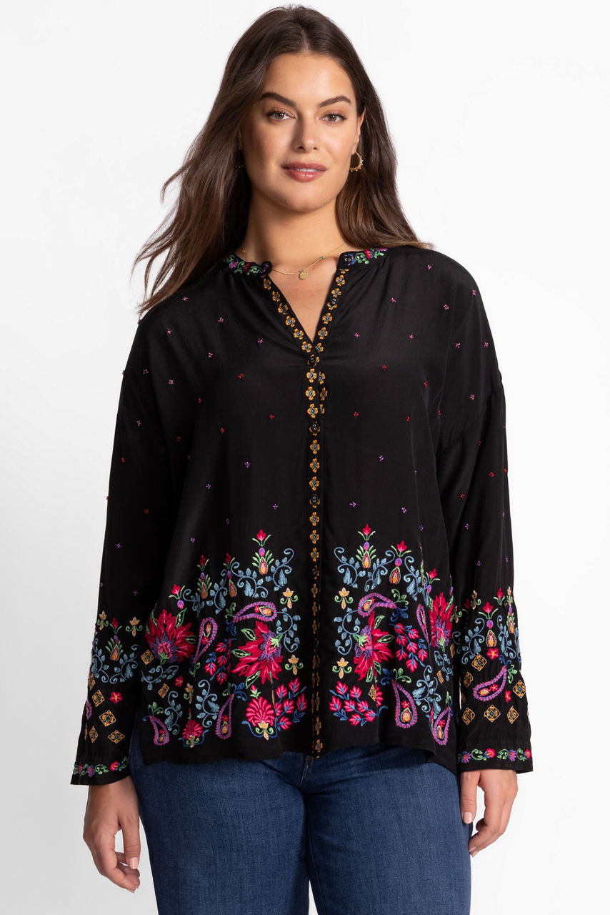 Washed in rich earth tones, the Teresa Audrey Mandarin Collar Shirt is embellished with intricate embroidered detailing for a textured effect. Crafted from 100% silk, this shirt features a mandarin collar and drop shoulder and is finished with roll-tab sleeves and side slits for an effortless fit. Pair with fitted denim and trendy flats for a polished casual look.