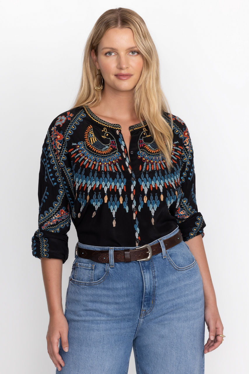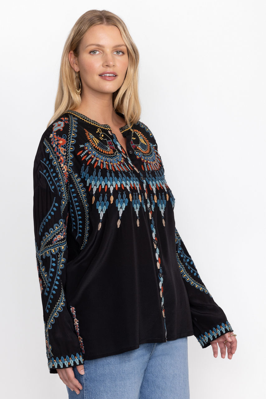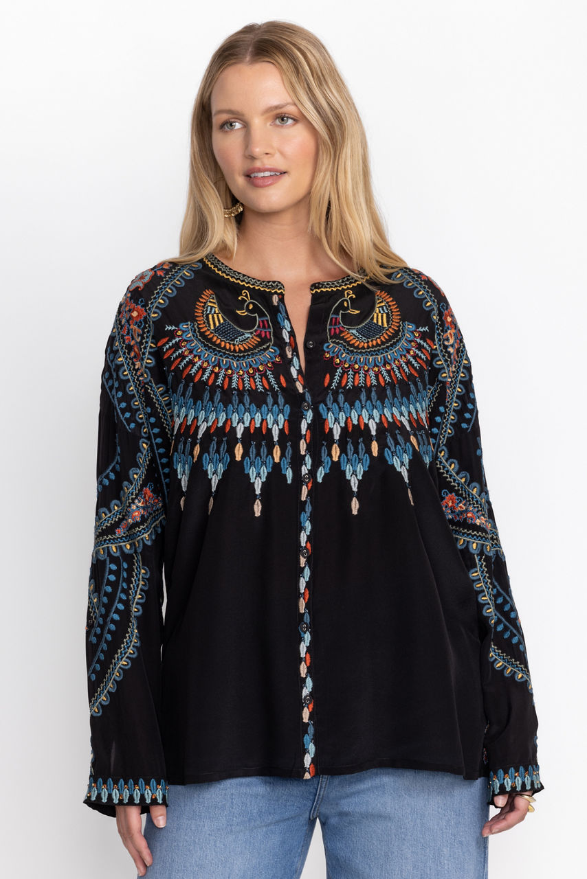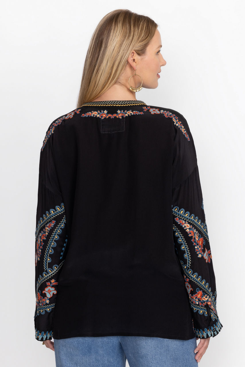 With its striking pops of colorful embroidery and beautiful silk fabrication, the Audrey Mandarin Tunic is an elegant statement-maker, while its relaxed silhouette makes it as comfortable as it is stylish. Wear it on its own or layer over pants for superior wardrobe versatility.