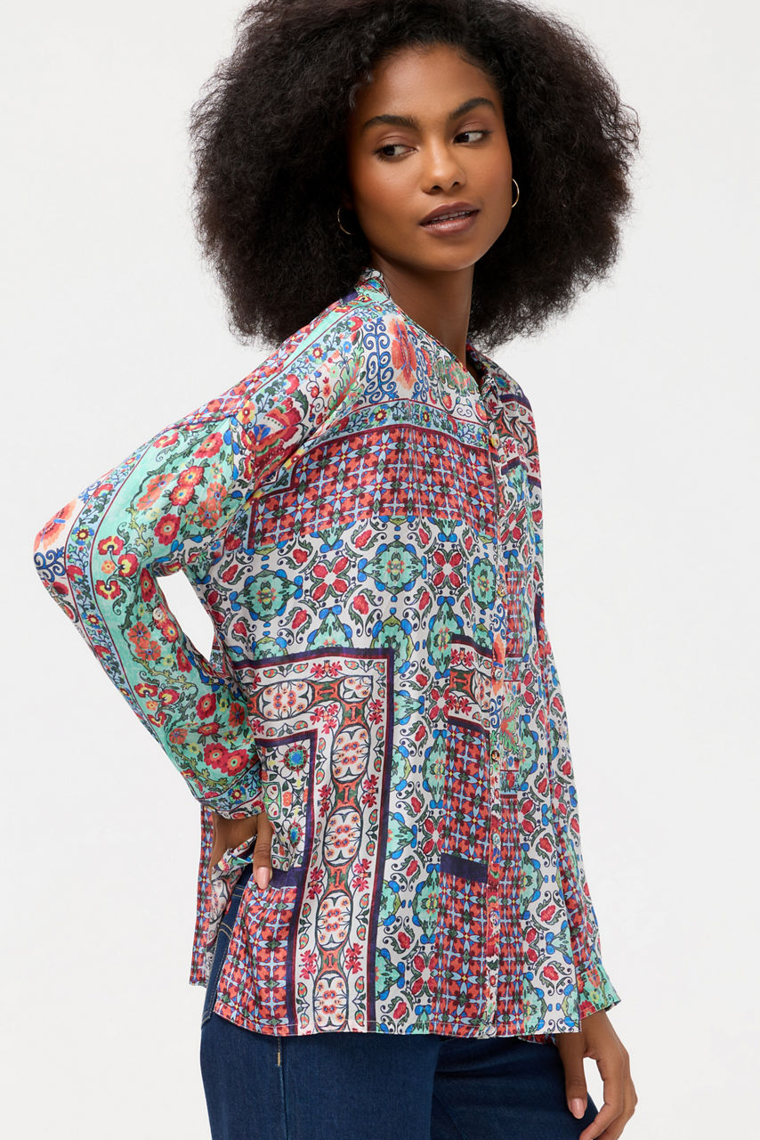Crafted from 100% luxurious silk, the Audrey Oversized Blouse offers striking color with a relaxed feel. Featuring a unique mix of vibrant florals and bold stripes in an oversized fit, this blouse is equal parts comfort and luxury. Pair with skinny jeans and stylish flats for a complete ensemble.
