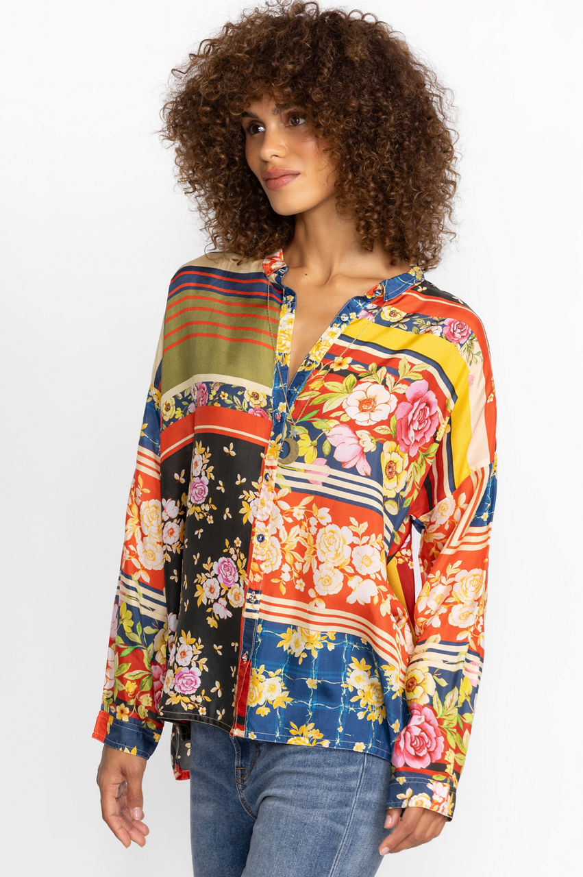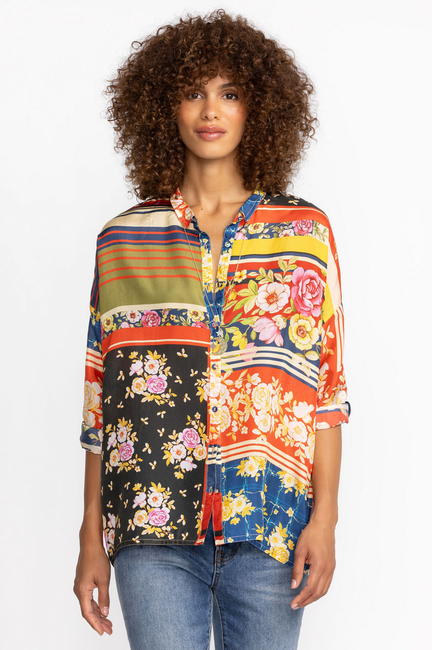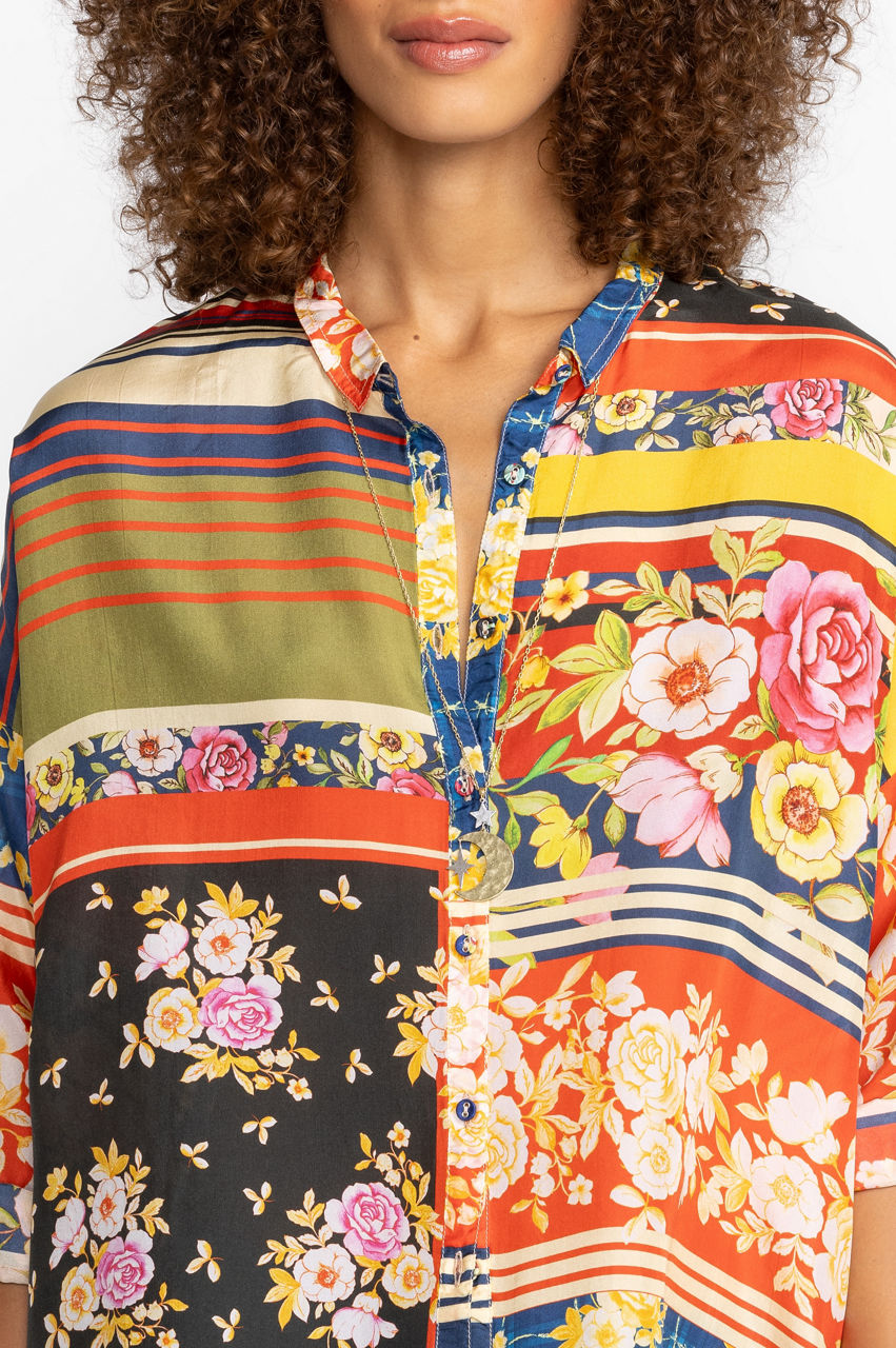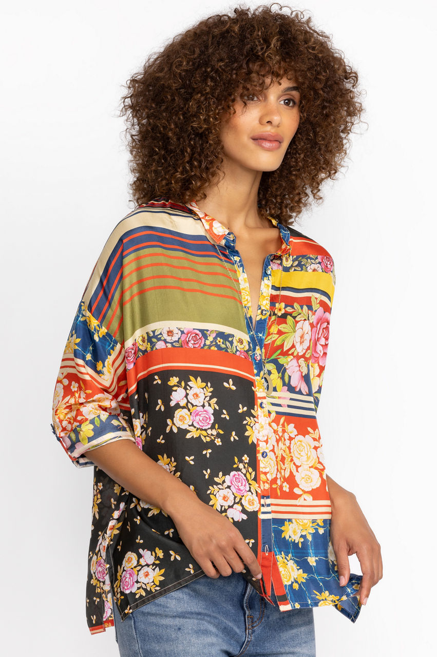Crafted from 100% luxurious silk, the Audrey Oversized Blouse offers striking color with a relaxed feel. Featuring a unique mix of vibrant florals and bold stripes in an oversized fit, this blouse is equal parts comfort and luxury. Pair with skinny jeans and stylish flats for a complete ensemble.