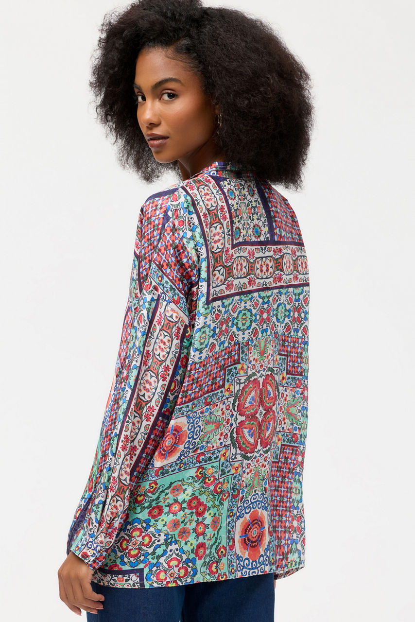 Crafted from 100% luxurious silk, the Audrey Oversized Blouse offers striking color with a relaxed feel. Featuring a unique mix of vibrant florals and bold stripes in an oversized fit, this blouse is equal parts comfort and luxury. Pair with skinny jeans and stylish flats for a complete ensemble.