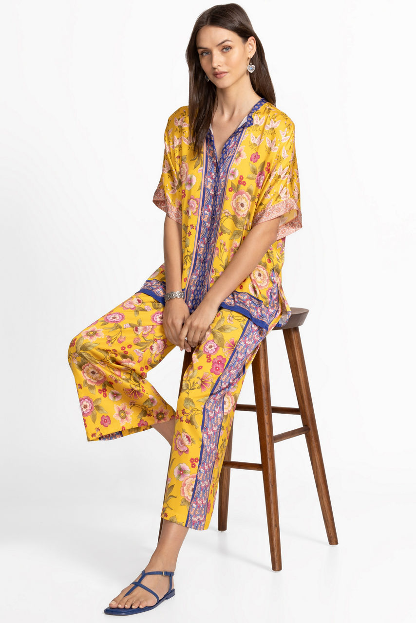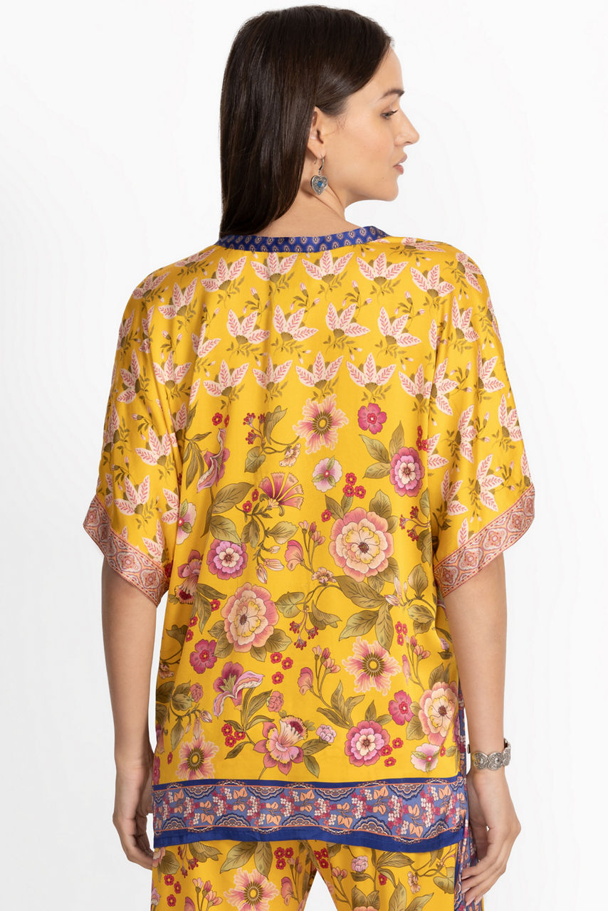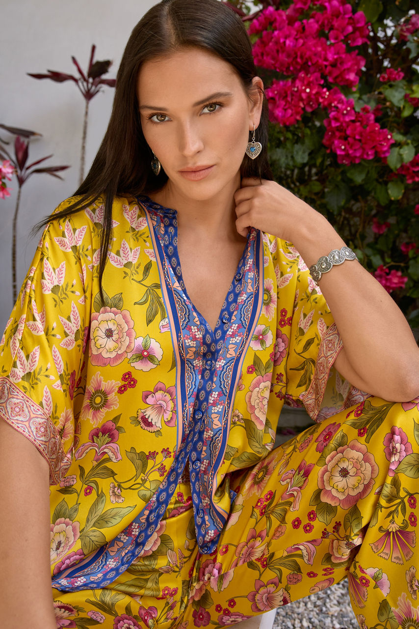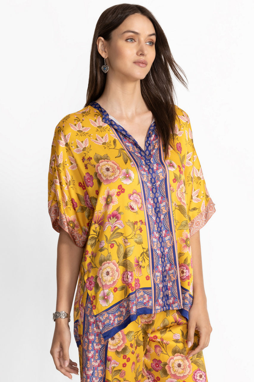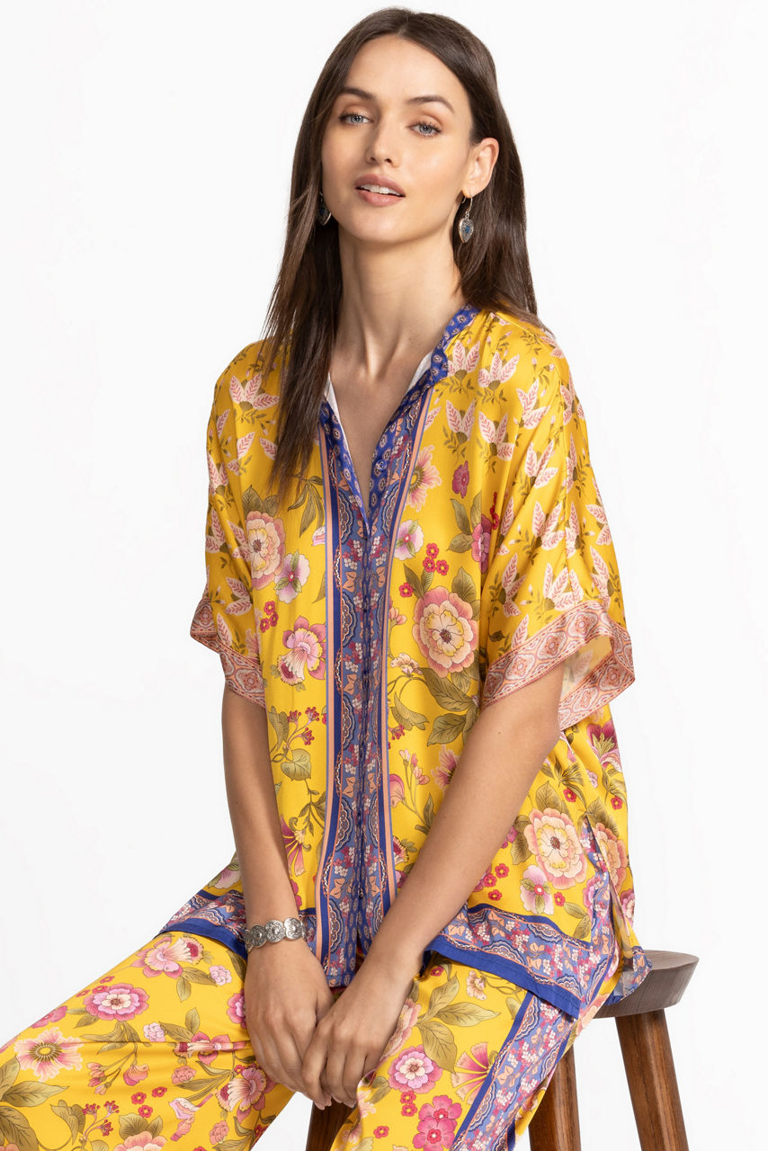 Adorned with brilliant color and a vibrant floral print, the Audrey Short Sleeve Mandarin Collar Tunic is crafted from a unique silk blend. Featuring a mandarin collar and elbow-length Dolman sleeves, this button-down shirt is finished with side slits for a relaxed fit. Pair with trousers and coordinating flats for a fresh business casual style.