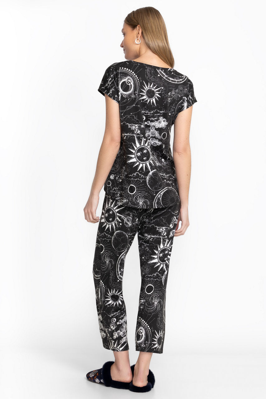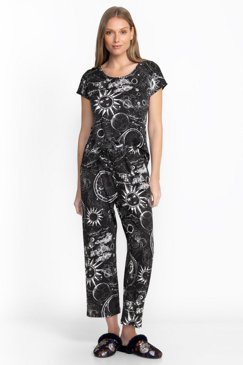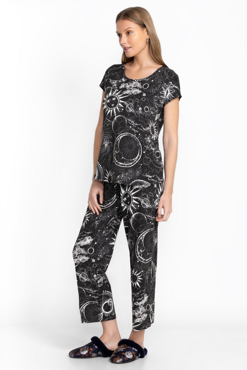 Designed for comfort and style, the Bobbie Crop Set is crafted from an incredibly soft cotton blend. Featuring a crewneck tee with short sleeves and coordinating cropped pants with a comfortable elastic waist, these pajamas are embellished with celestial icons for a dreamy look. Pair with a cozy robe and coordinating slippers for a night in.