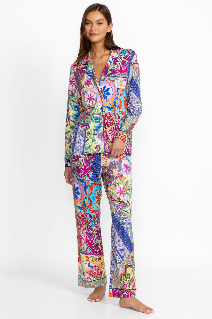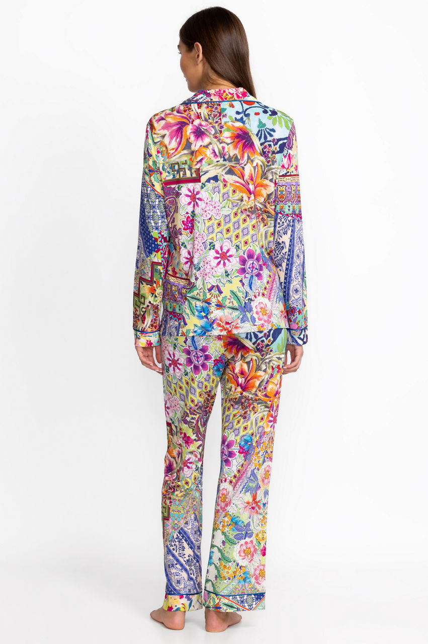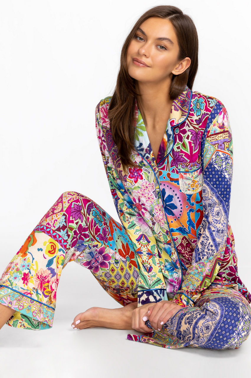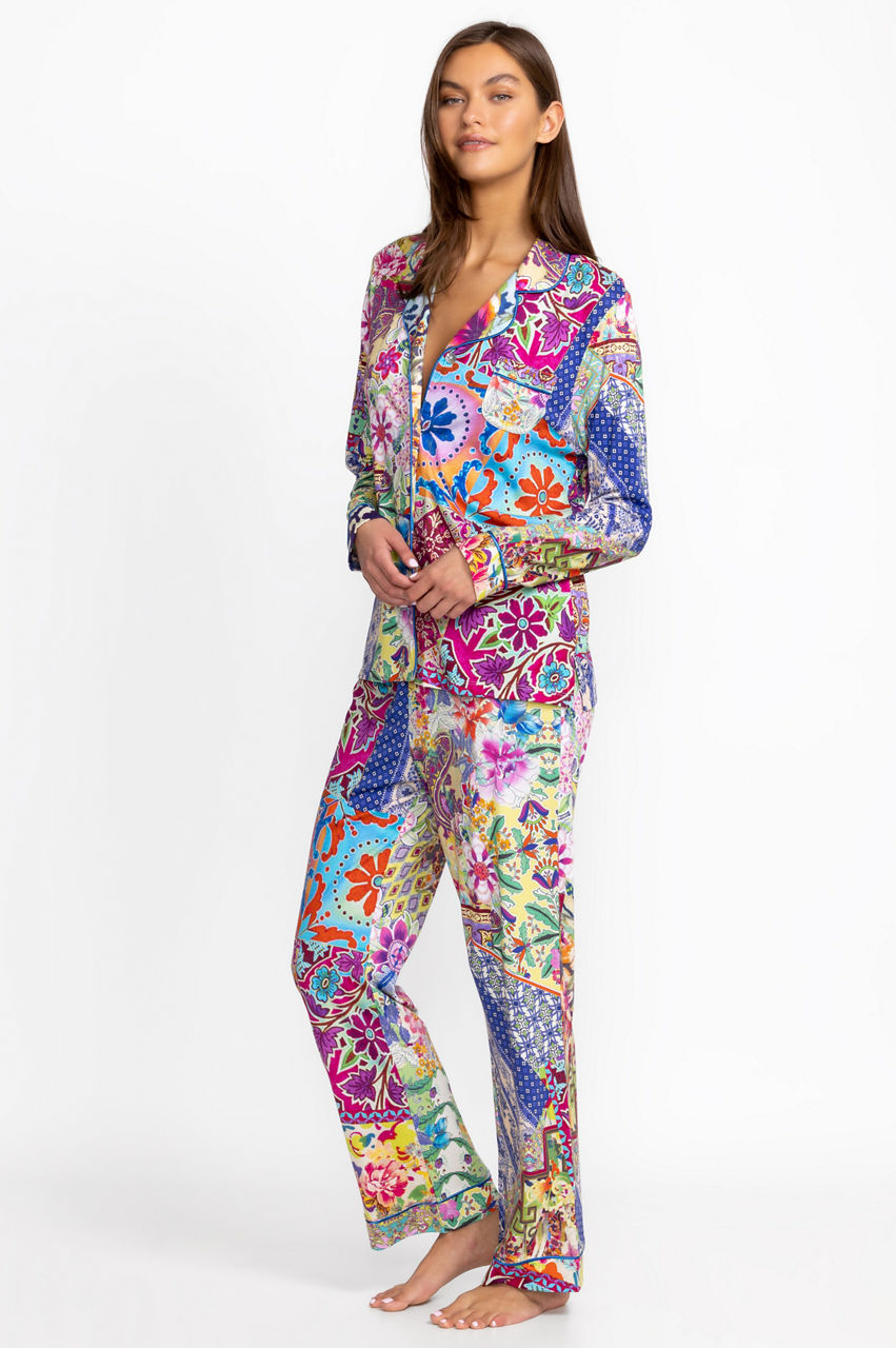 Designed for comfort and style, the Carly PJ Set is crafted from a soft cotton blend. Featuring a long sleeve button-front and coordinating relaxed fit pants with a comfortable elastic waist, these pajamas are finished in charming prints for feel-good lounging, day or night. Pair with a cozy robe and matching slippers for a night in.