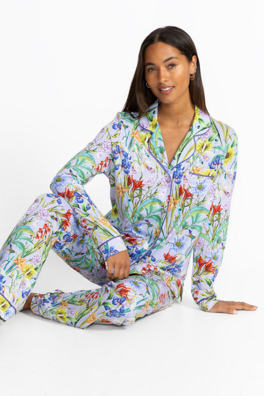 Designed for comfort and style, the Carly PJ Set is crafted from a soft cotton blend. Featuring a long sleeve button-front and coordinating wide-leg pants with a comfortable elastic waist, these pajamas are embellished with celestial icons for a dreamy look. Pair with a cozy robe and matching slippers for a night in.