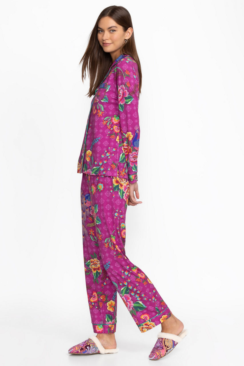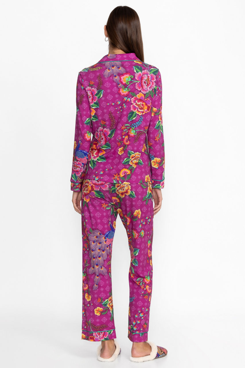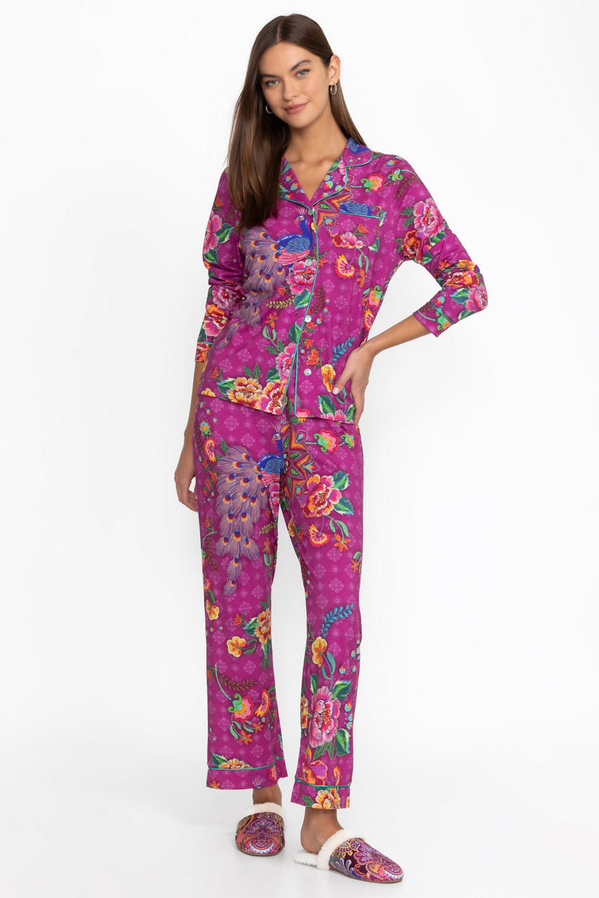 Designed for comfort and style, the Carly PJ Set is crafted from a soft cotton blend. Featuring a long sleeve button-front and coordinating wide-leg pants with a comfortable elastic waist, these pajamas are embellished with celestial icons for a dreamy look. Pair with a cozy robe and matching slippers for a night in.