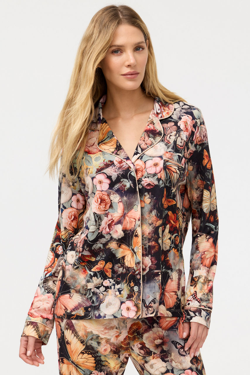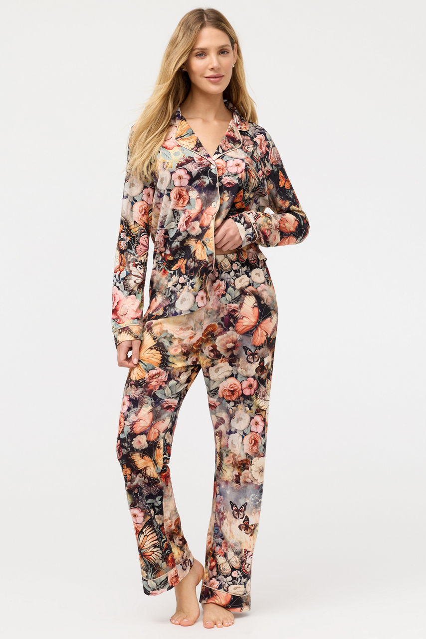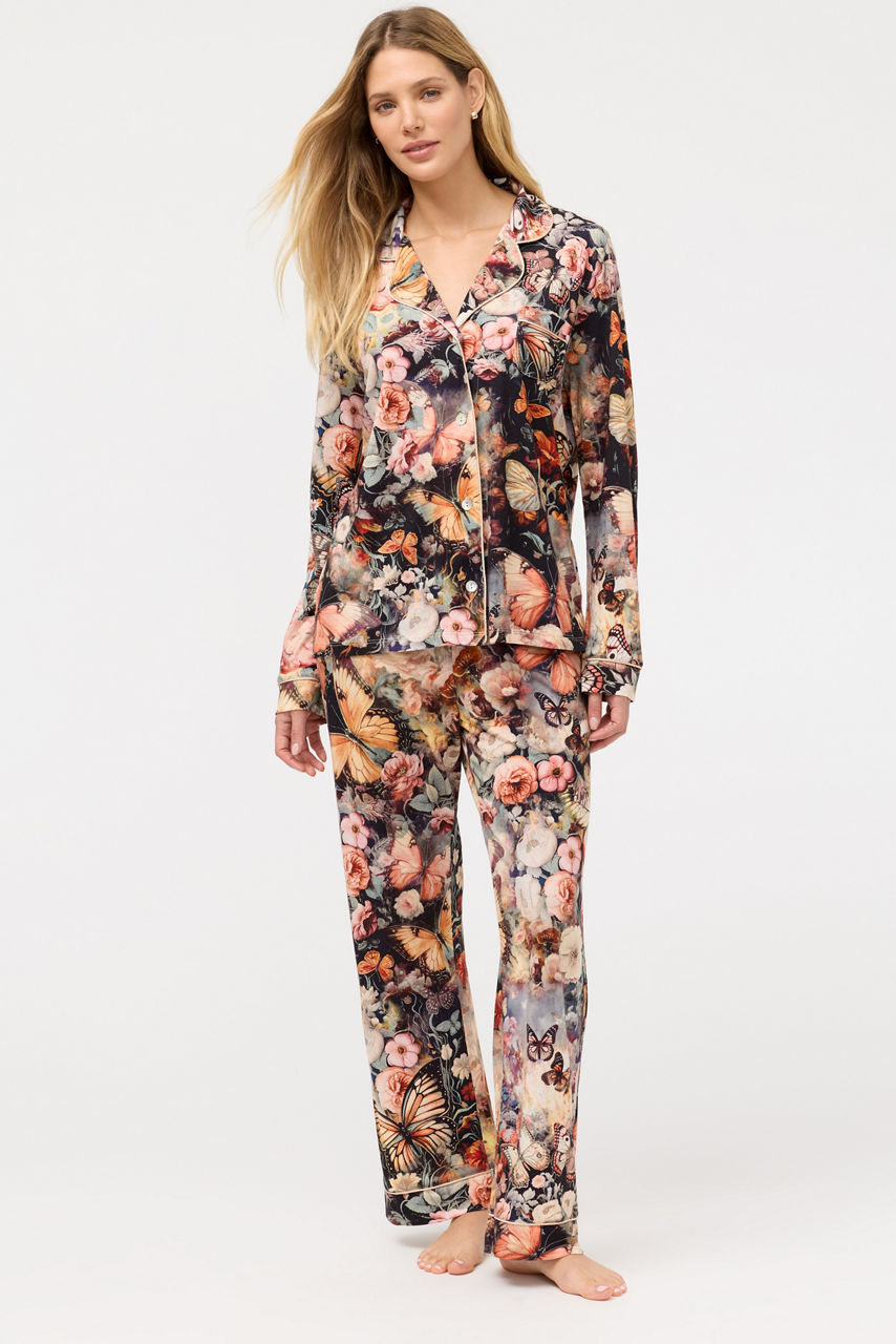 Designed for comfort and style, the Carly PJ Set is crafted from a soft cotton blend. Featuring a long sleeve button-front and coordinating relaxed fit pants with a comfortable elastic waist, these pajamas are embellished with celestial icons for a dreamy look. Pair with a cozy robe and matching slippers for a night in.