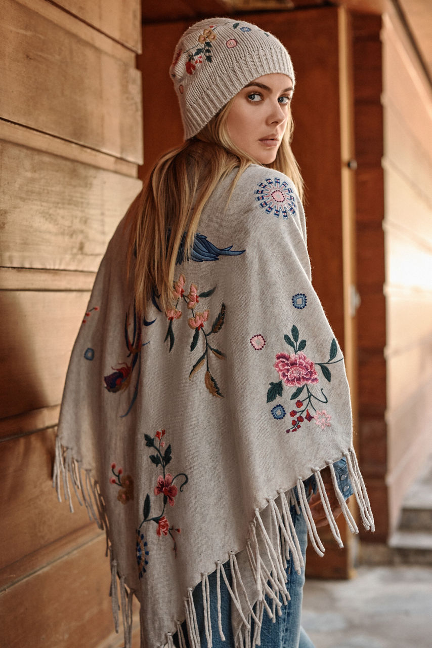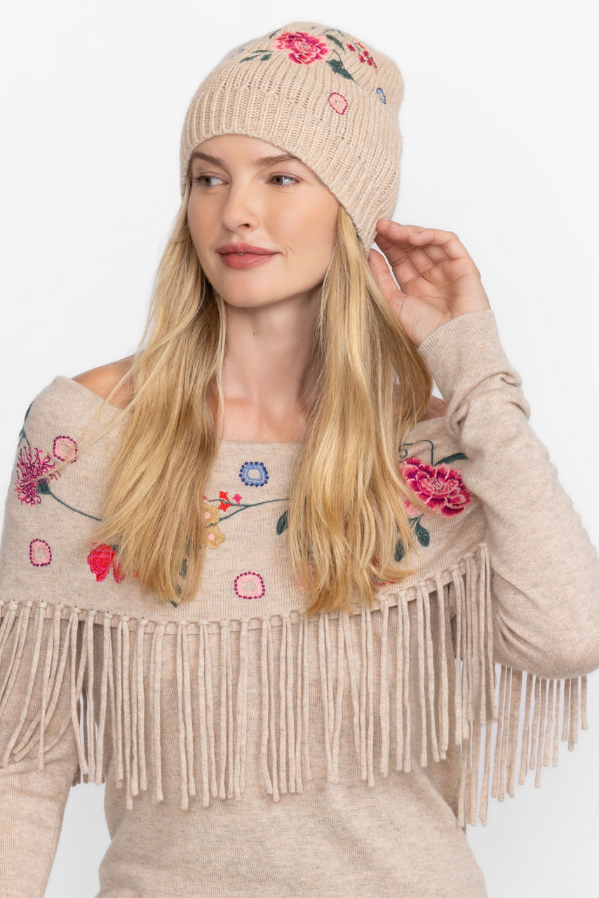 Crafted from an exquisite wool and cashmere blend, the Nikkola Classic Beanie is a luxurious cold weather accessory. Featuring vibrant floral embroidered detailing for a splash of color, this neutral beanie is finished with a ribbed trim. Pair with a sleek overcoat and boots for a cozy wintry look.