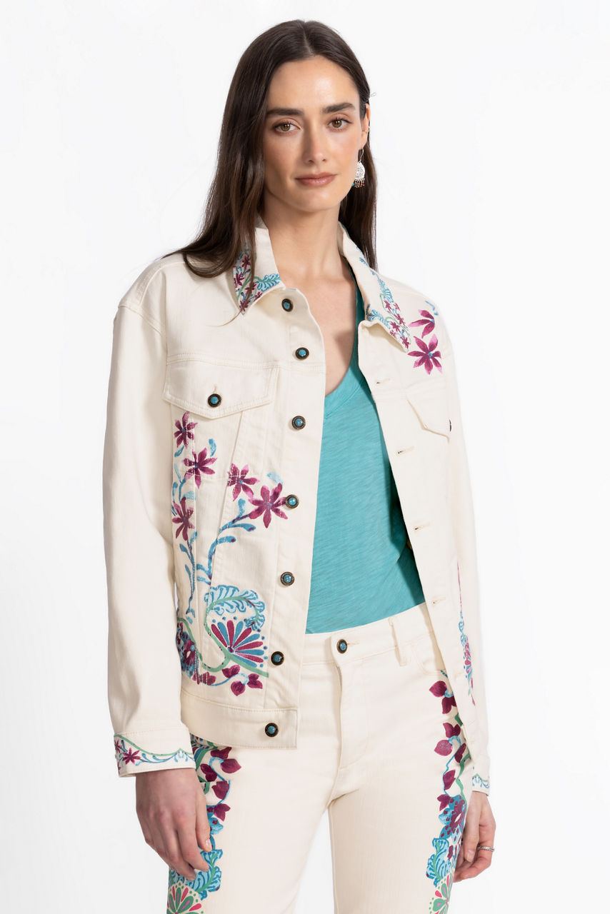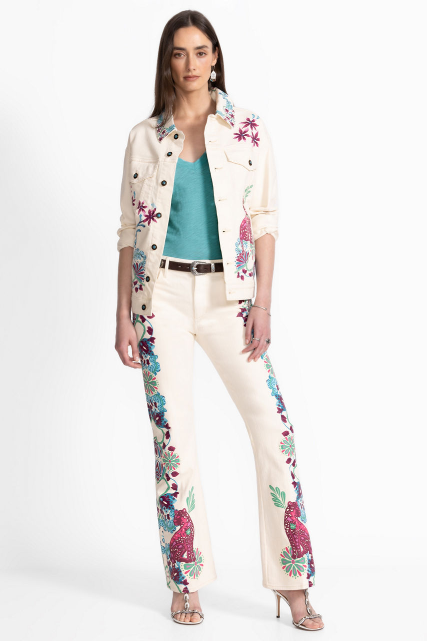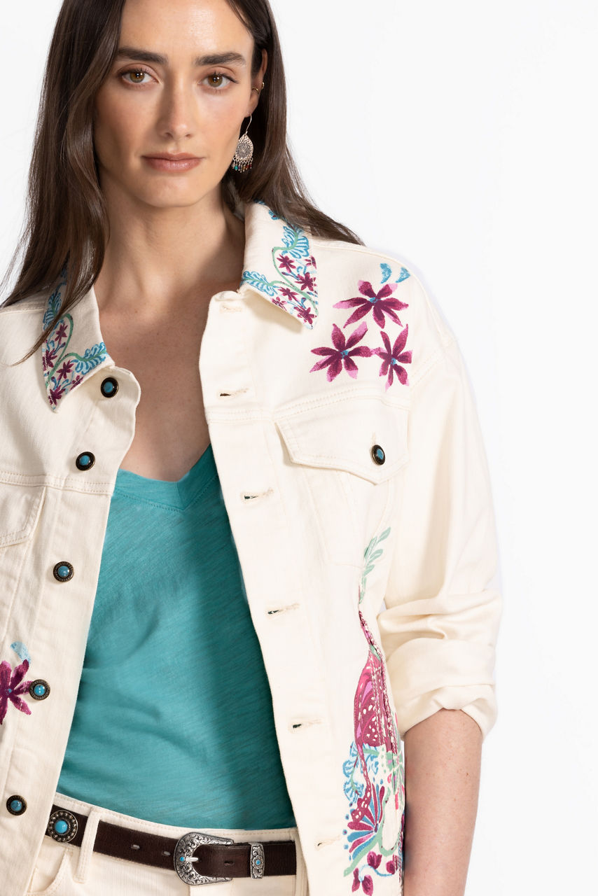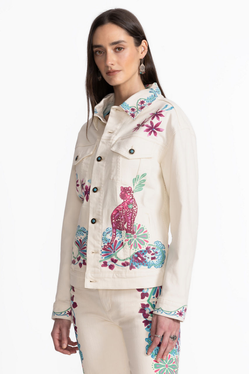 Fashioned from luxurious cream-colored denim, the Leilana Classic Denim Jacket offers a refreshing update to a classic wardrobe staple. Crafted from a cotton blend with a hint of stretch, this casual jacket offers slip pockets and is finished with a brilliant print depicting vibrant flora and fauna. Pair with dark wash denim and a coordinating silk cami for a fun night out with friends.