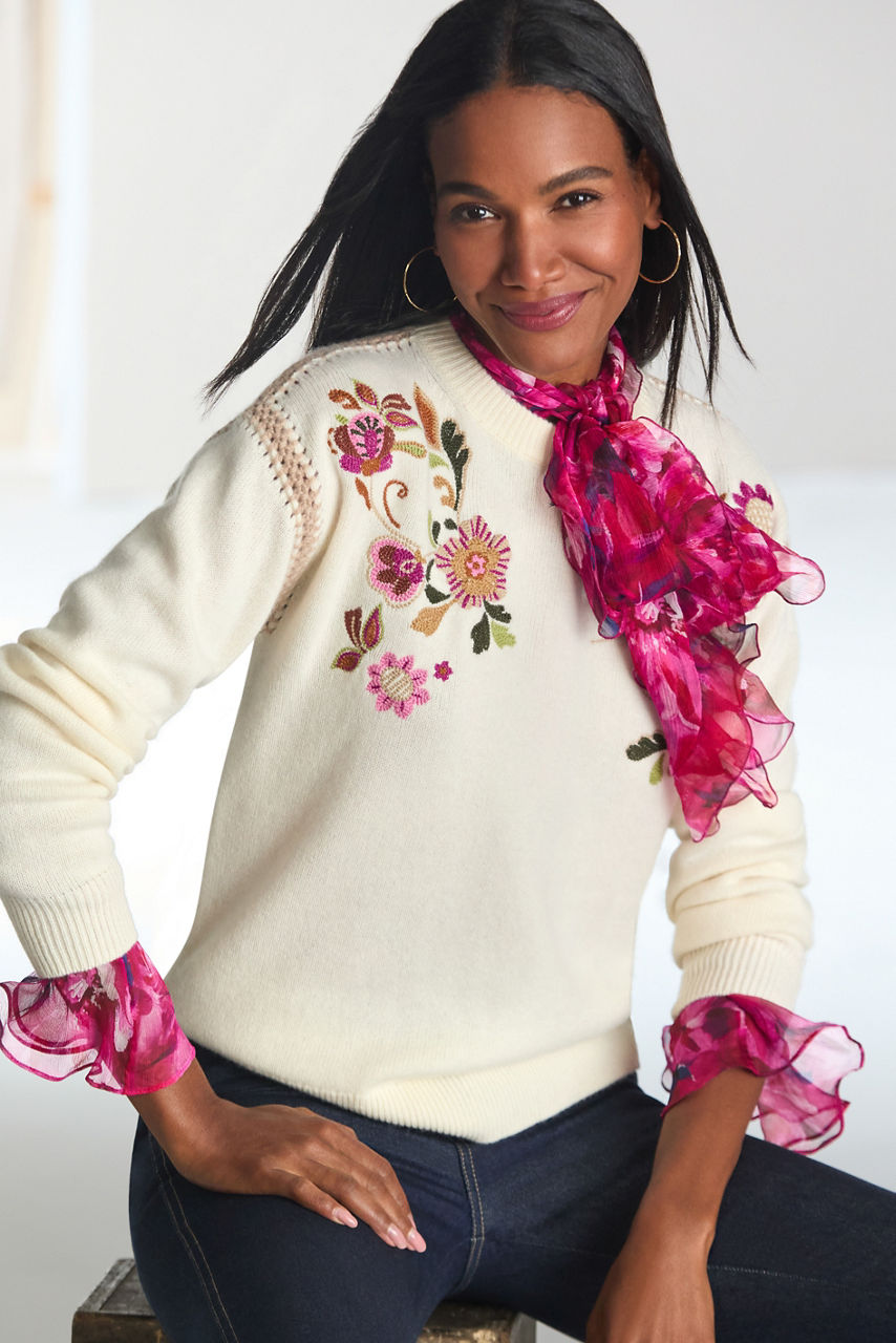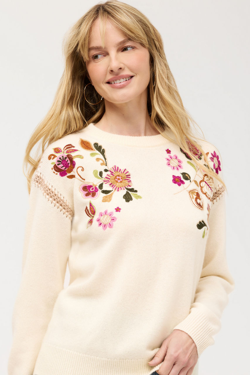 The Crew Neck Whipstitch Pullover is crafted from a cozy wool and cashmere blend. Designed with a crew neckline, this pullover features whipstitch detailing at the shoulder and sleeve seams and is finished with intricate floral embroidered details for a splash of color. Pair with casual denim and at the Maxima Classic Beanie for a perfectly coordinated cool weather ensemble.