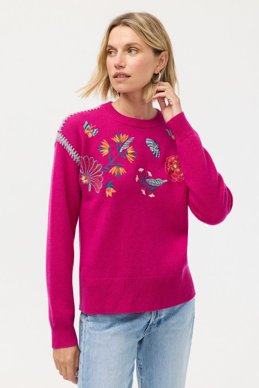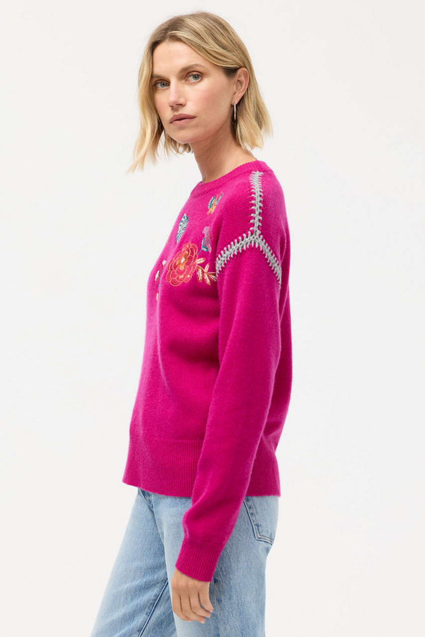Crafted from a luxurious blend of wool and cashmere, the Dreamstate Flora Crew Neck Whipstitch Pullover is washed in vibrant color. Designed with a Crew neckline and long sleeves, this cozy pullover is embellished with intricately embroidered detailing in a bold floral pattern. Pair with wide-leg jeans and cozy ankle boots for a modern casual look.