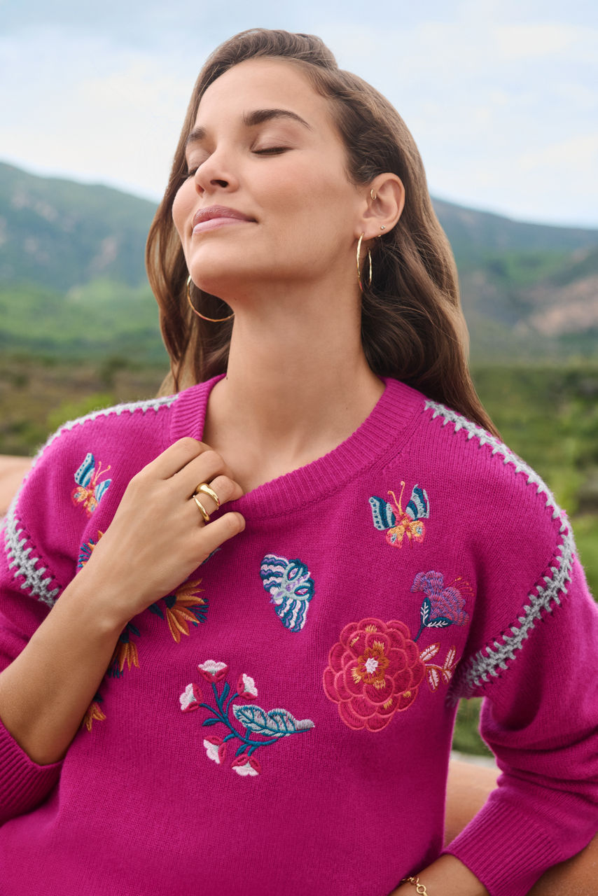 Crafted from a luxurious blend of wool and cashmere, the Dreamstate Flora Crew Neck Whipstitch Pullover is washed in vibrant color. Designed with a Crew neckline and long sleeves, this cozy pullover is embellished with intricately embroidered detailing in a bold floral pattern. Pair with wide-leg jeans and cozy ankle boots for a modern casual look.