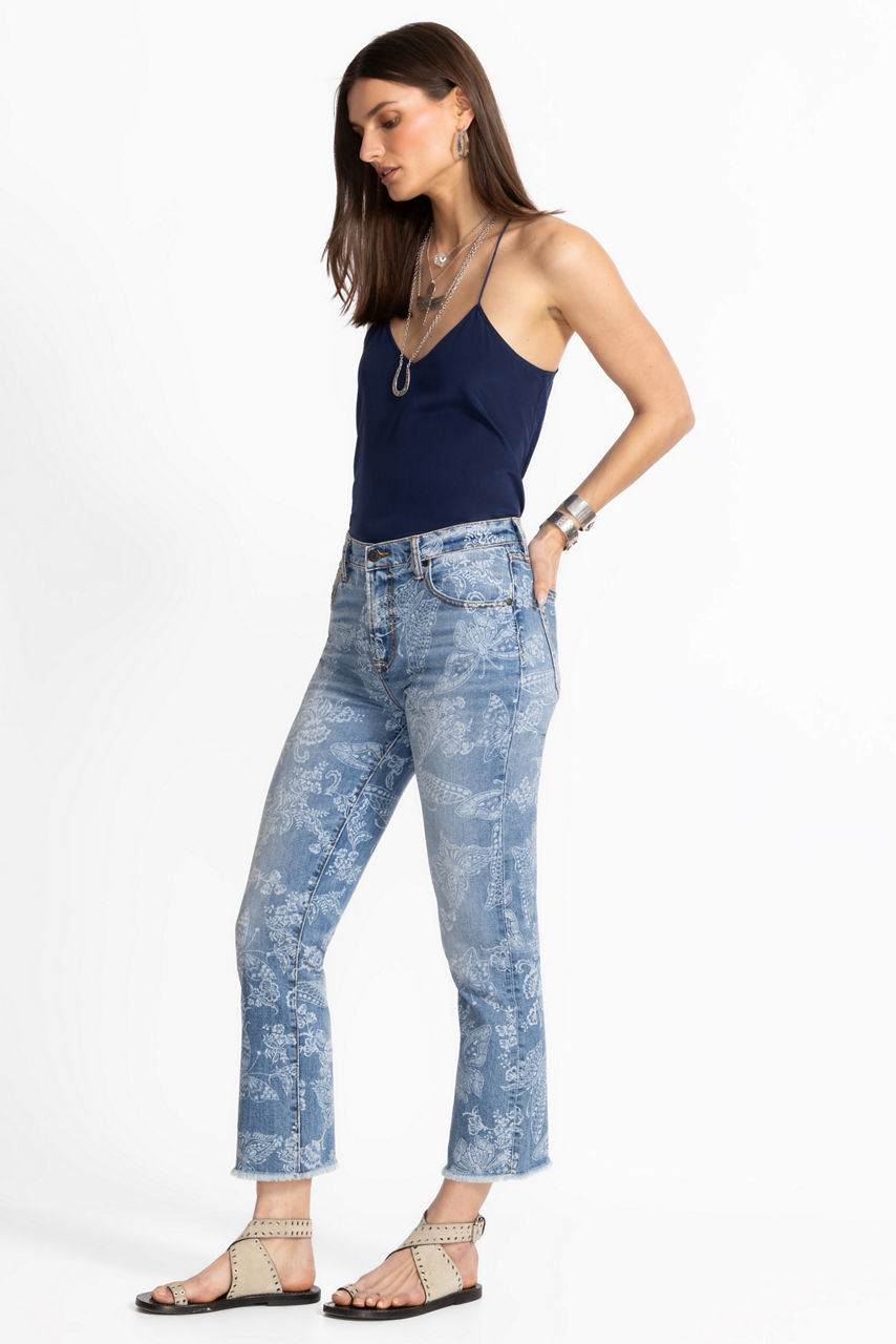 Beautifully embellished with an intricate pattern depicting delicate butterflies in flight, the Sydnee Cropped Baby Boot Jeans are crafted from a rich cotton blend with a hint of stretch. Designed with a front fly closure and a raw edge hem, these jeans are finished with a medium distressed wash for a unique look. Pair with a white eyelet top and comfortable sandals for a whimsical weekend look.