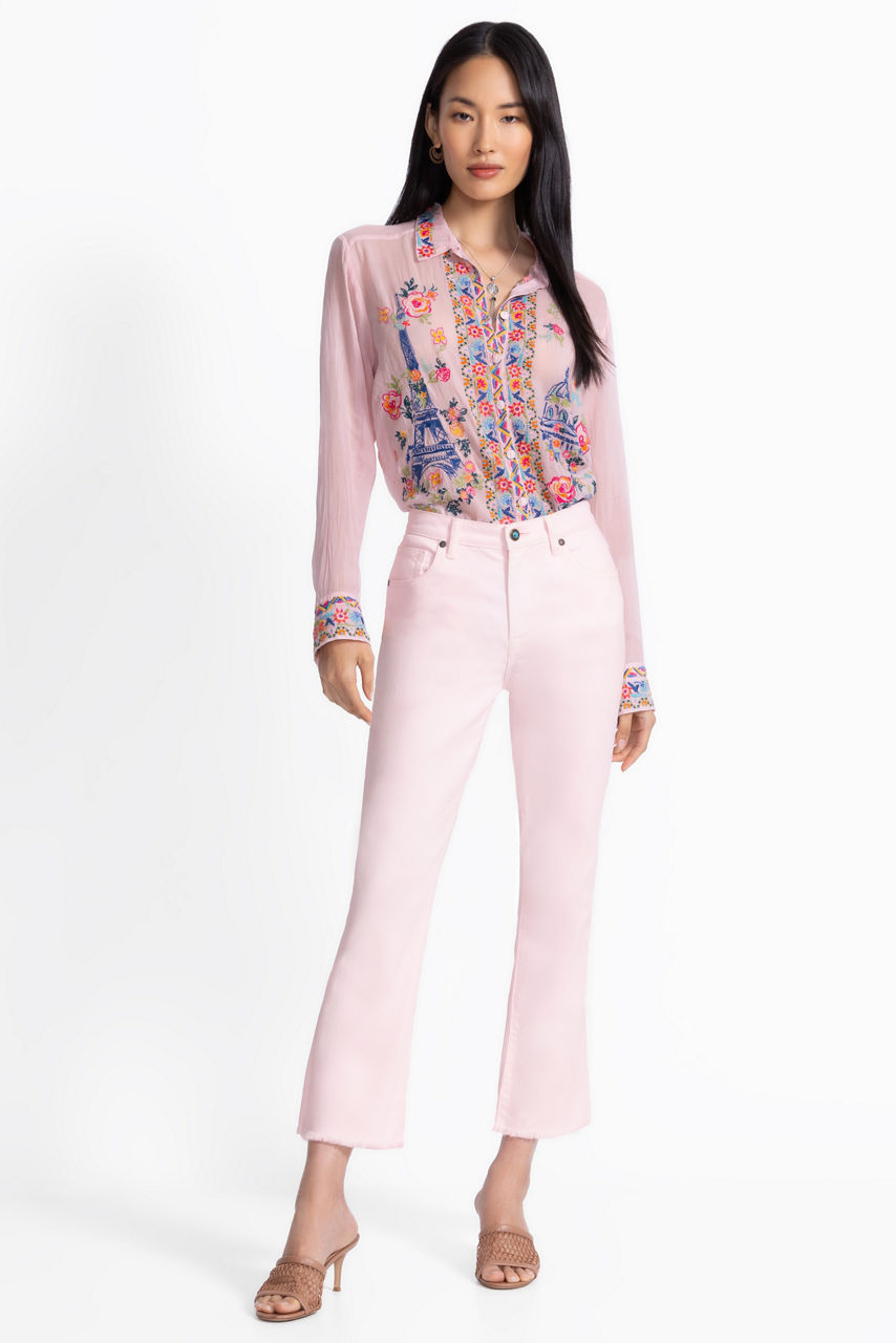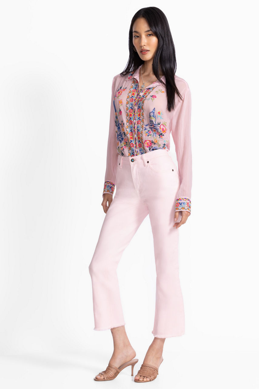 Crafted from a luxuriously soft cotton blend with a hint of stretch, the Willah Cropped Baby Boot Jeans are washed in a soft pastel hue. Featuring a zippered button-front and traditional 5-pocket design, these jeans are finished with raw hem edges. Pair with a lightweight pullover and fashion sneakers for a casual weekend look.