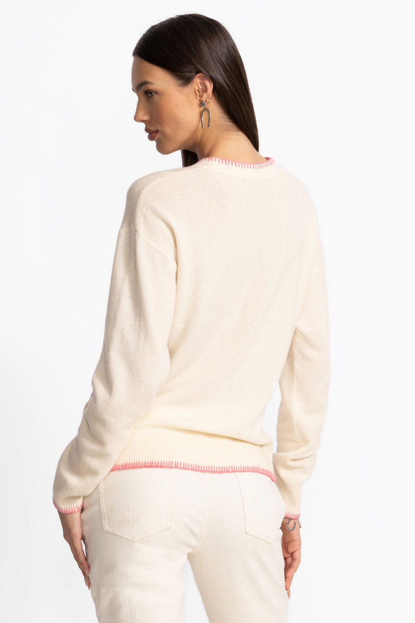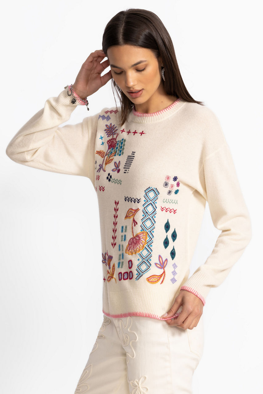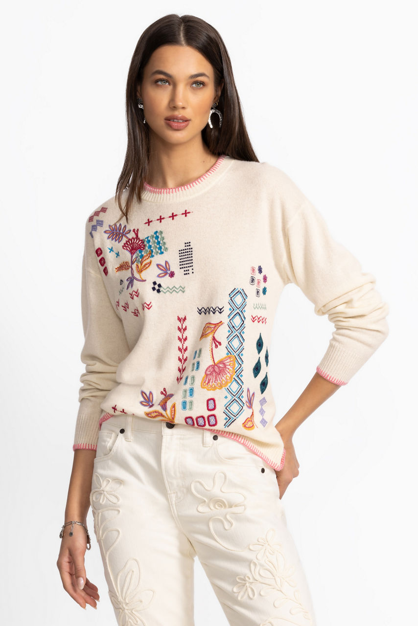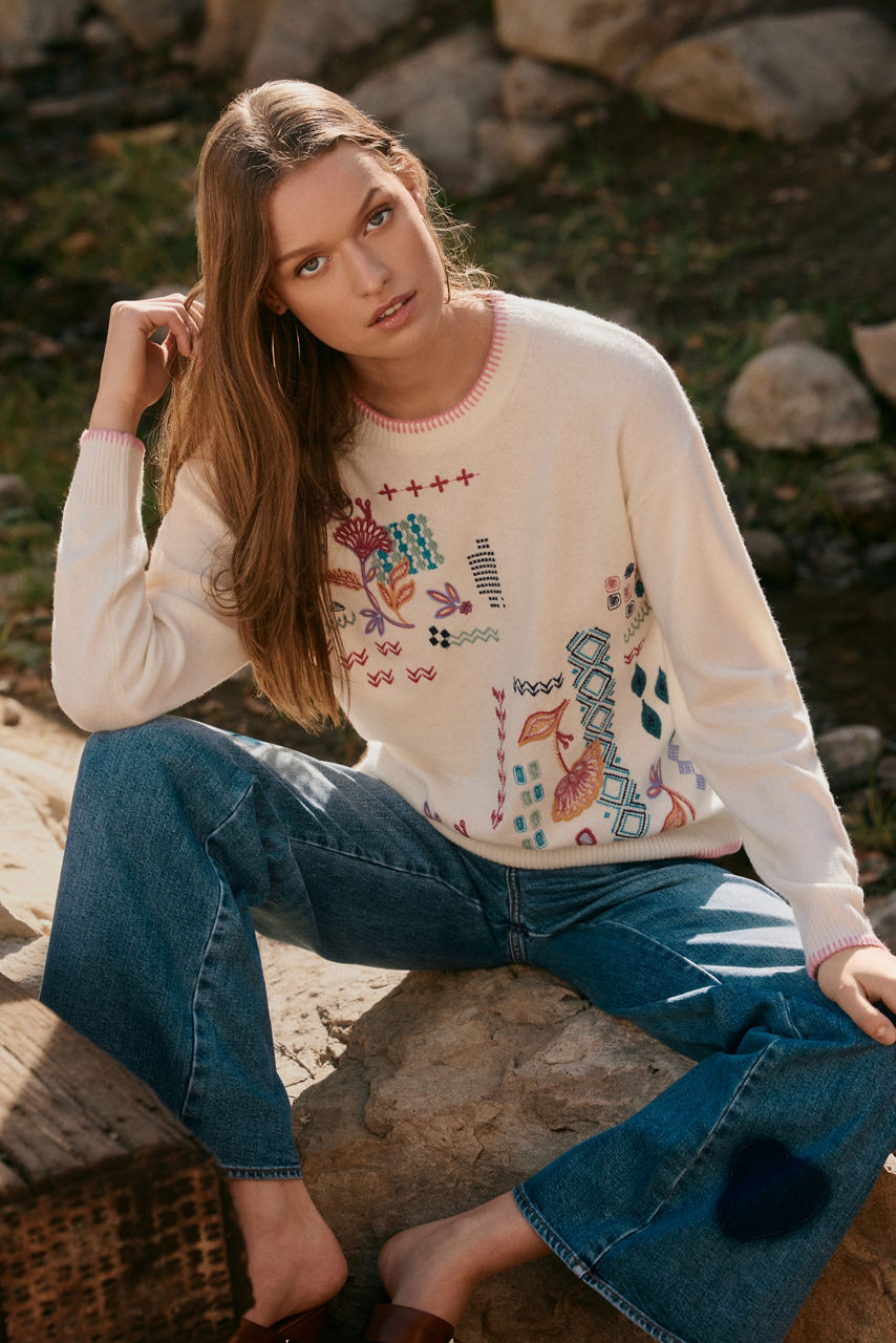 Crafted from a cozy wool and cashmere blend, the Drop Shoulder Pullover has a retro-inspired feel. Featuring a classic crew neckline and a relaxed dropped shoulder line, this casual sweater is embellished with playful embroidered details in an array of colors. Pair with the Karlee Denim Skirt for an elevated casual look.