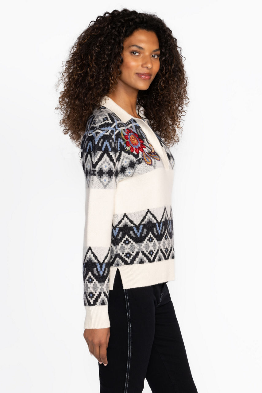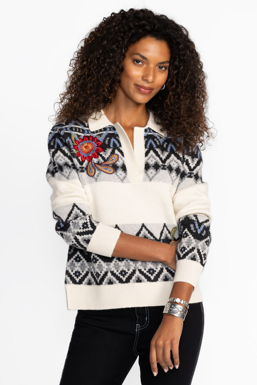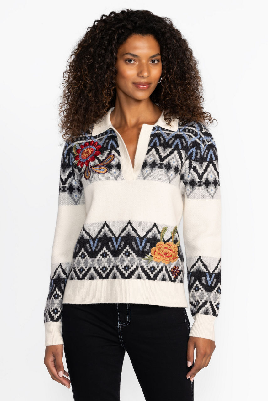 Intricately woven with a traditional Fairisle pattern, the Fairisle Polo Sweater is crafted from a luxurious wool and cashmere blend. Featuring a split polo neckline with a V-neck collar, this beautiful sweater is finished with intricately embroidered floral designs for a feminine feel. Pair with relaxed denim and hiking boots for a weekend outdoor adventure.