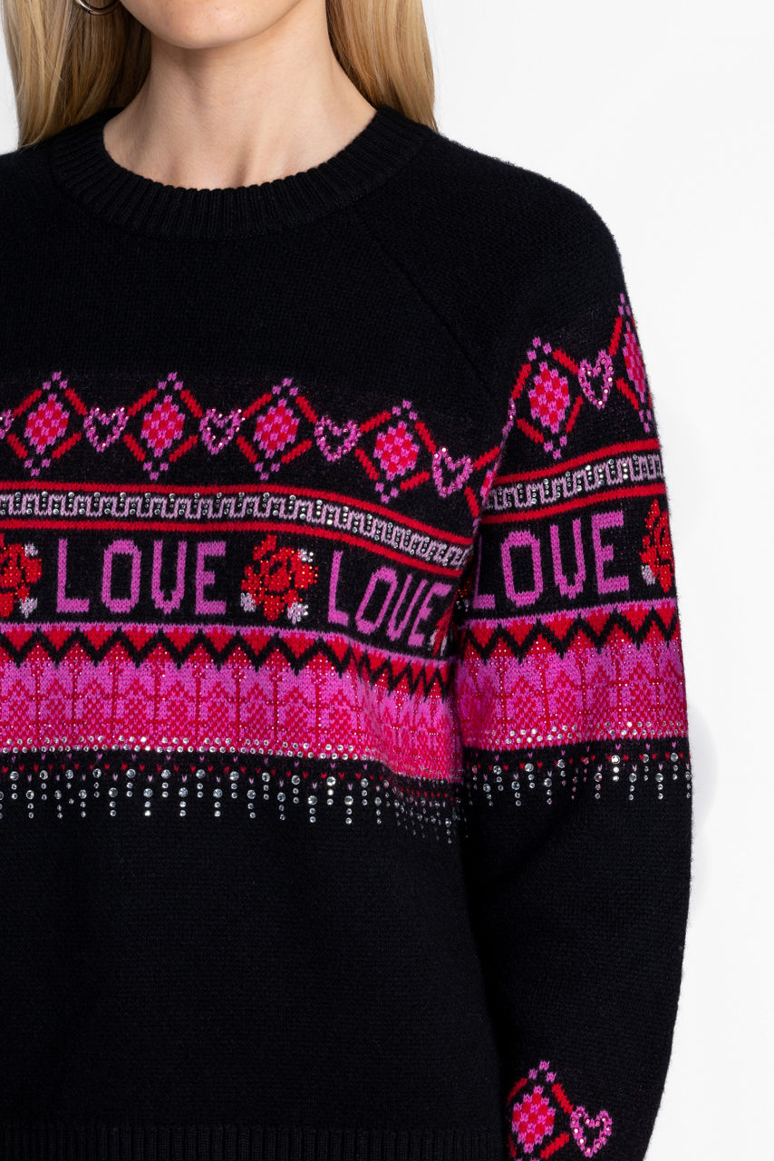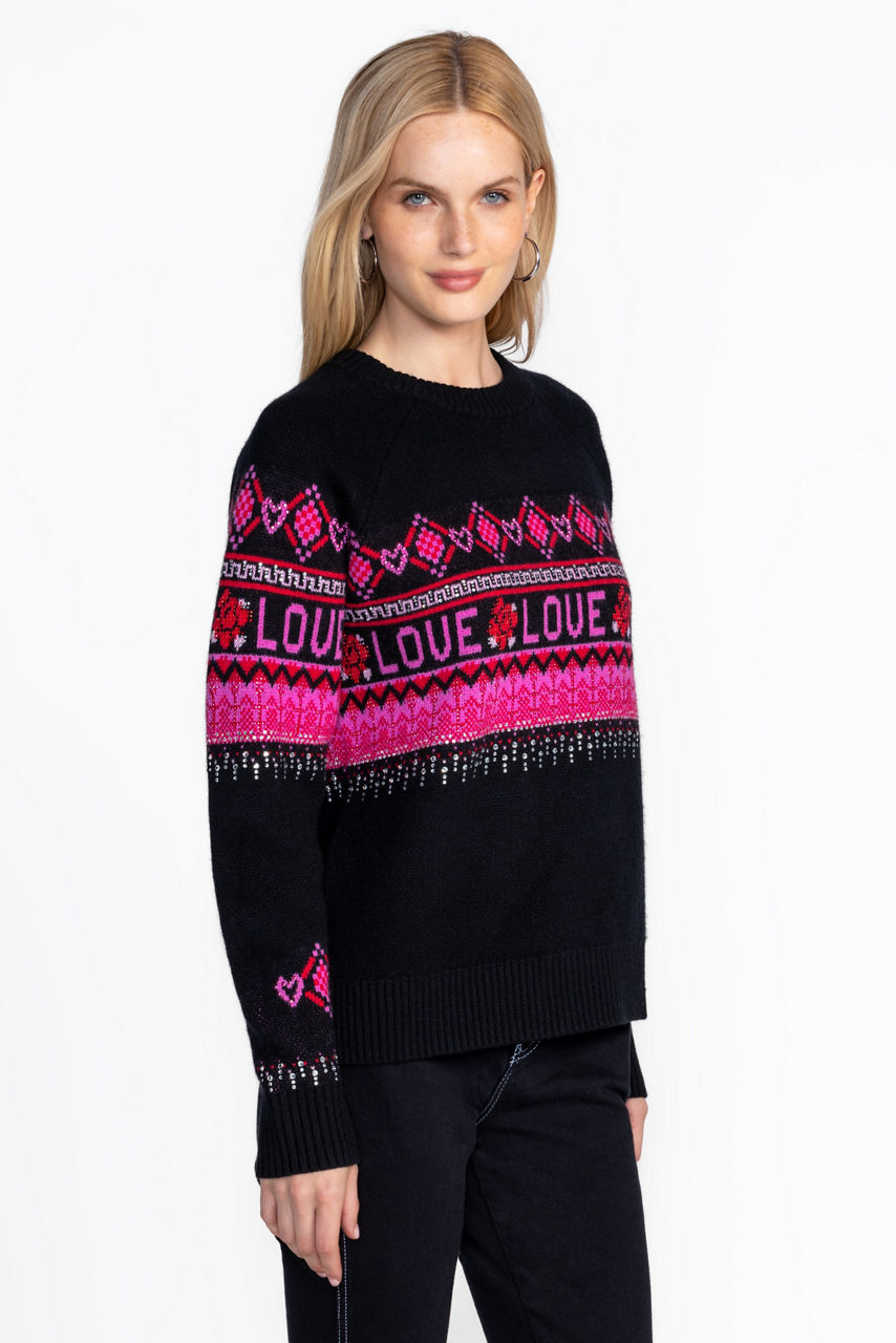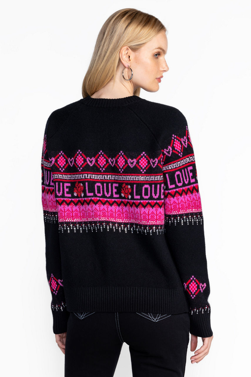 Expertly designed with a traditional Fairisle pattern, the Fairisle Pullover is crafted from a luxurious wool and cashmere blend. Embellished with whimsical detailing in bold red against an inky black backdrop, this vibrant pullover will keep you warm in the colder months. Pair with leggings and snow boots for a ski resort look.