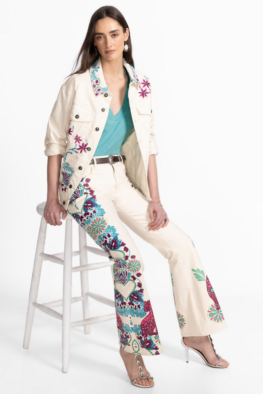 Crafted from a comfortable cotton blend with a hint of stretch, the Leilana Flare Jeans are vivacious and bold. Designed with a front fly closure and front and back pockets, these fun flare-leg jeans are adorned with a brilliant floral and animal motif. Pair them with a vibrant tee and the Leilana Classic Denim Jacket for a festive casual night out.