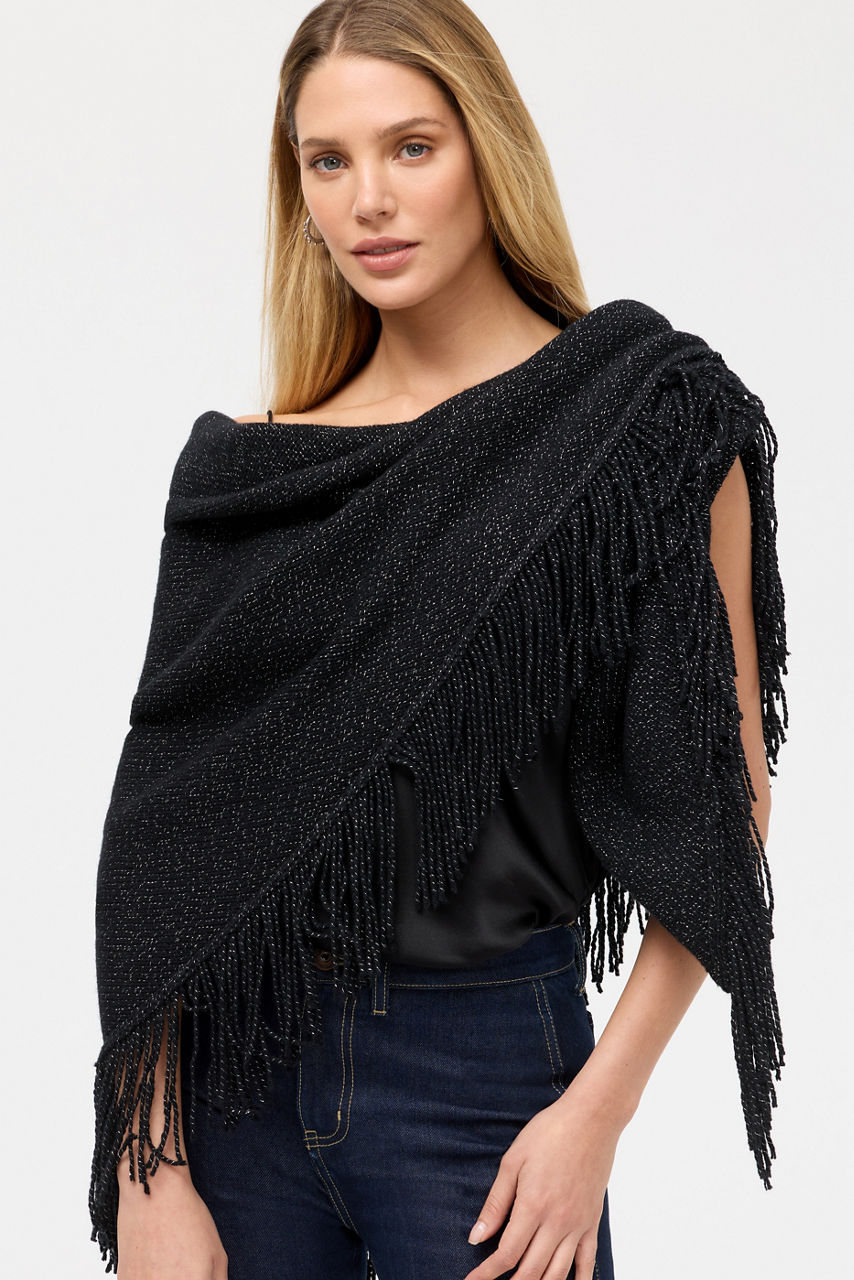 Crafted from a rich wool blend, the Fringe Scarf is equal parts elegant and timeless. Designed in classic black, this lovely scarf is accented with a hint of metallic glimmer and finished with a decorative fringe that moves as you move. Pair with an elegant evening look draped at the shoulders or wrapped over the arms for a polished finish.