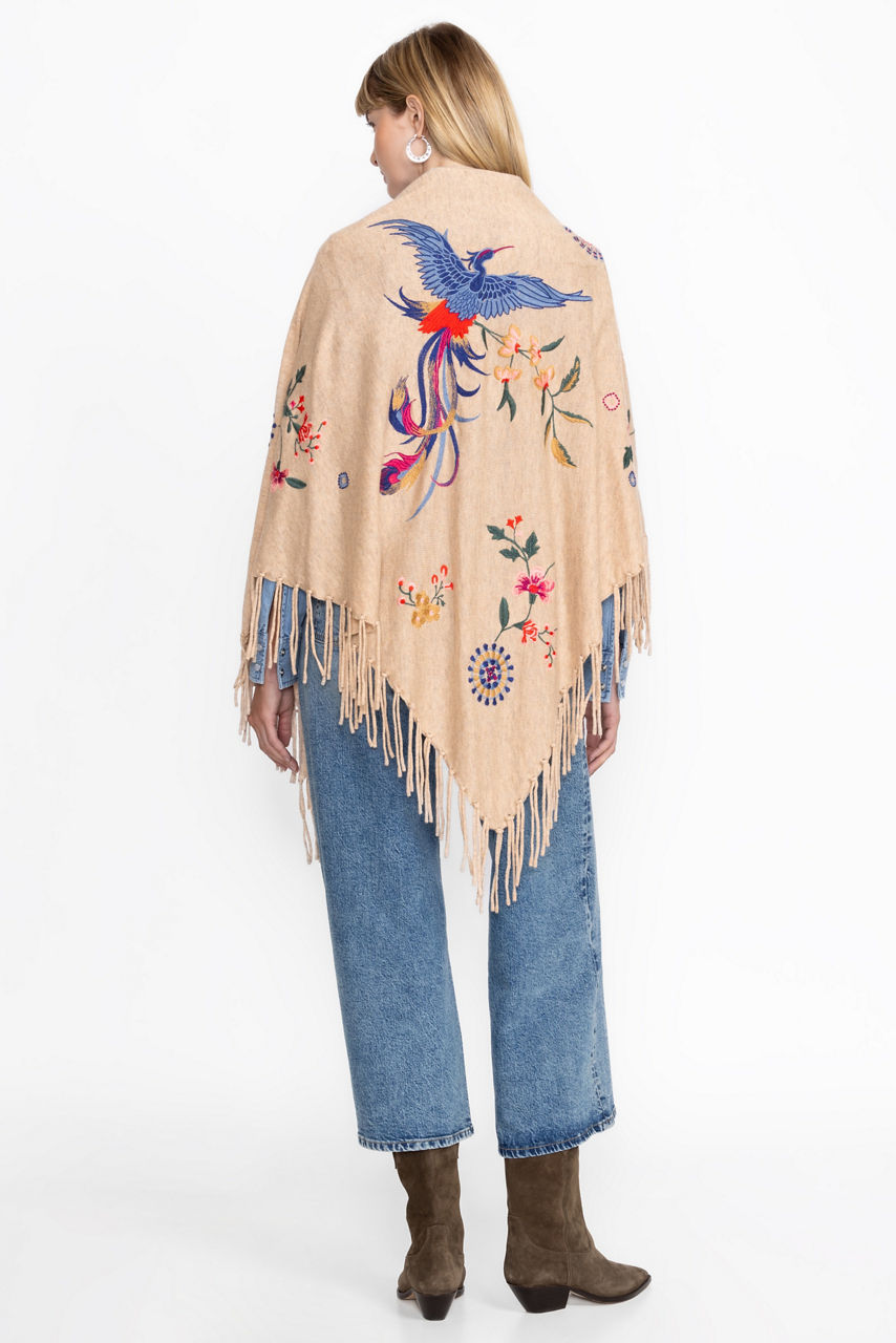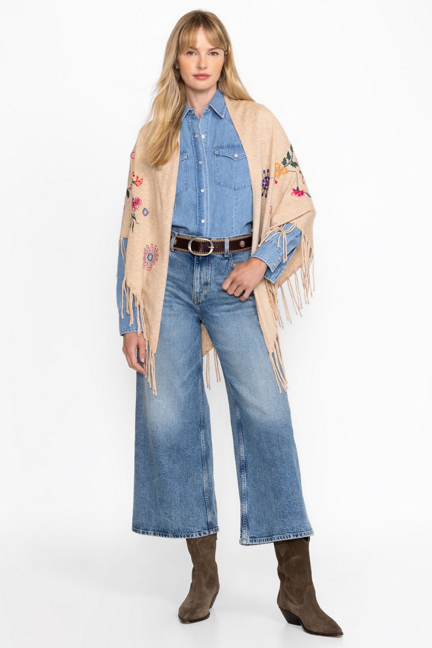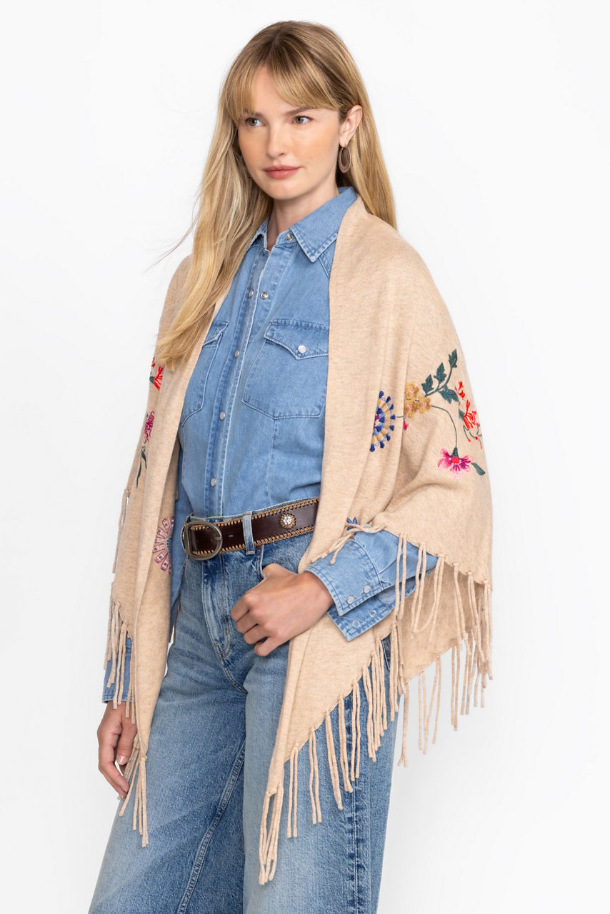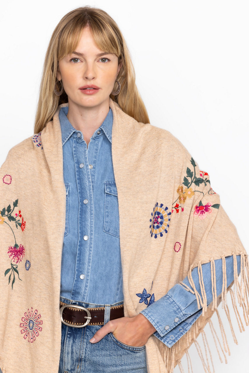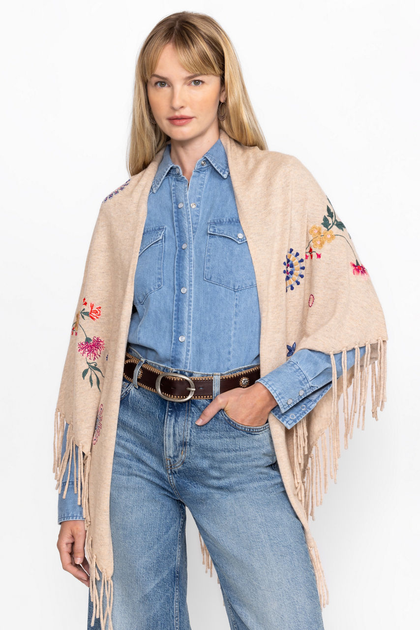 Crafted from a unique wool and cashmere blend, the Nikkola Fringe Shawl is a versatile cold-weather accessory. Featuring an easy drape silhouette embellished with intricate floral embroidery, this cozy shawl is finished with fringe detailing at the hemline. Layer over a classic button-down paired with bold pants for a chic evening look.