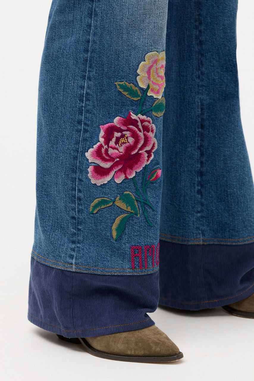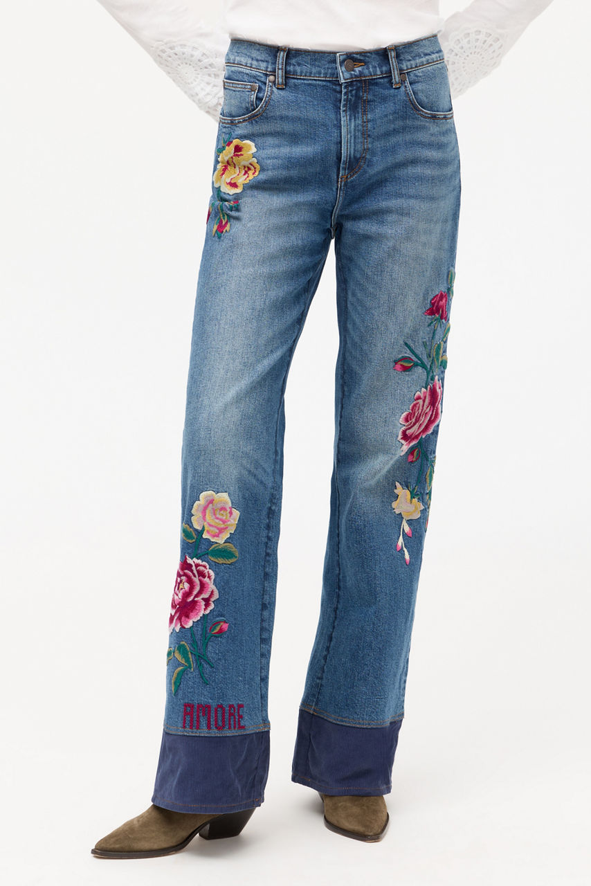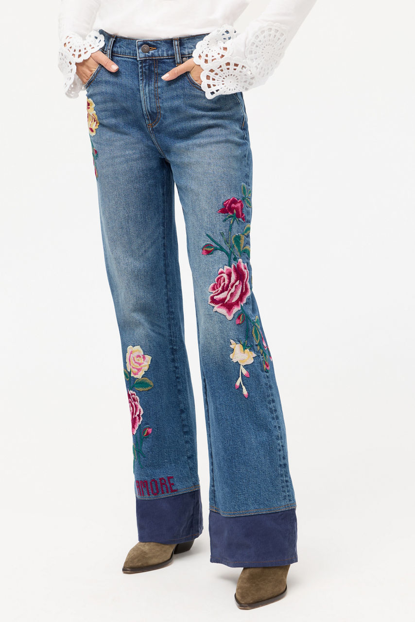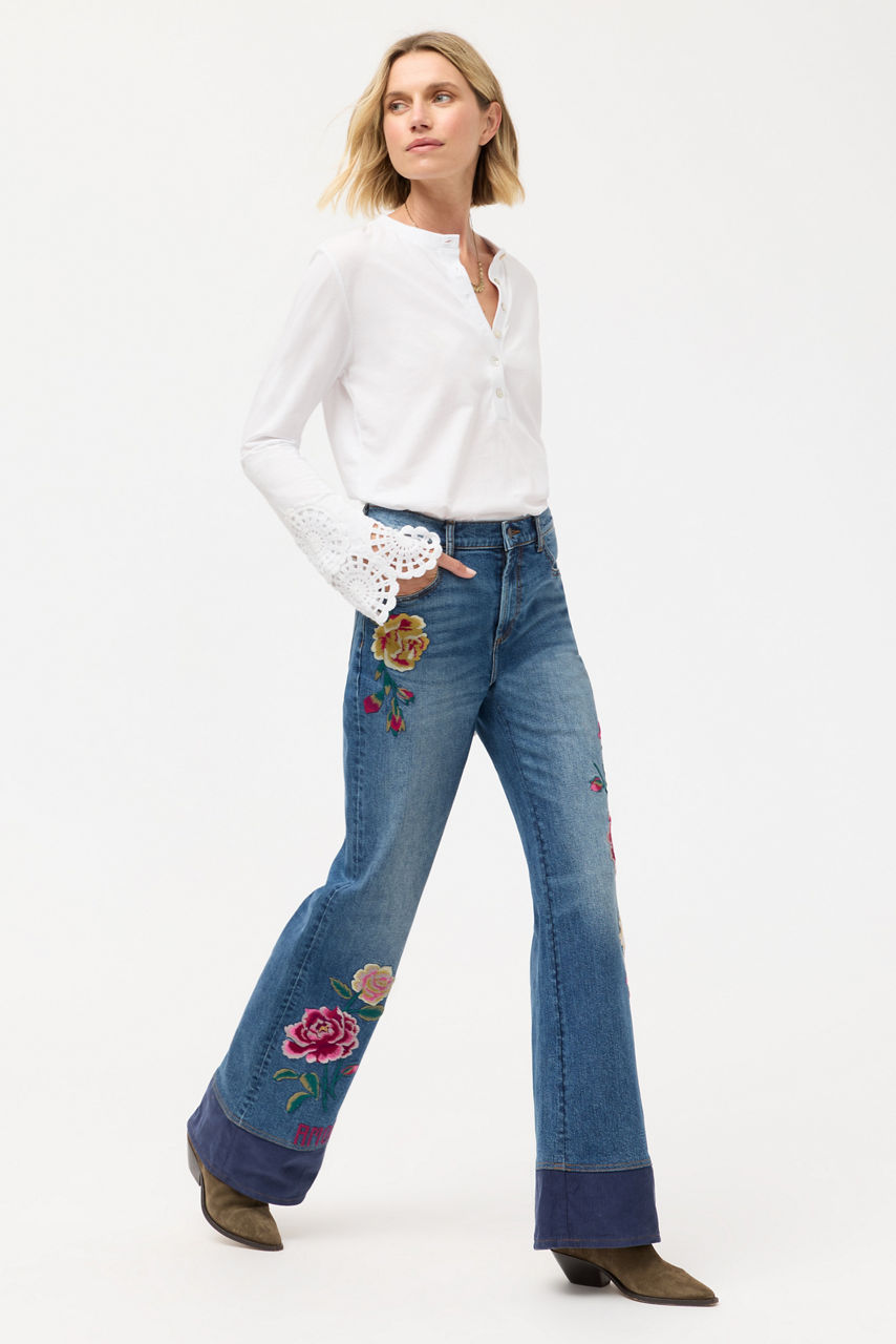 Crafted from a rich cotton blend with a hint of stretch, the Rosilla High Rise Wide Leg Jeans are embellished with vibrant floral embroidered blooms. Designed with a zippered fly closure and wide legs, these high-rise jeans are offered in a vintage aged wash. Pair with a colorful silk blouse and coordinating flats for an evening out with friends.