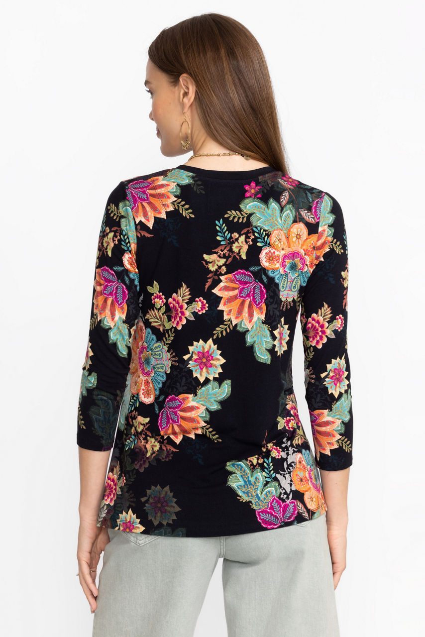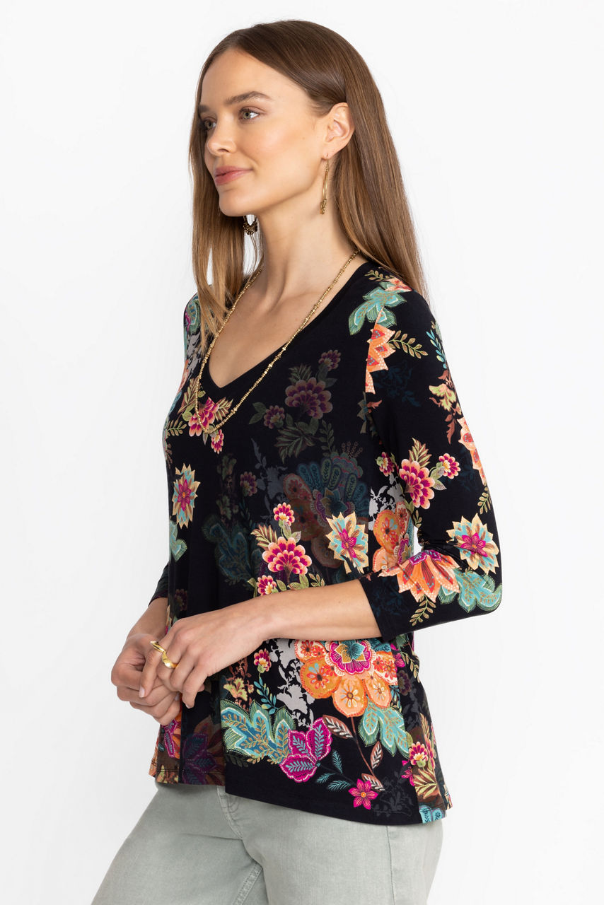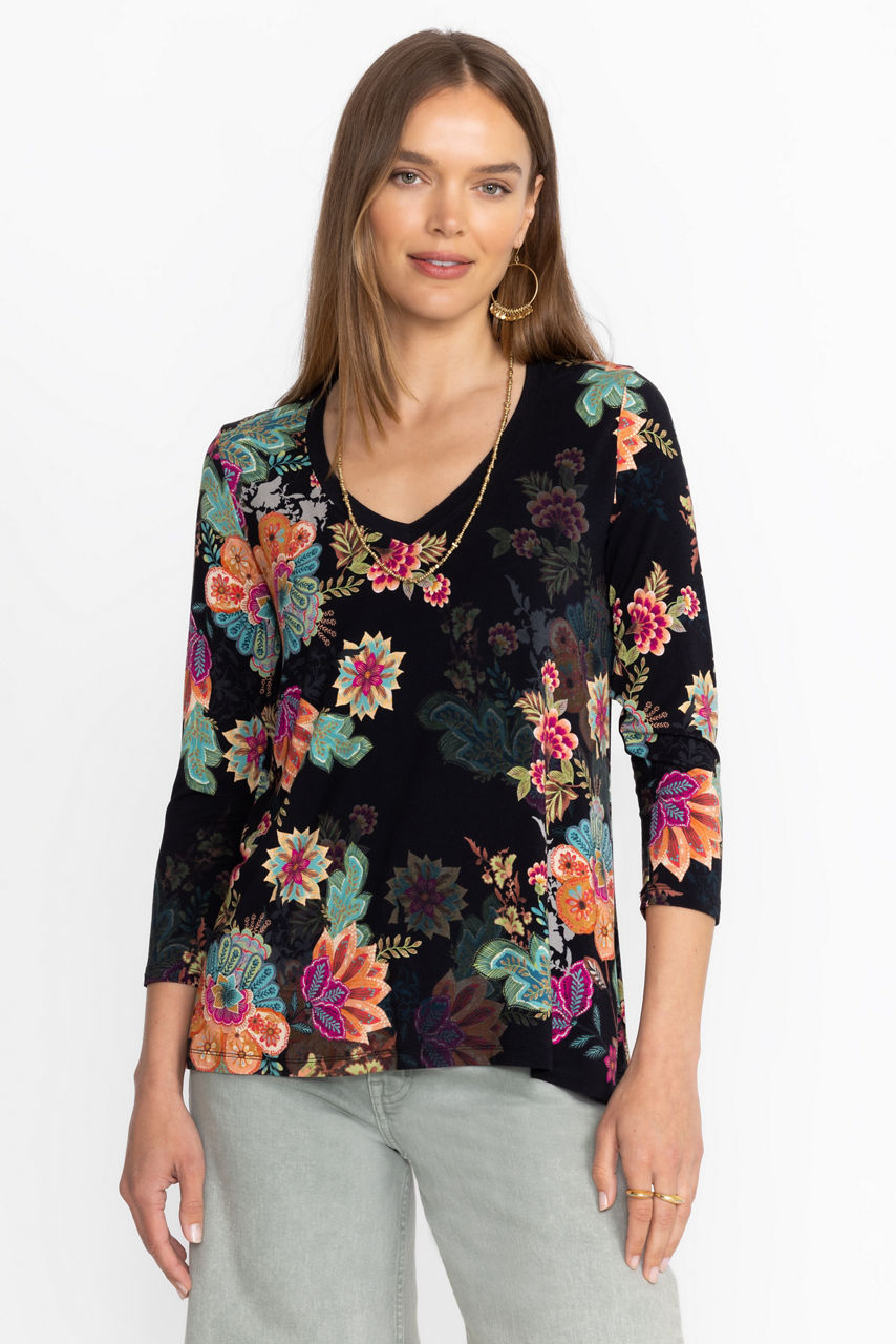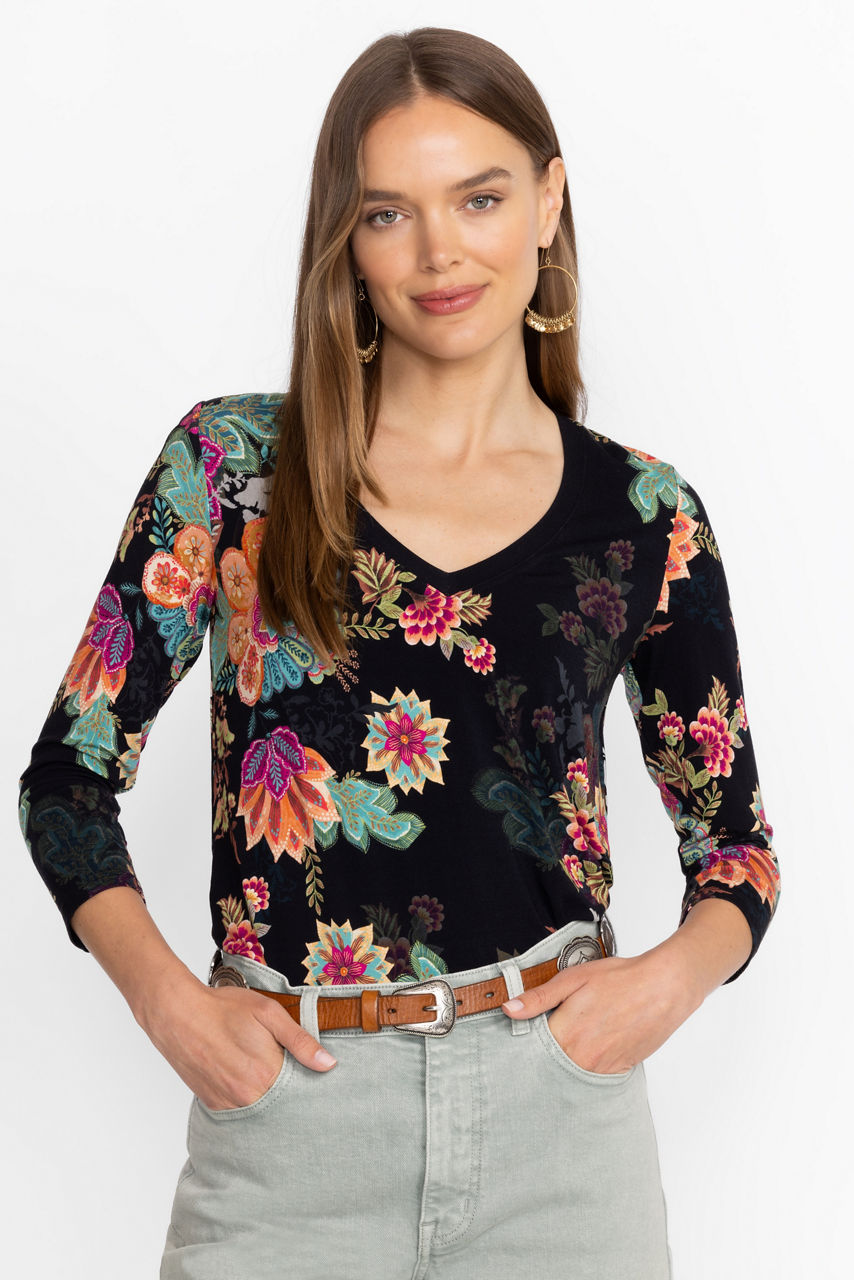 Crafted from a soft lightweight material with a hint of stretch, the Janie Favorite 3/4 Sleeve V-Neck Tee is a basic wardrobe necessity. Featuring a V-neckline and 3/4 sleeves, this relaxed-fit tee is finished with an eye-catching pattern. Pair with a denim skirt and casual sandals for an easy weekend look.